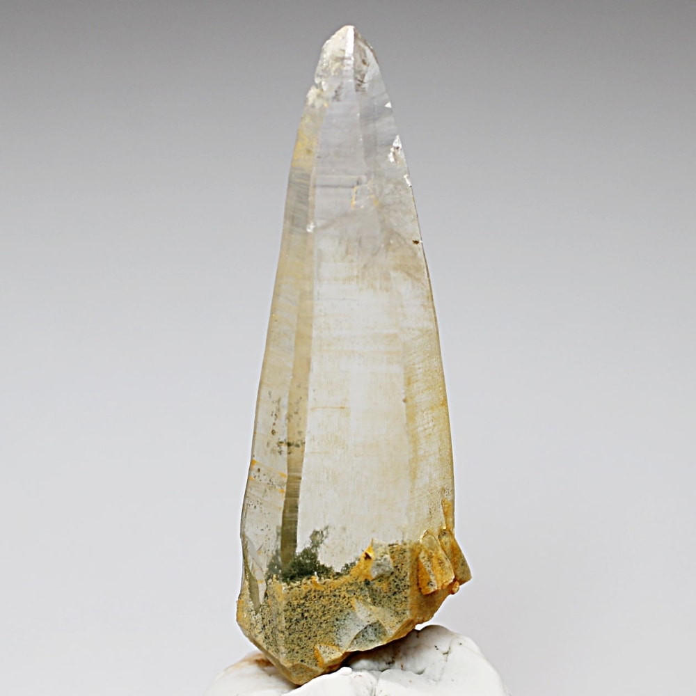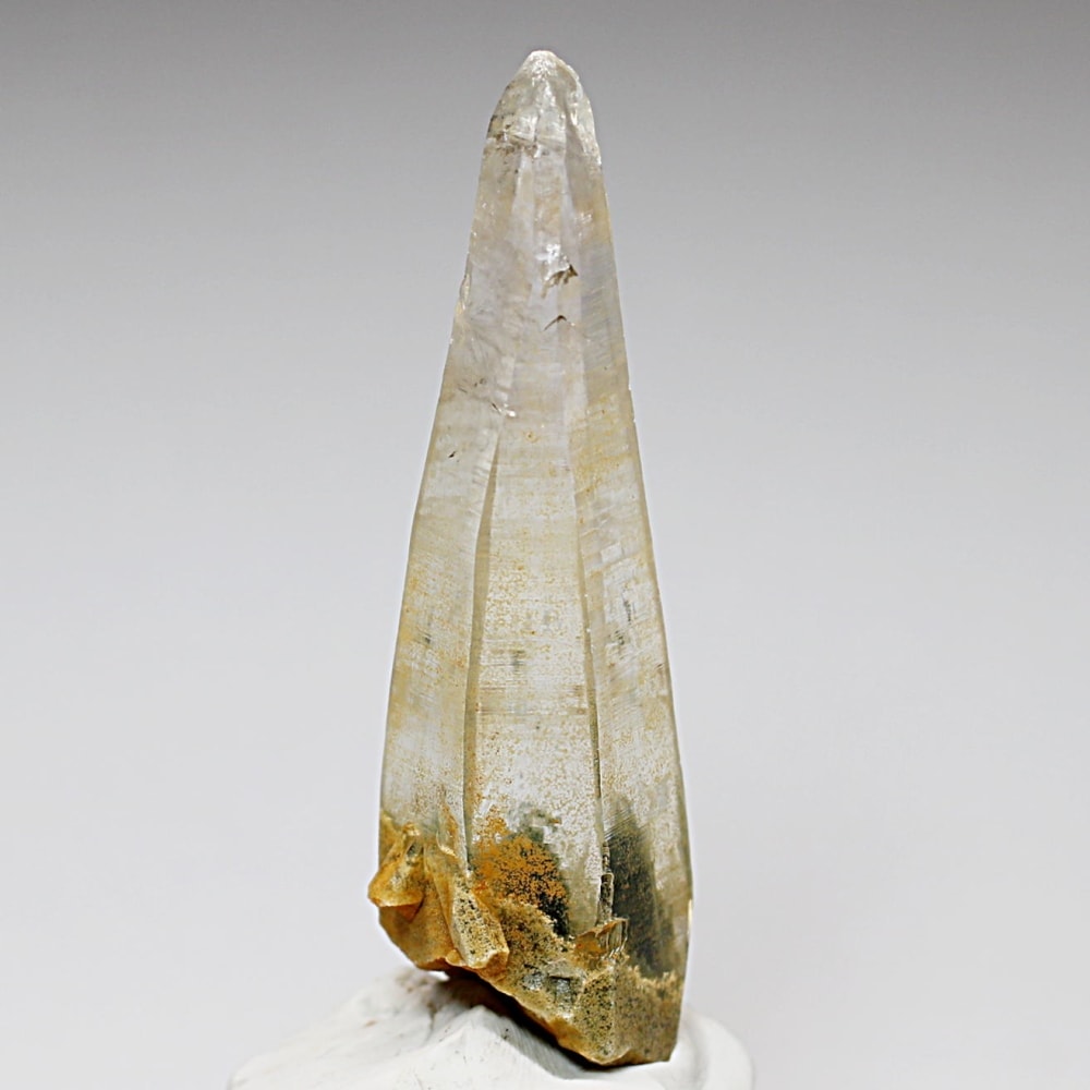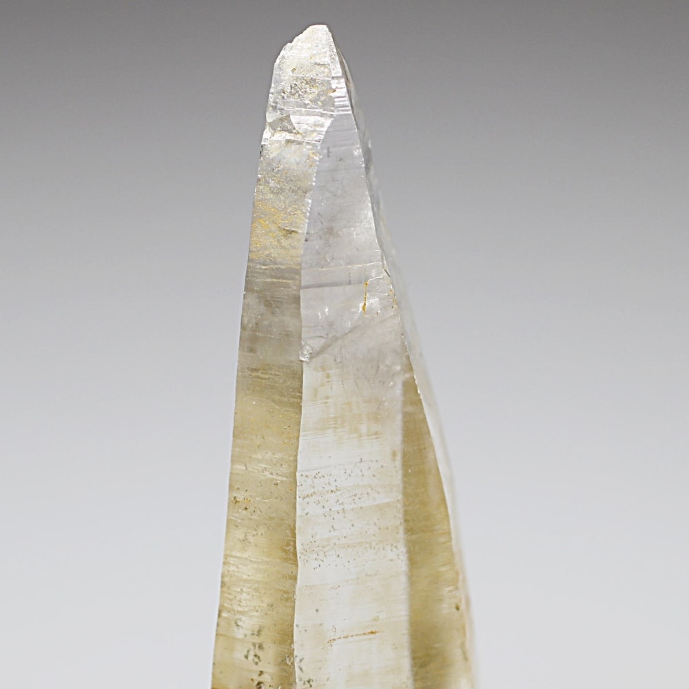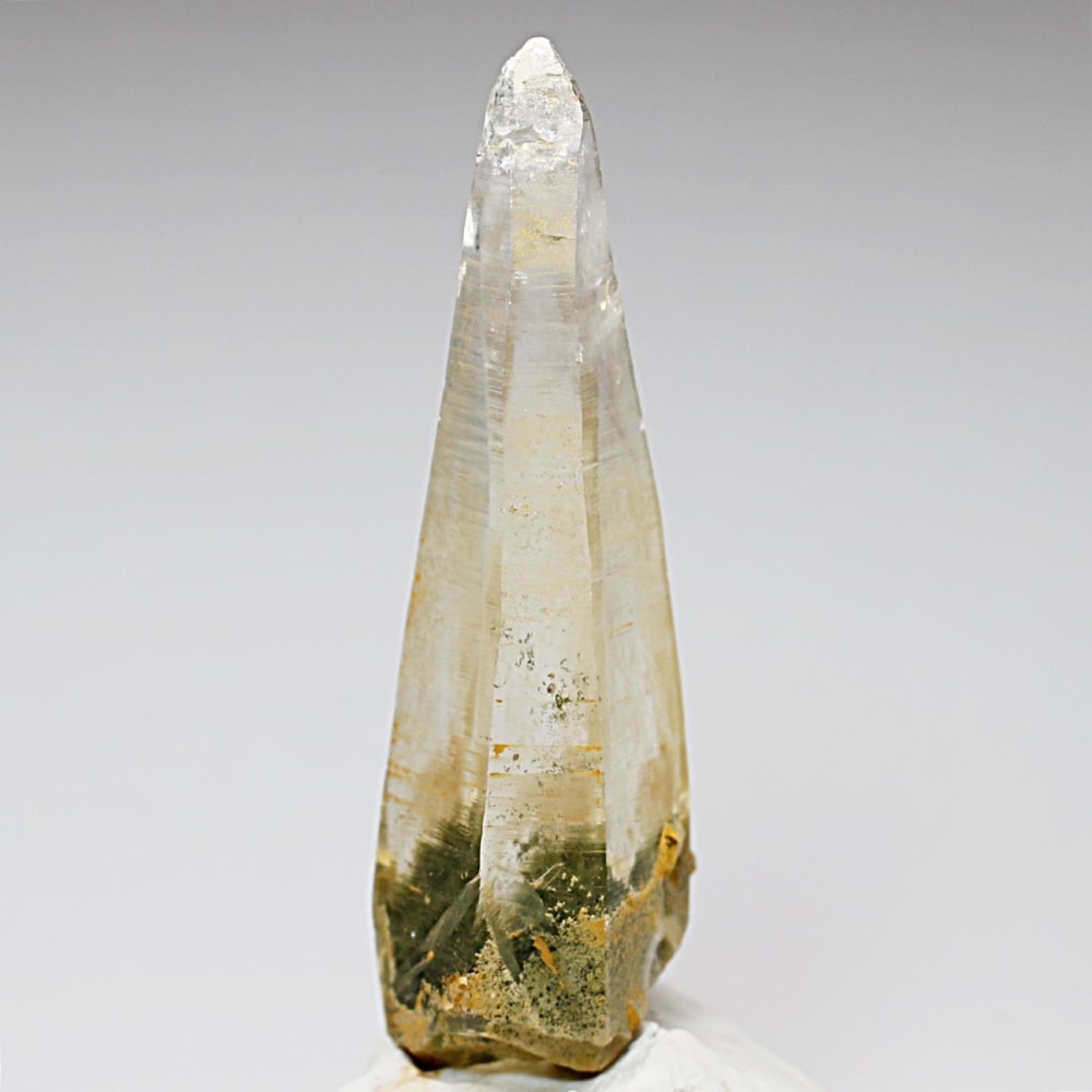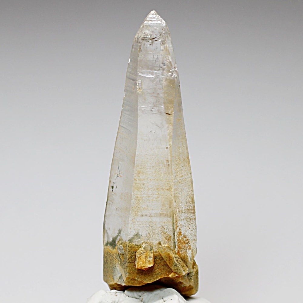 ガネッシュヒマール産ヒマラヤ水晶と言えば緑色のクローライトに覆われた先細りの結晶が印象的ですが、こちらのヒンドゥン地区で採掘されたヒマラヤ水晶は主にリモナイトの影響を受けてイエローとなった魅力的な個性を備えています。