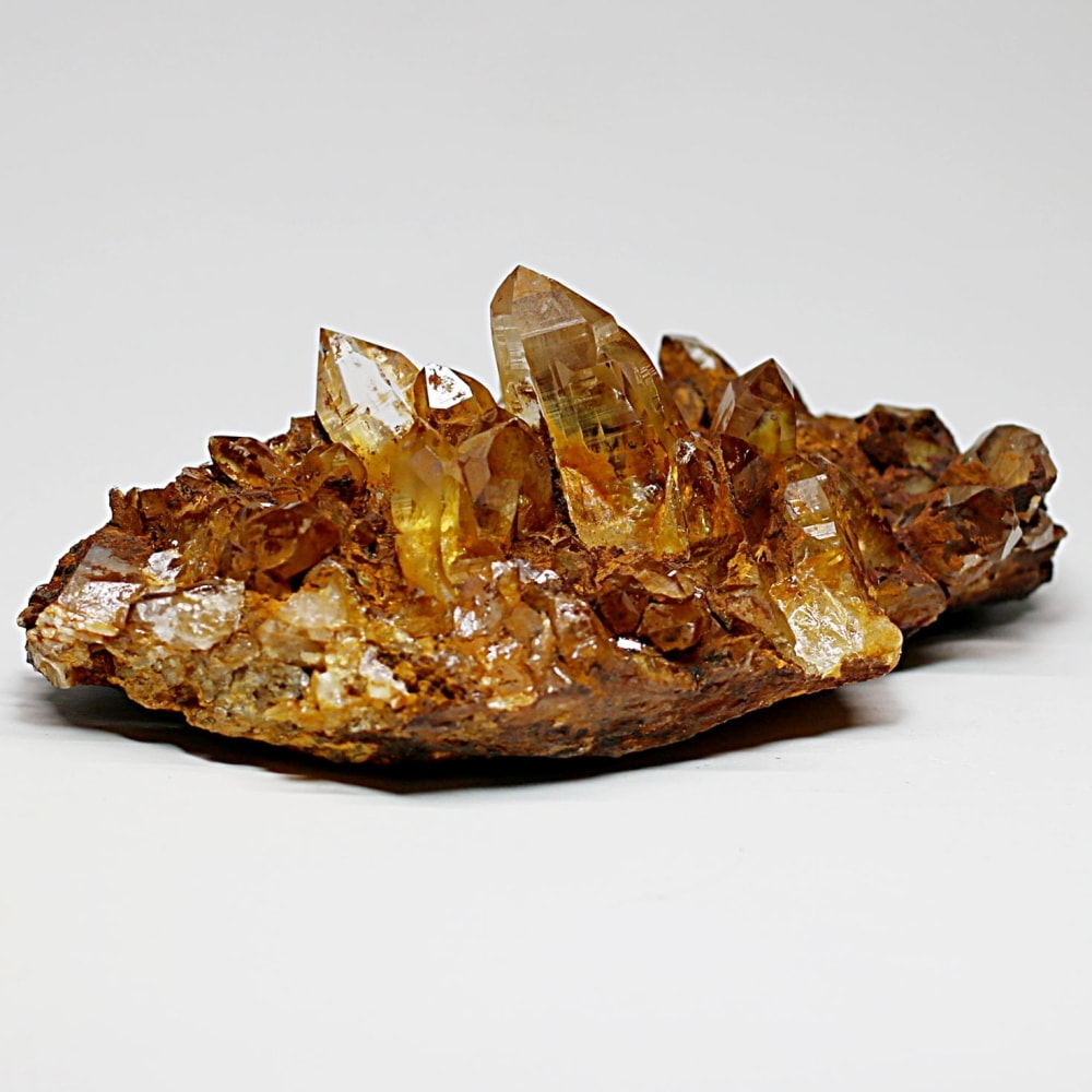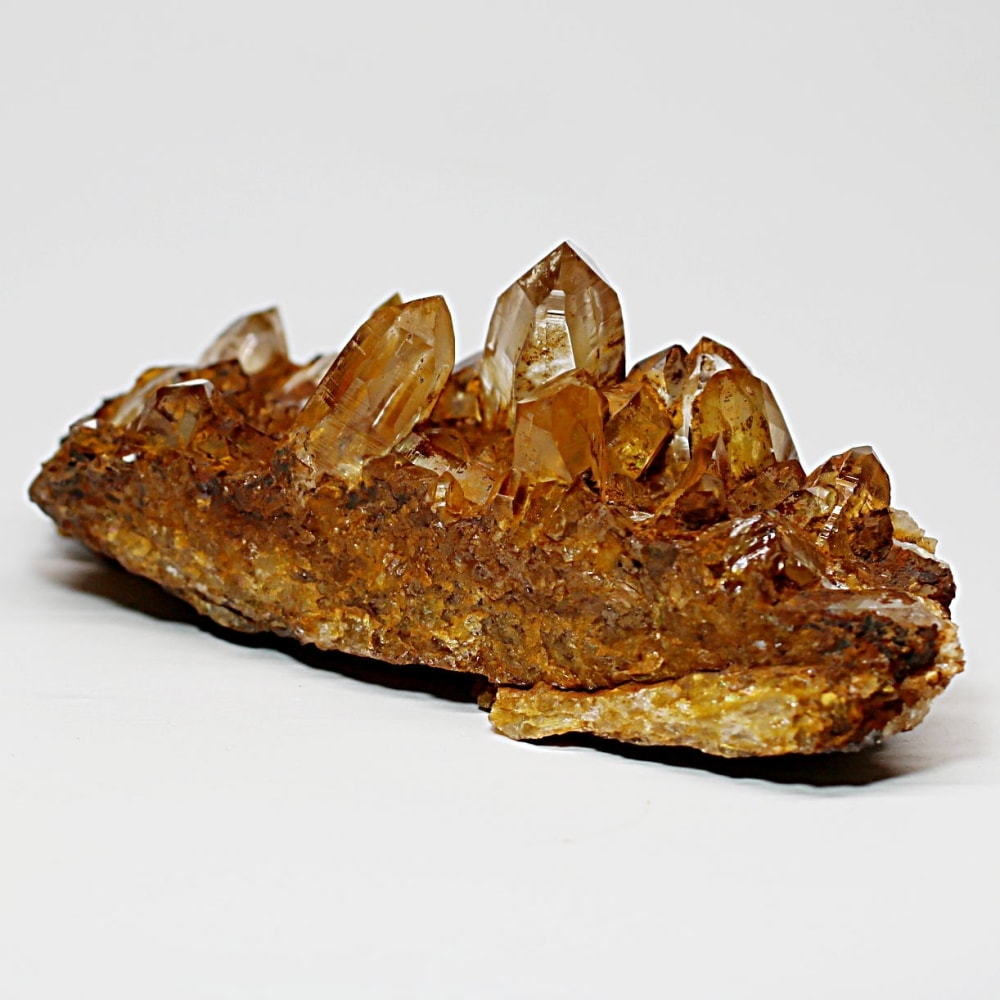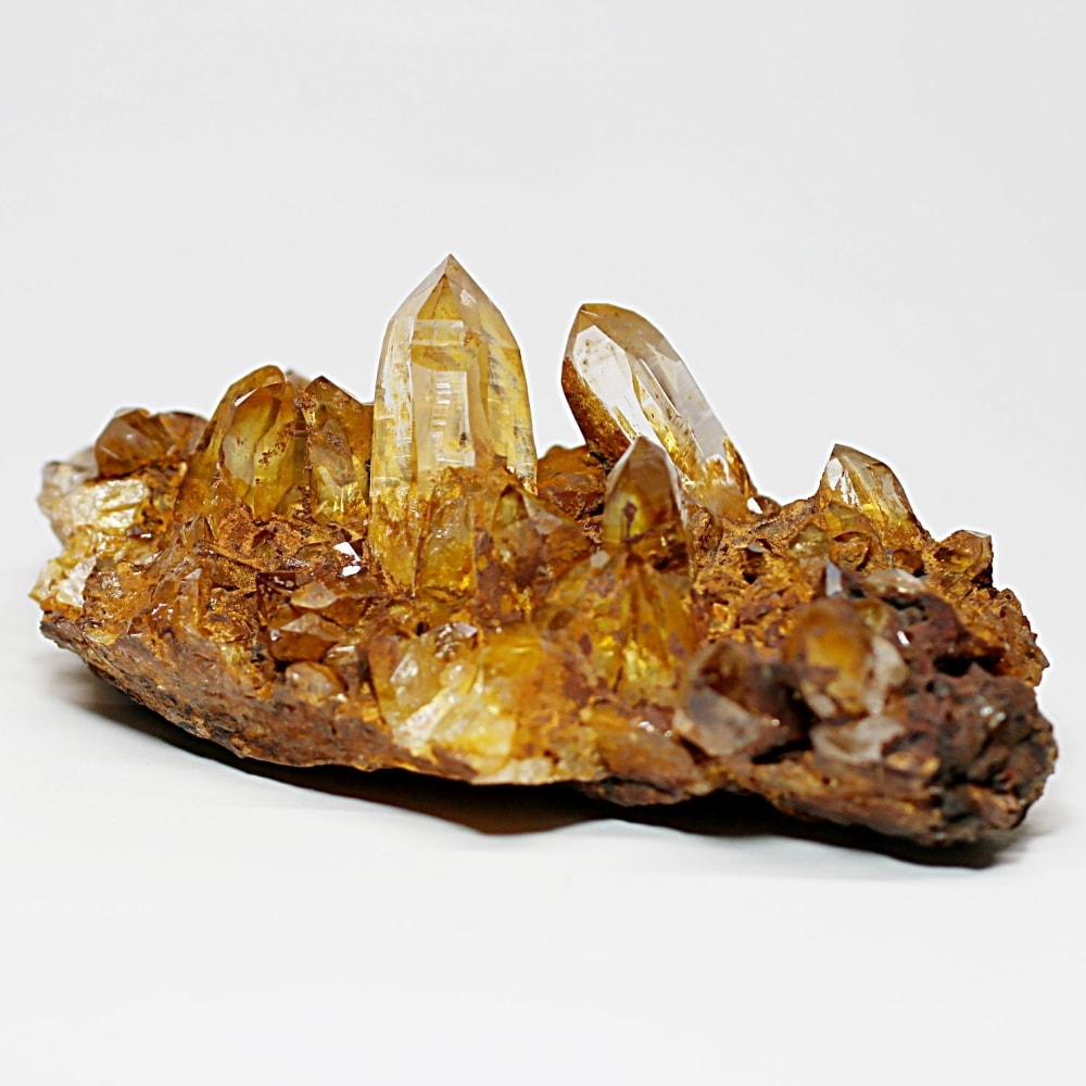 ガネッシュヒマール産ヒマラヤ水晶と言えば緑色のクローライトに覆われた先細りの結晶が印象的ですが、こちらのヒンドゥン地区で採掘されたヒマラヤ水晶は主にリモナイトの影響を受けて、“イエローゴールドに輝くヒマラヤ水晶” となっております。