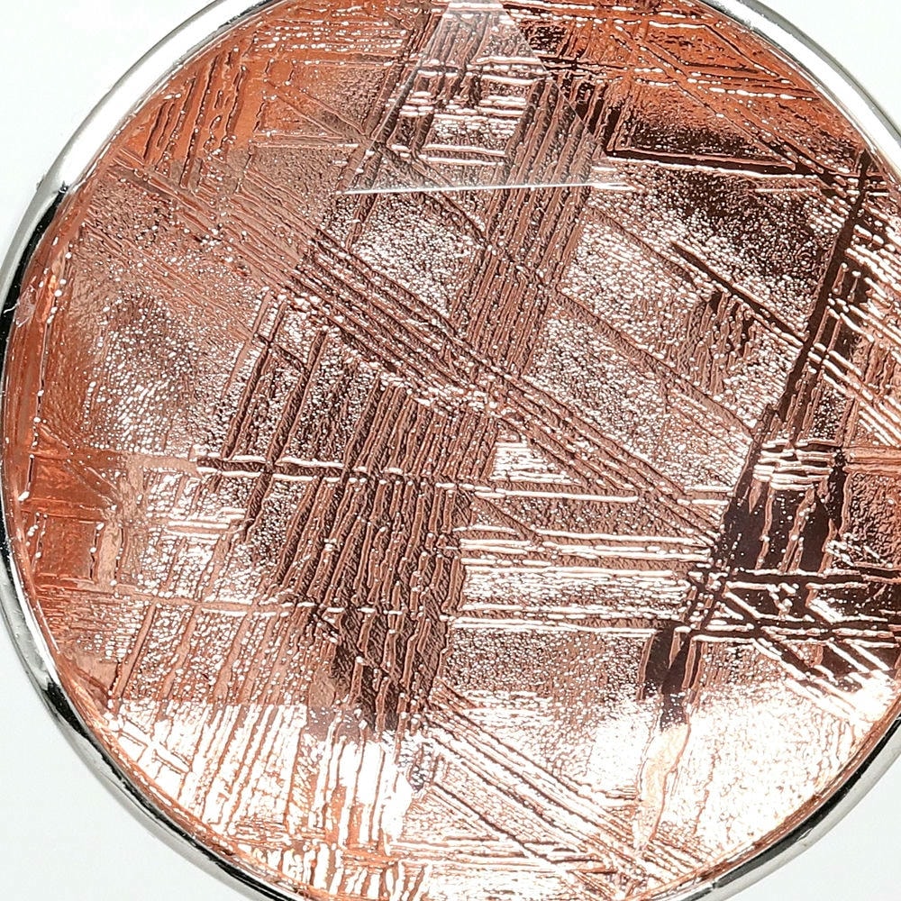 現在流通しているナミビアで採れた原石からしか入手できないギベオン隕石には、ウィドマンシュテッテン構造という金属組織を持っており、酸処理することで現れる美しい幾何学模様をご覧になれます。