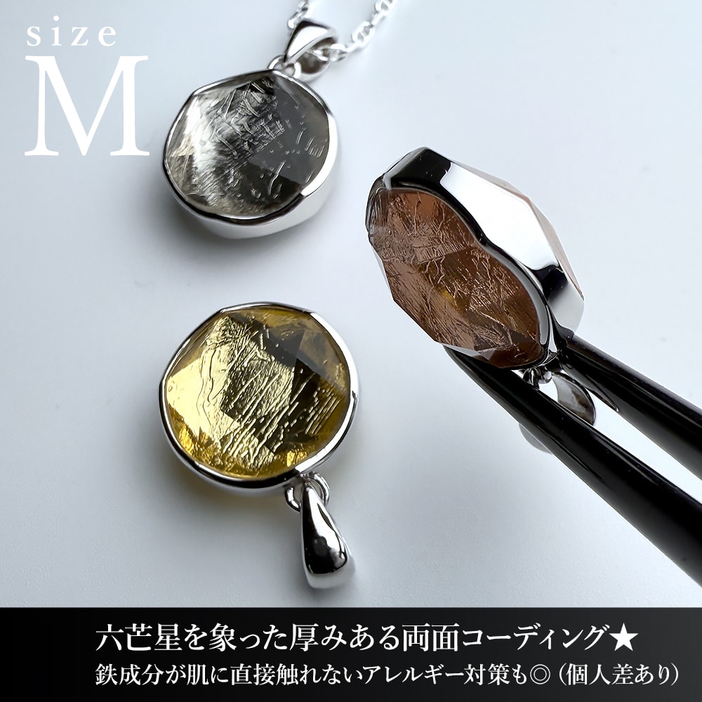 ギベオン隕石に、六芒星を象った両面コーティングを施すことでキラキラと輝く美しいペンダントトップに仕上げました。