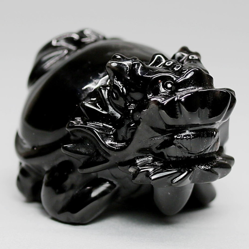強力な邪気払いや魔除けの石として常に注目される山東省産モリオン(黒水晶)を「龍亀/ロングイ」に彫刻した置物でございます。