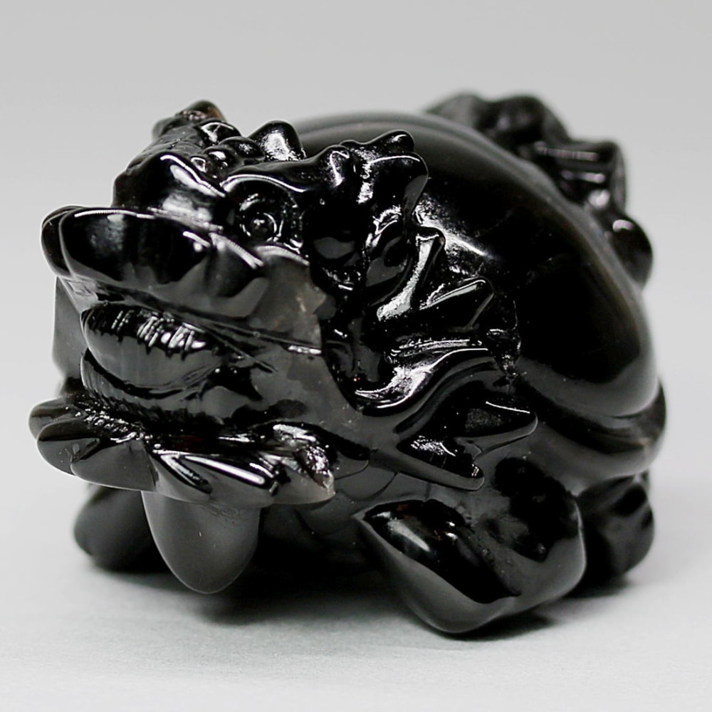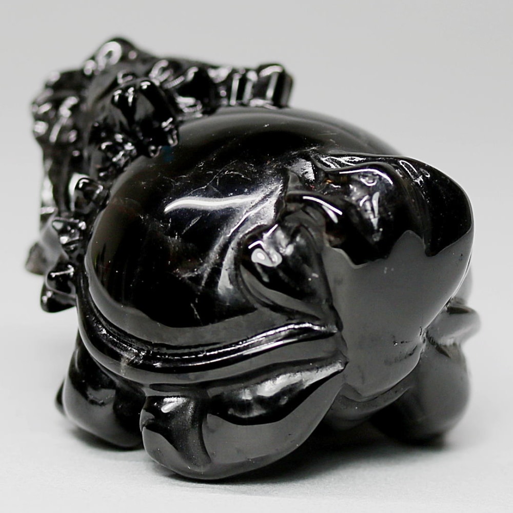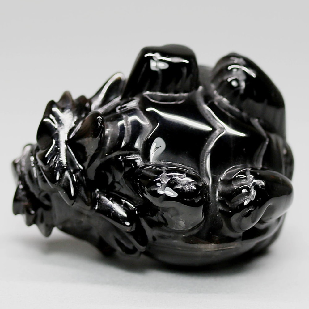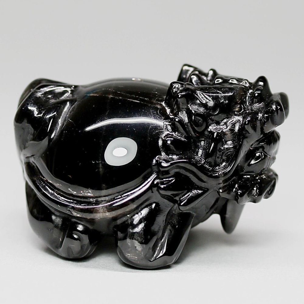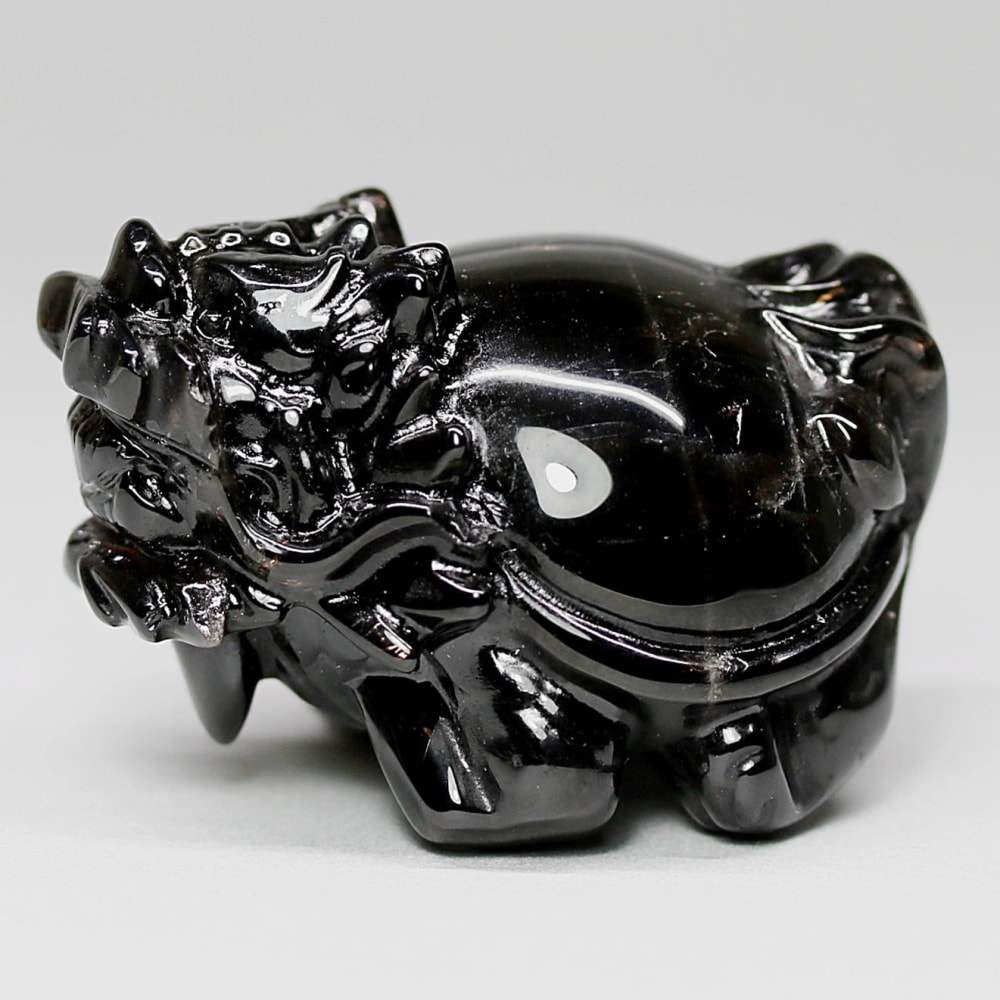 強力な邪気払いや魔除けの石として常に注目される山東省産モリオン(黒水晶)を「龍亀/ロングイ」に彫刻した置物でございます。