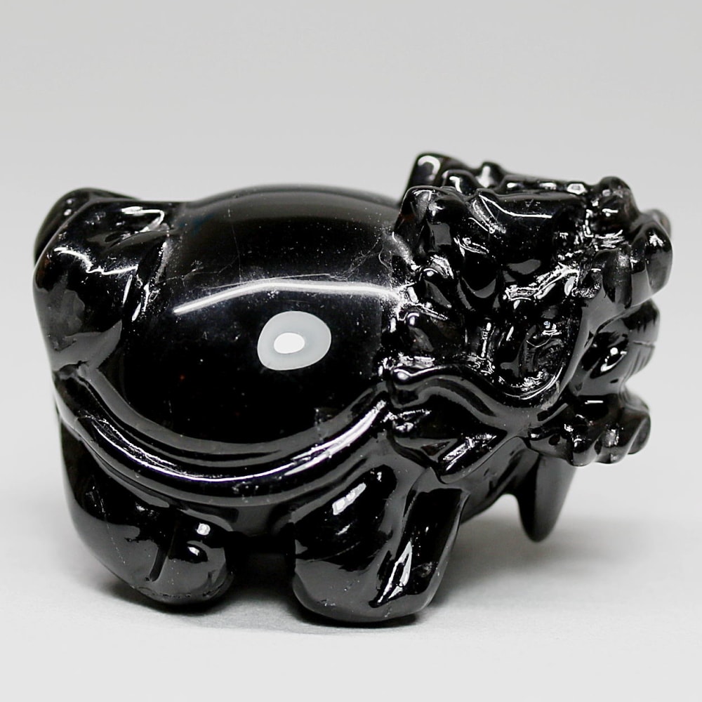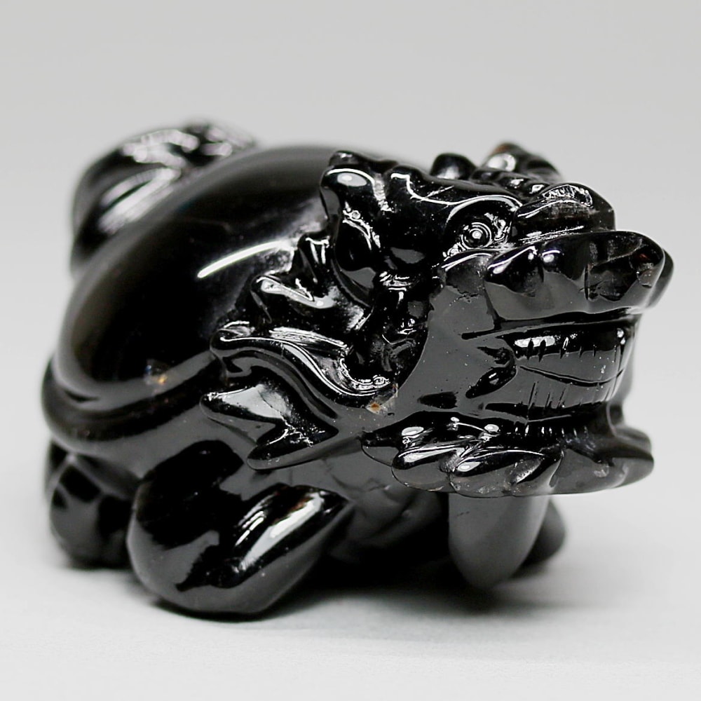 強力な邪気払いや魔除けの石として常に注目される山東省産モリオン(黒水晶)を「龍亀/ロングイ」に彫刻した置物でございます。
