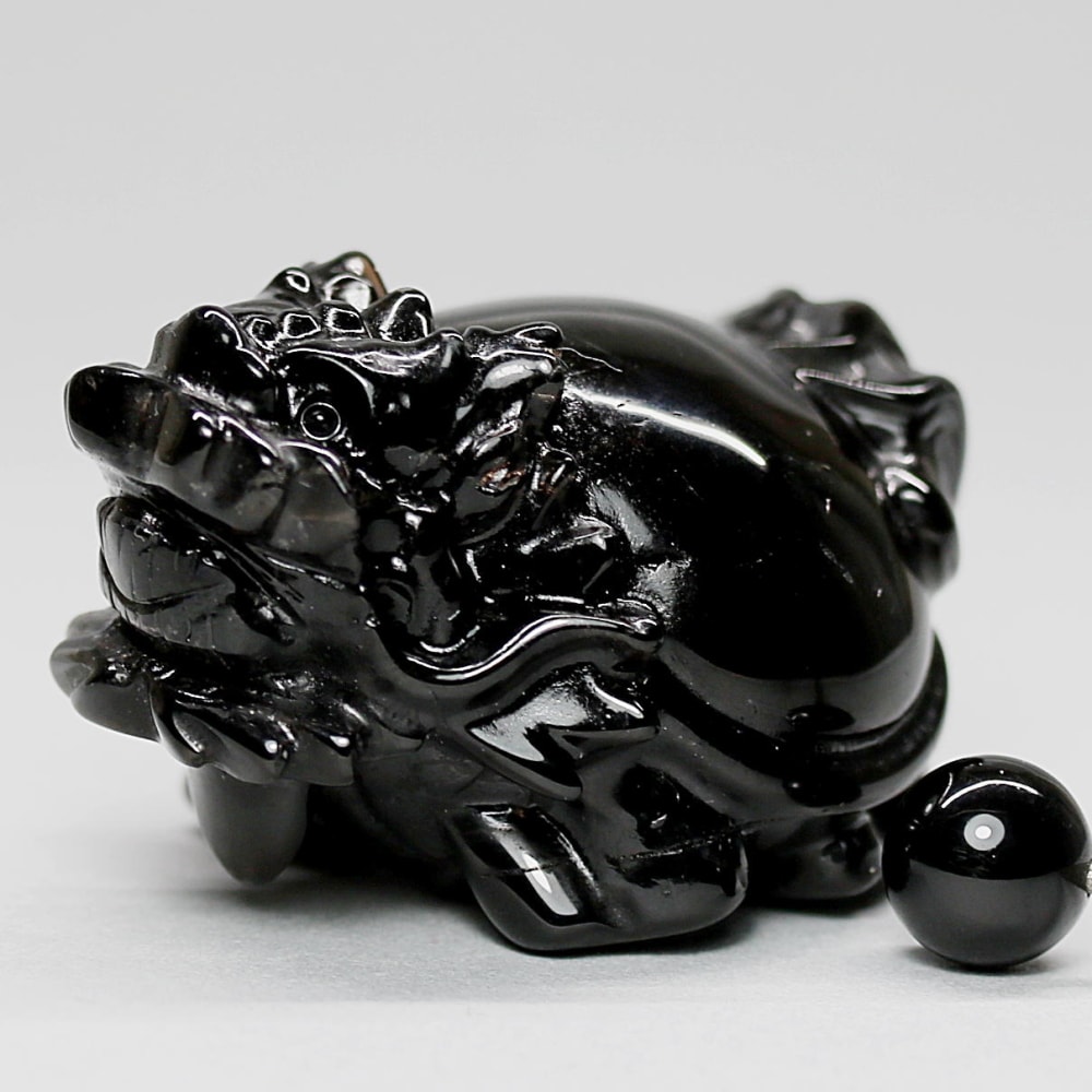 強力な邪気払いや魔除けの石として常に注目される山東省産モリオン(黒水晶)を「龍亀/ロングイ」に彫刻した置物でございます。