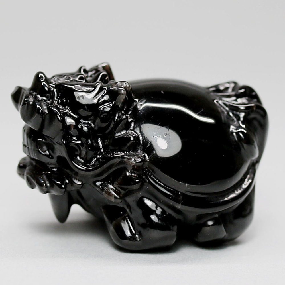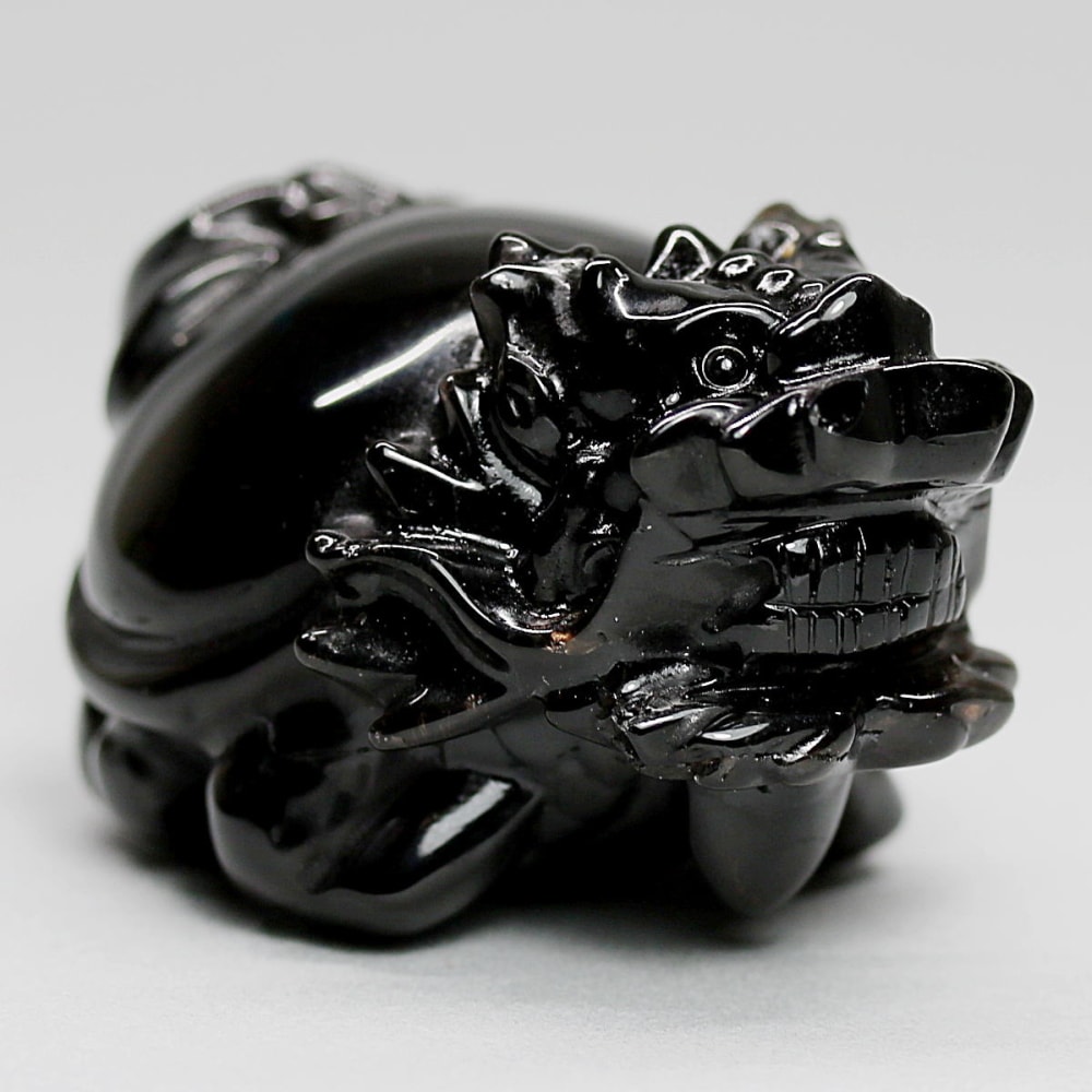 強力な邪気払いや魔除けの石として常に注目される山東省産モリオン(黒水晶)を「龍亀/ロングイ」に彫刻した置物でございます。