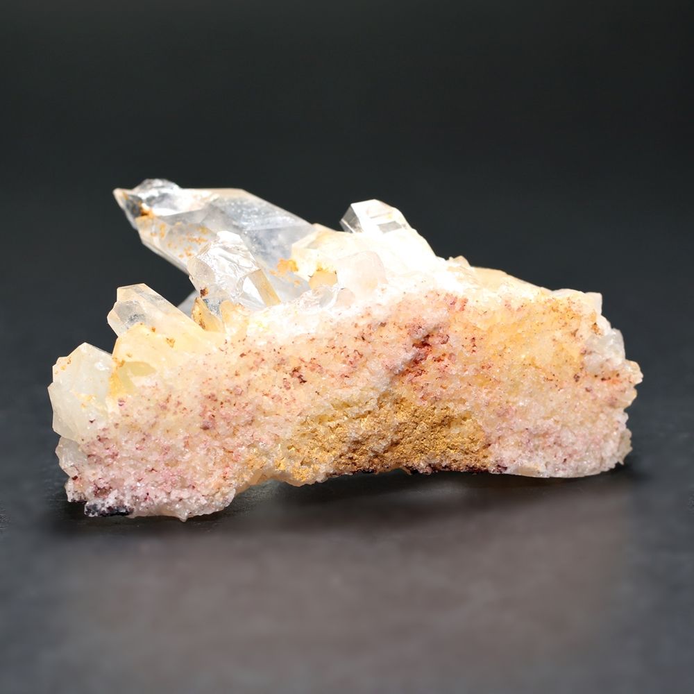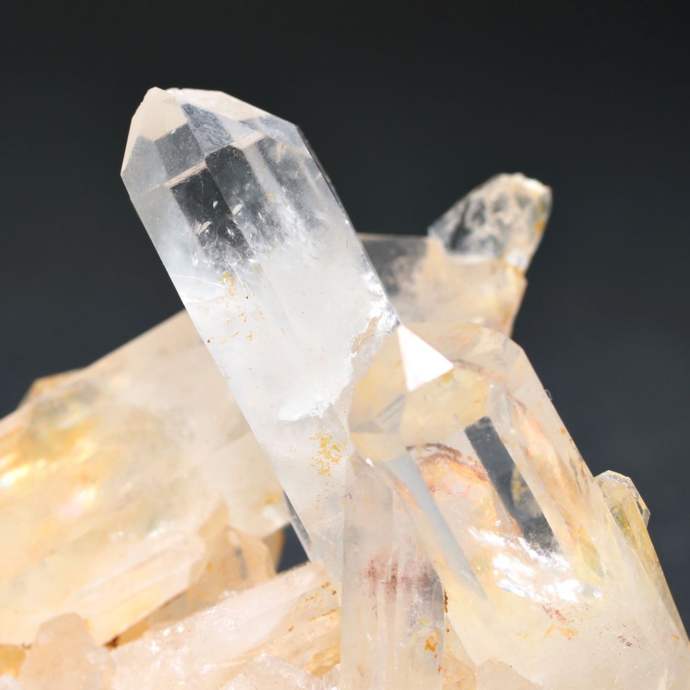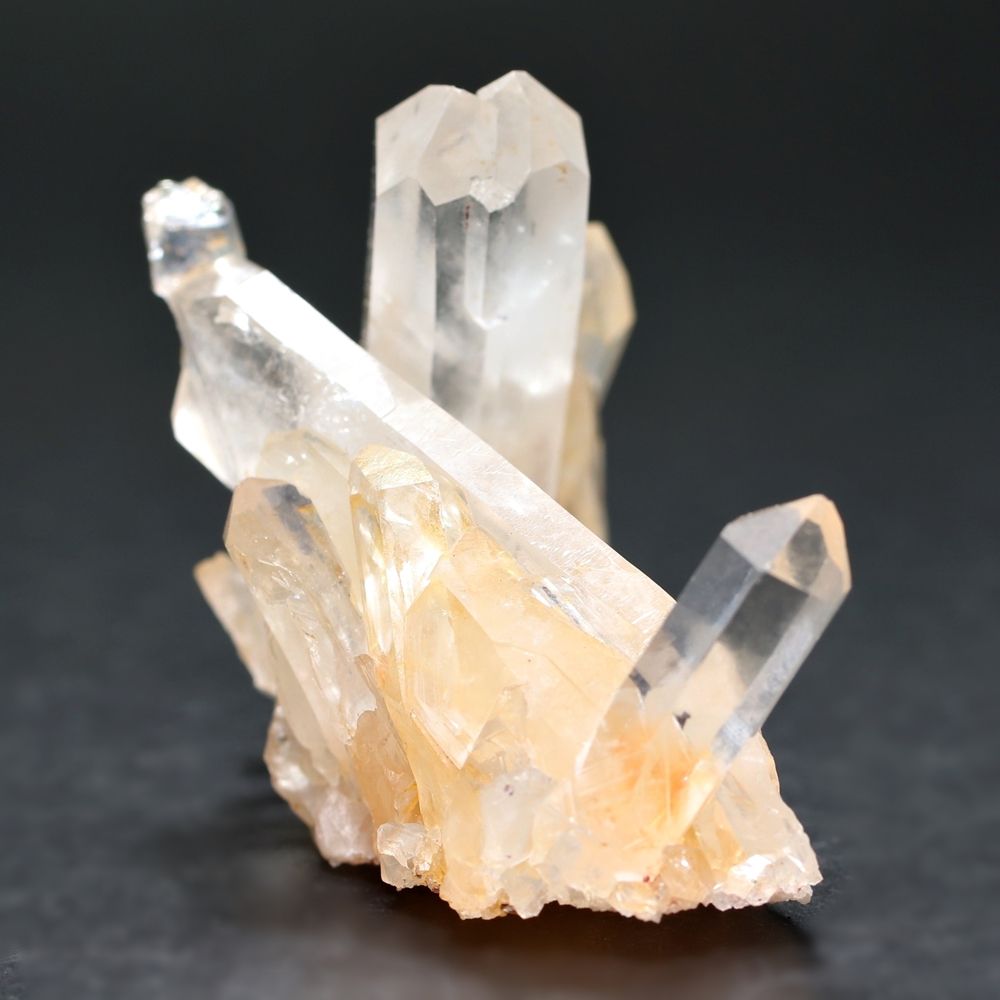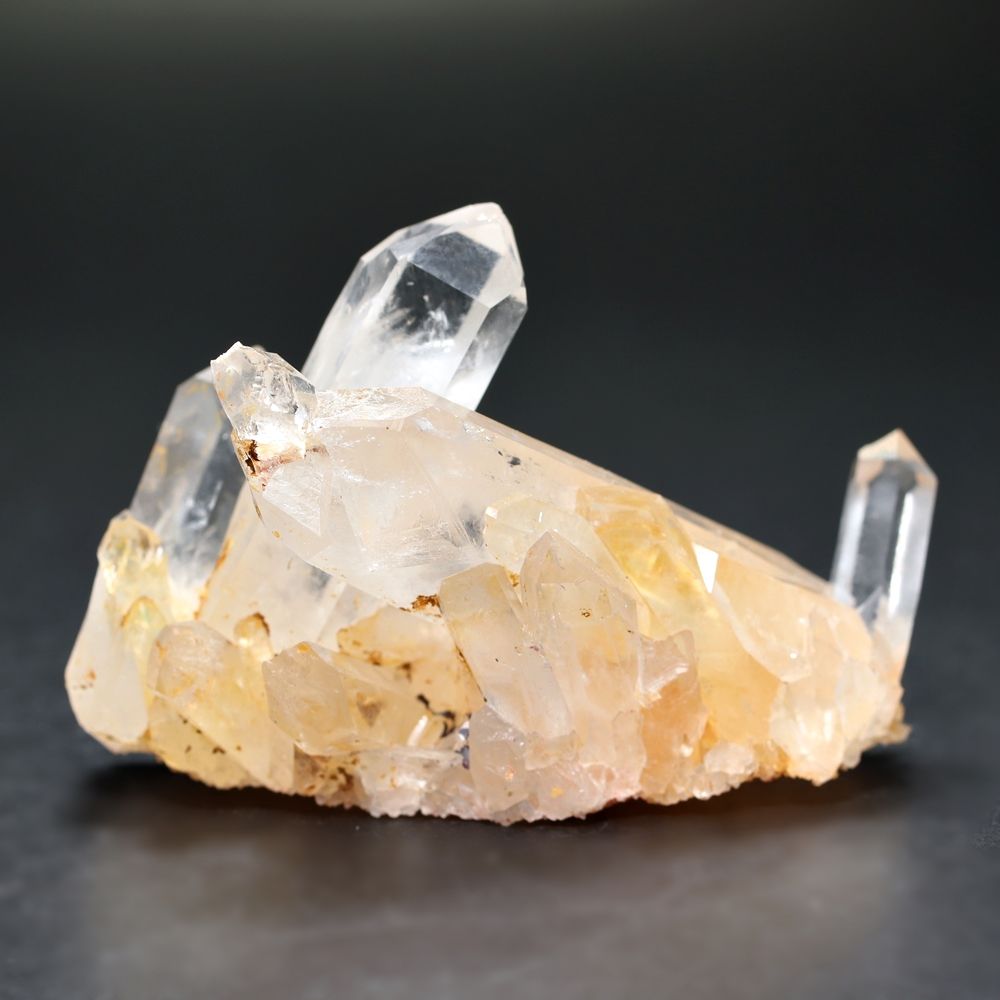 ご覧のお品は、結晶表面にリモナイトが付着するイエローカラーの水晶クラスターです。 マダガスカル水晶において、このように透明度を保っているクオリティも秀逸です!