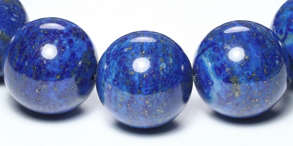 ラピスラズリはパイライトや別鉱物が大量に内包されたものもよく流通しておりますが、品質の面ではパイライトが少なめで、ブルーが強い色ムラ少ないラピスラズリが良質とされています。