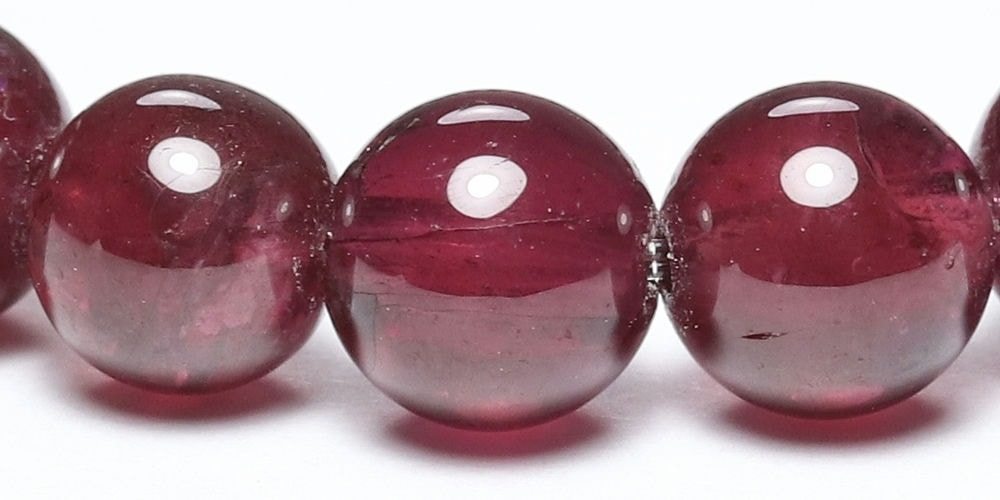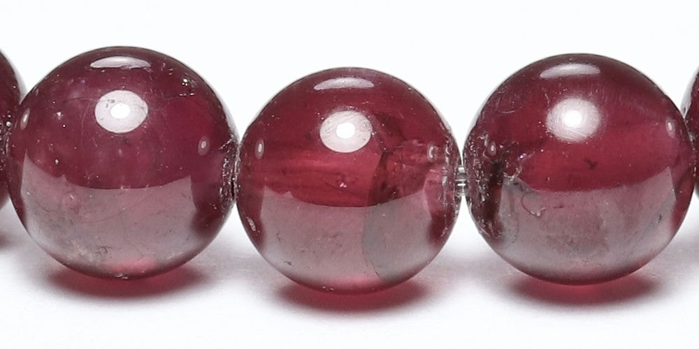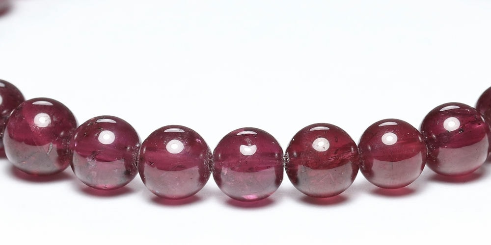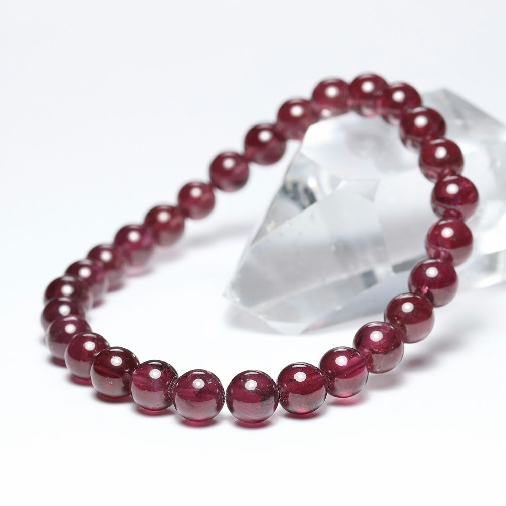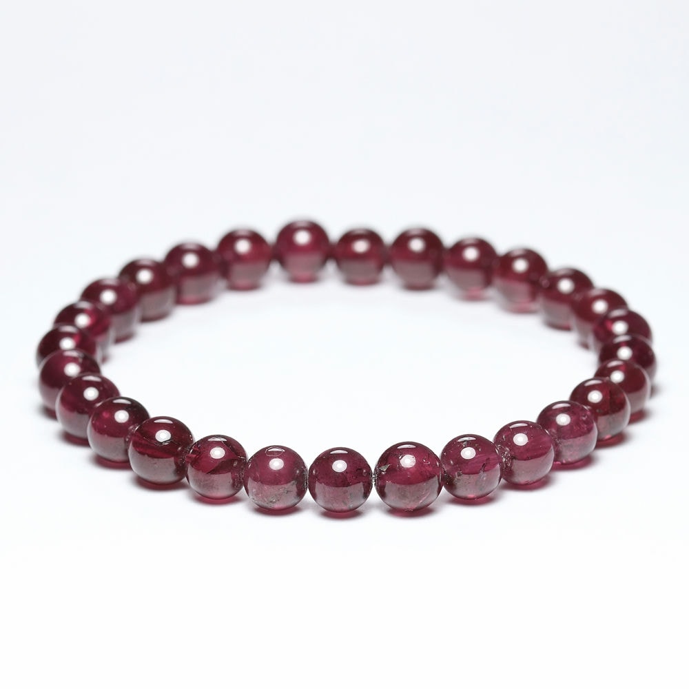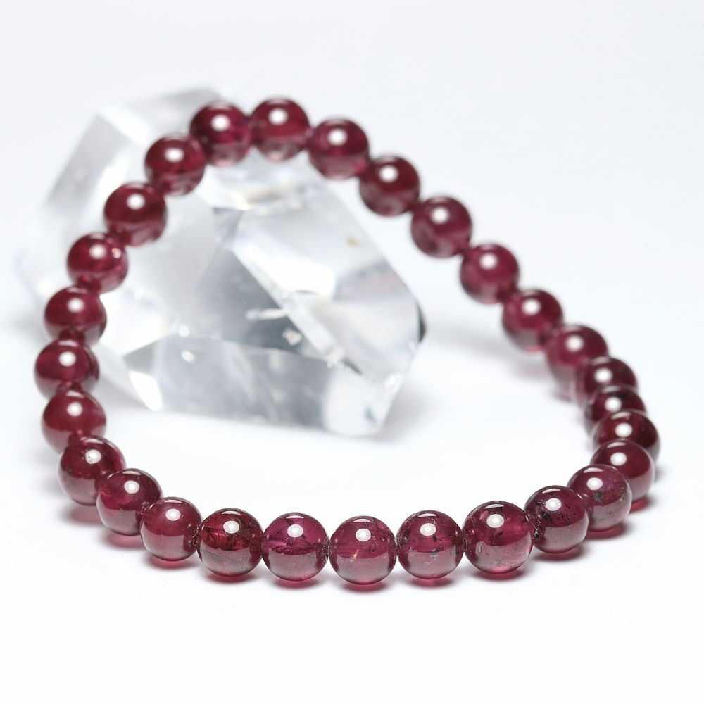 比較的小さめの6.5mm粒は、発色よく明るめの赤色が美しい【高品質】ブレスレットで、光が透けることでピンクパープルにも見えます。