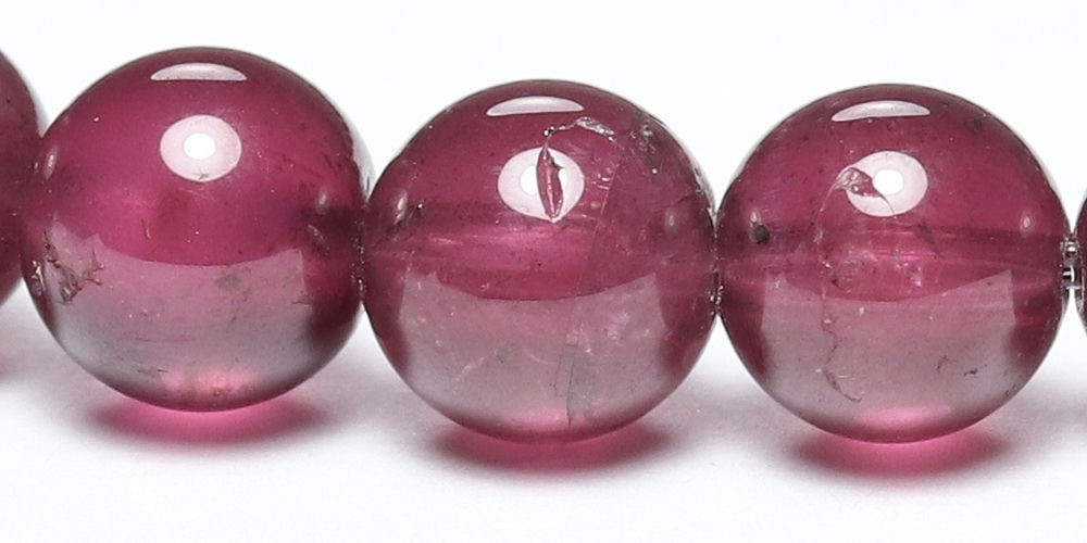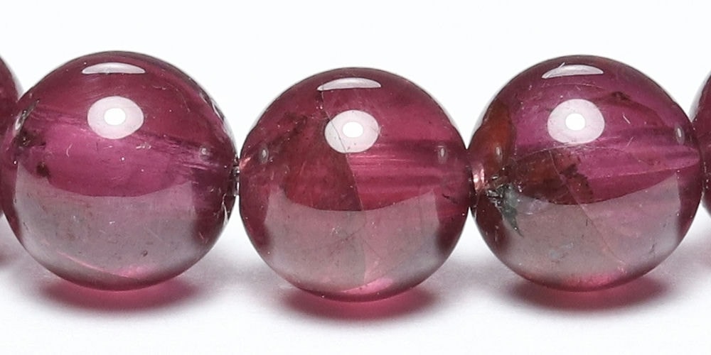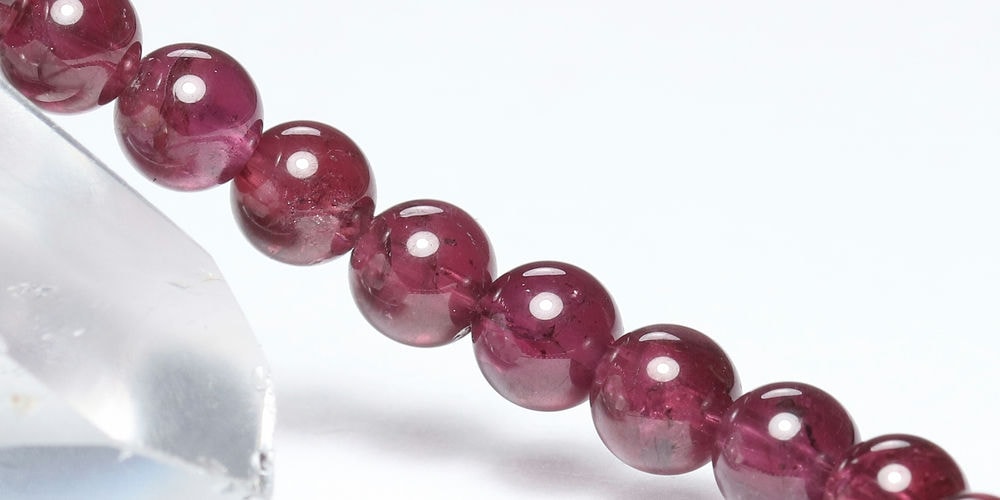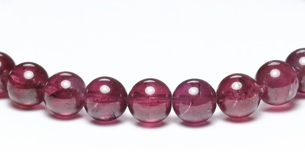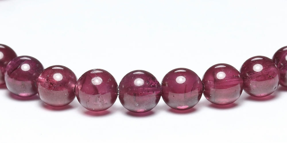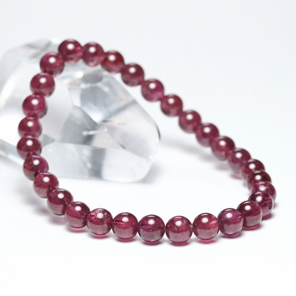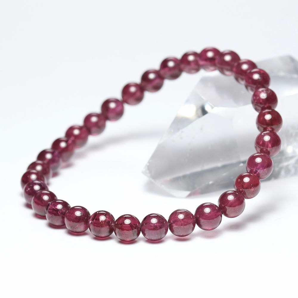 比較的小さめの6mm粒は、発色よく明るめの赤色が美しい【高品質】ブレスレットで、光が透けることでピンクパープルにも見えます。