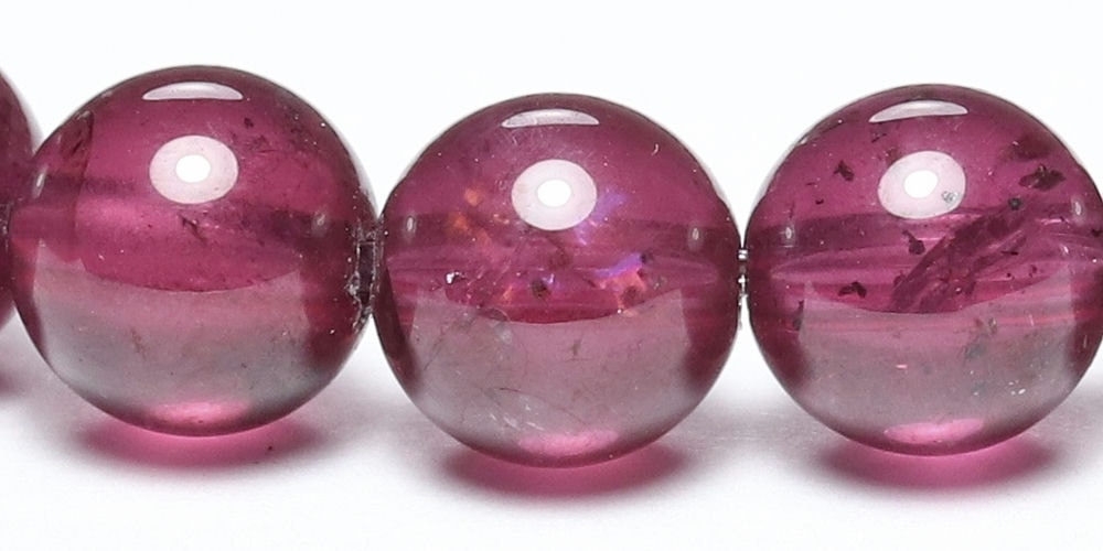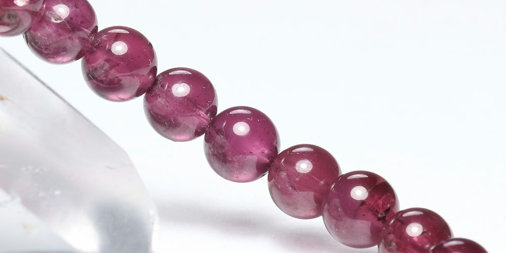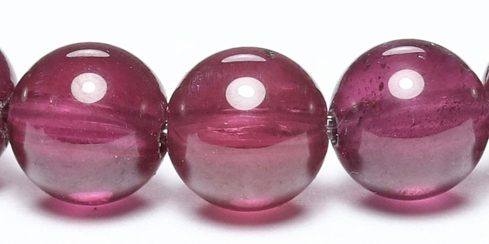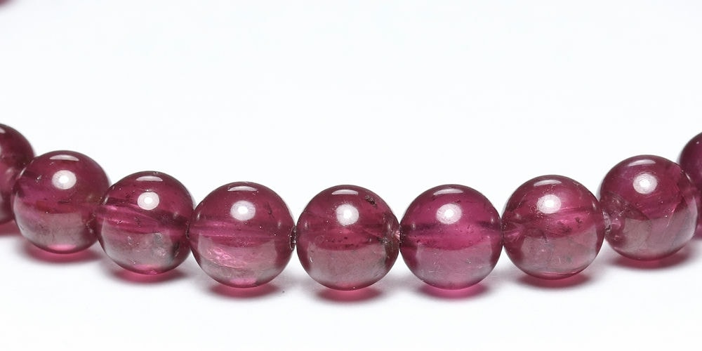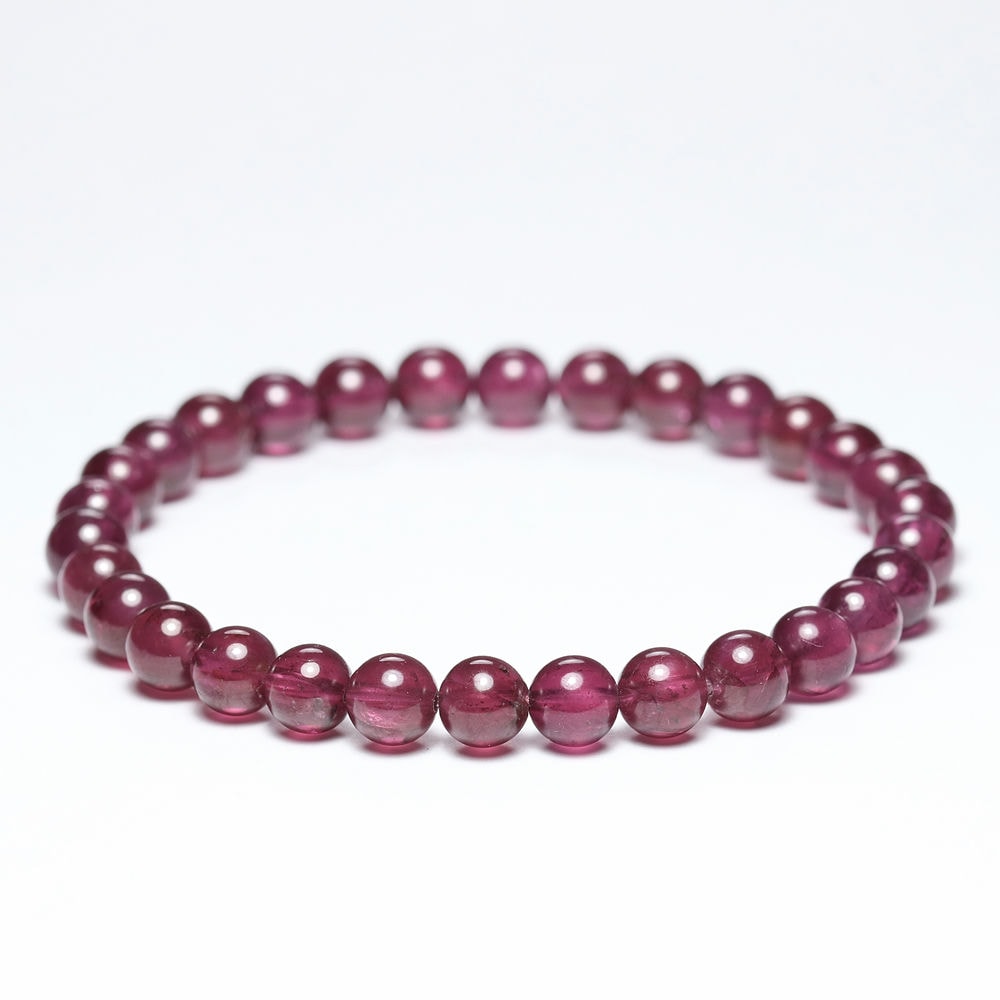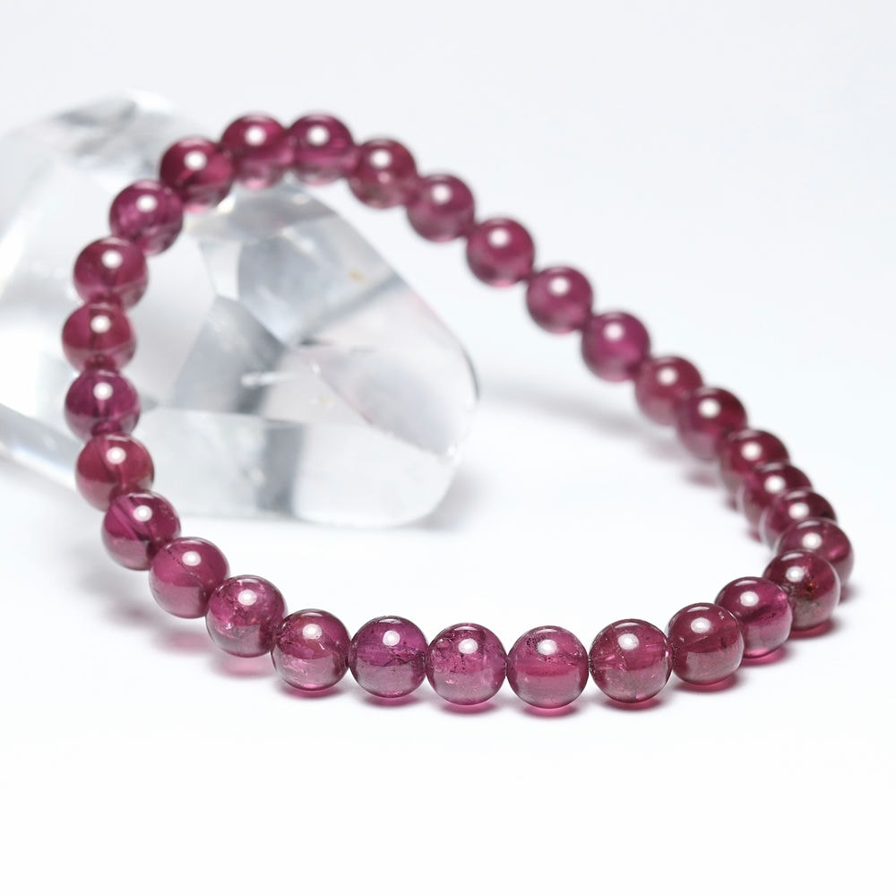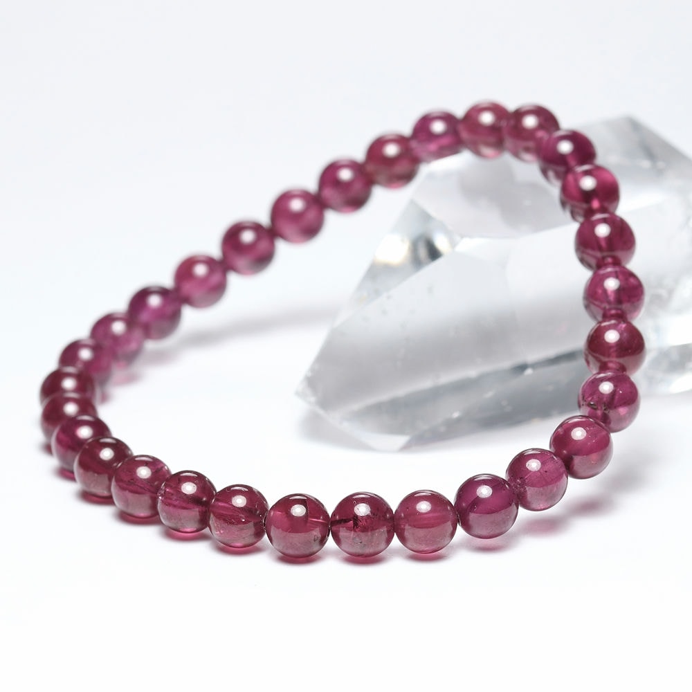 比較的小さめの6mm粒は、発色よく明るめの赤色が美しい【高品質】ブレスレットで、光が透けることでピンクパープルにも見えます。