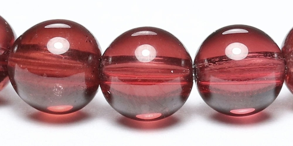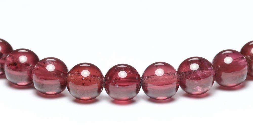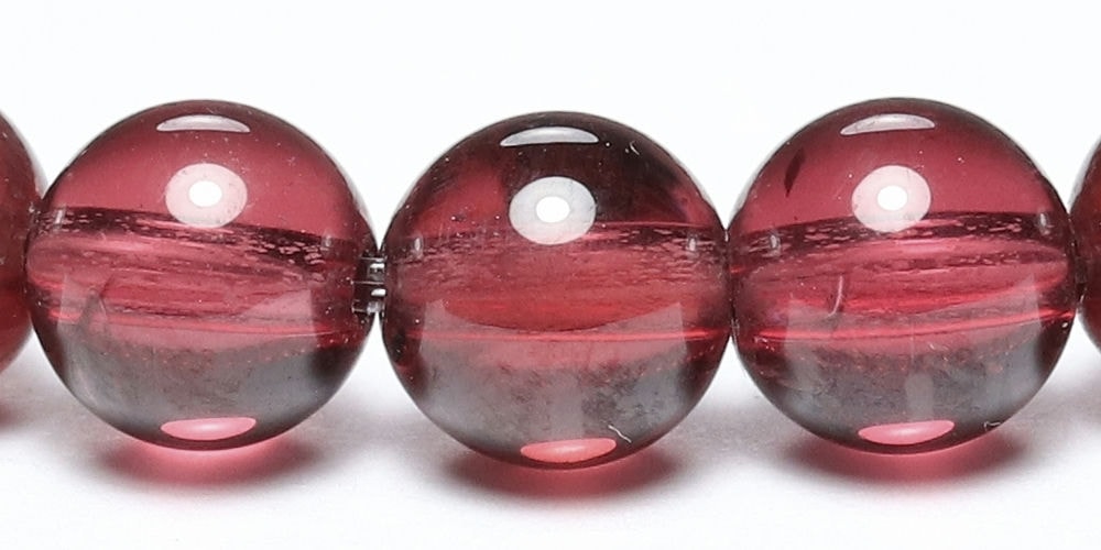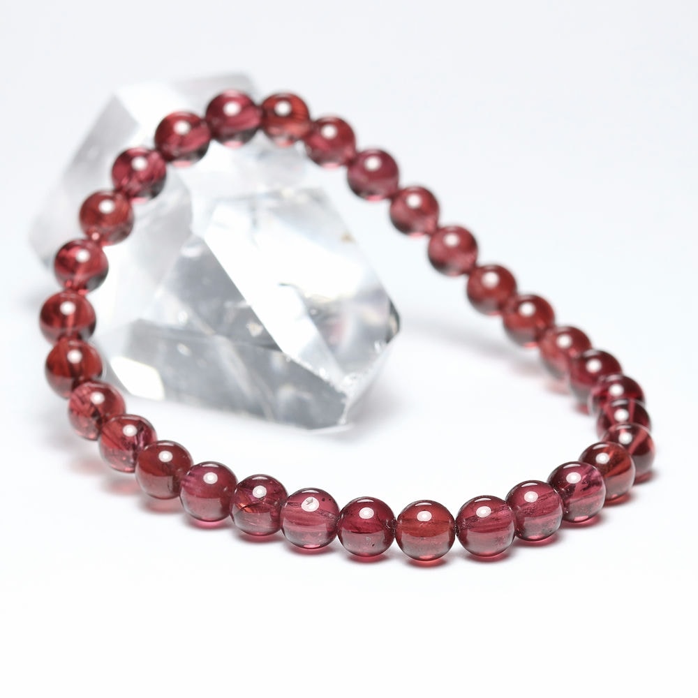 小さめの5.5mm粒は、発色よく明るめの赤色が美しい【高品質】ブレスレットで、光が透けることでピンクパープルにも見えます。