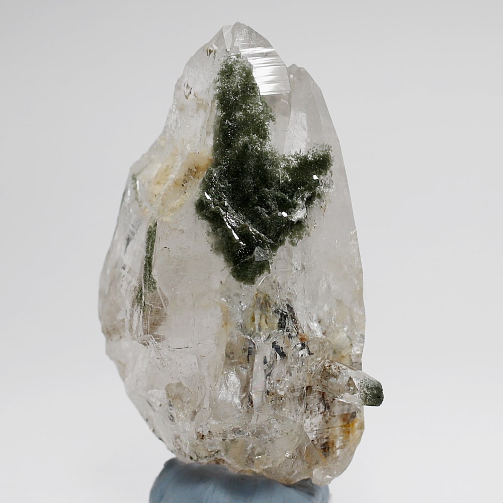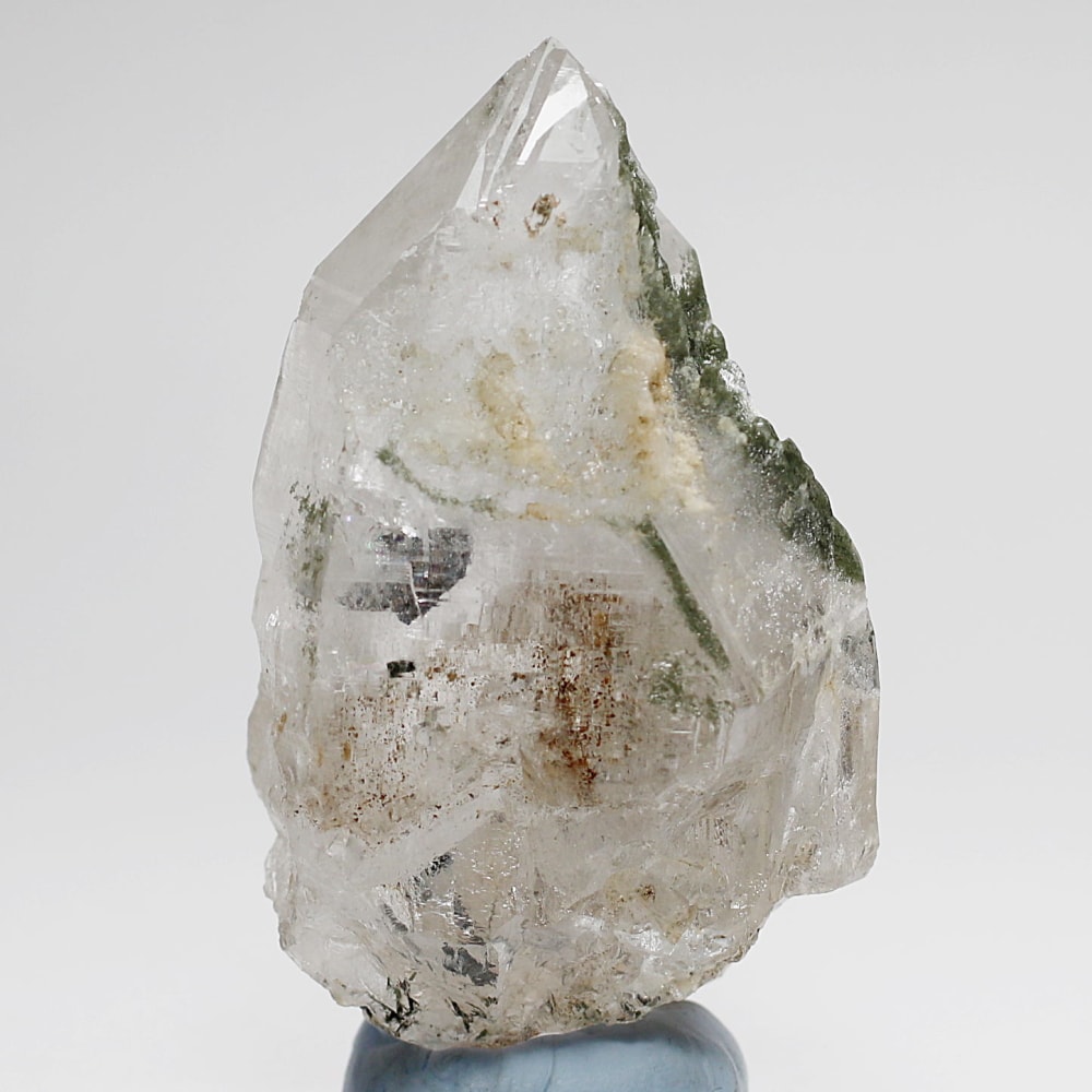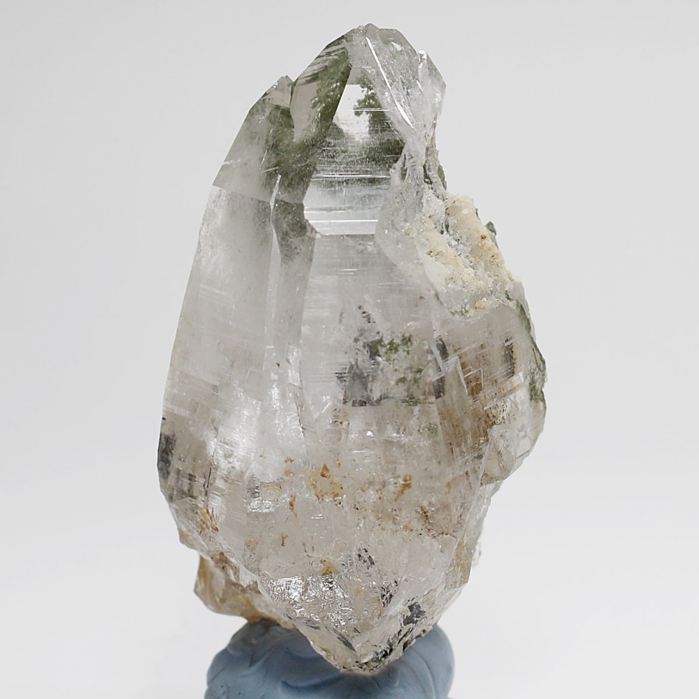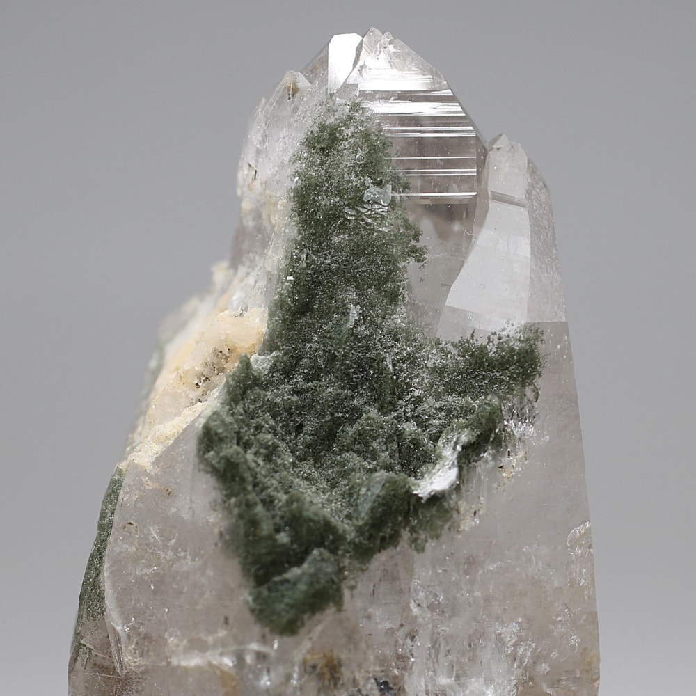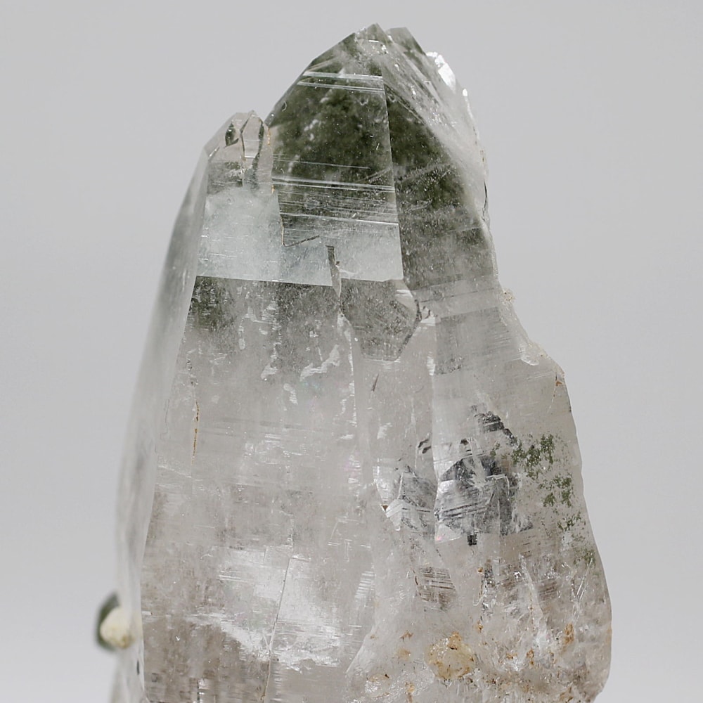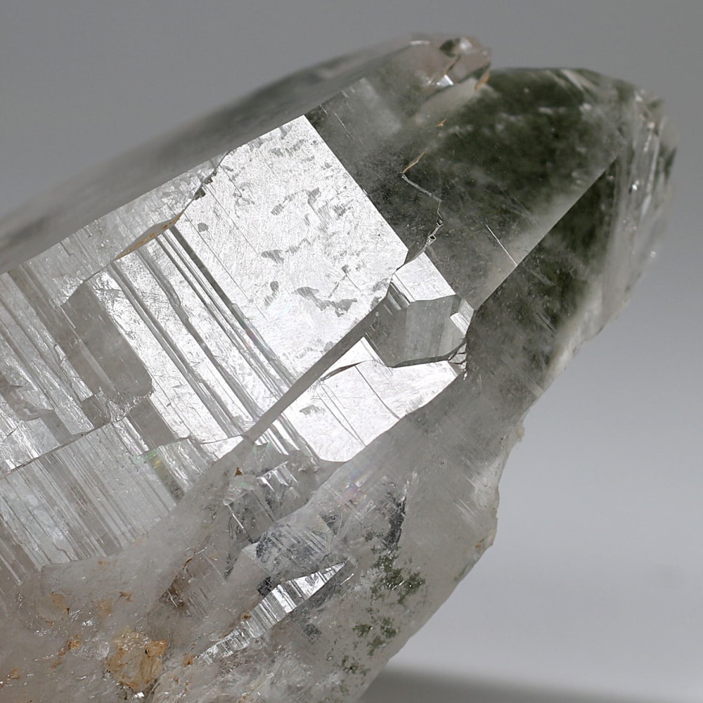 ご覧のお品は、長い年月の中で熱水や圧力により、腐食や再結晶を繰り返し完成した異形とも言える個性的なディテールを持つ逸品です。柱面に刻まれたバーコードや虹の煌めき、その見た目を覆すほど美しい照りと透明感。そして彩を添える深緑色のクローライト。魅力溢れる一品です。