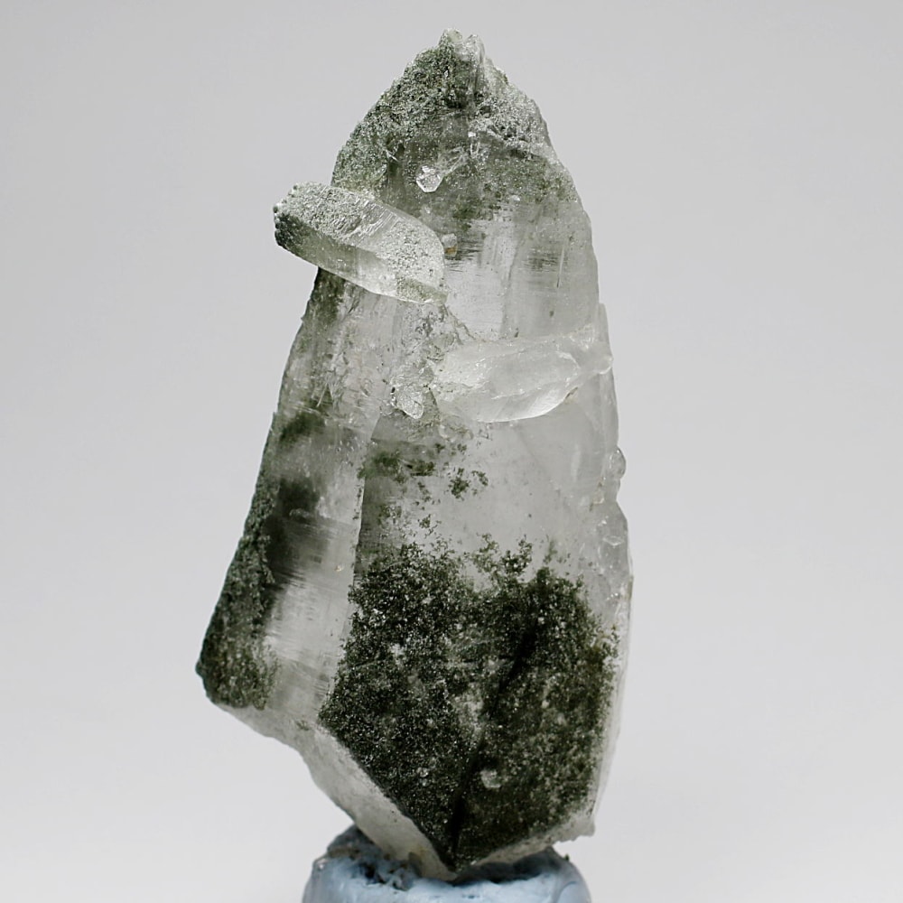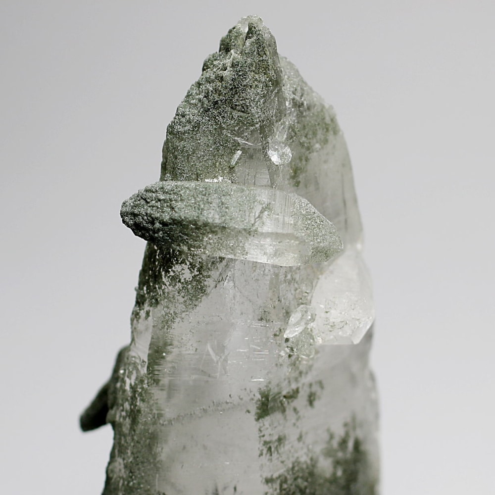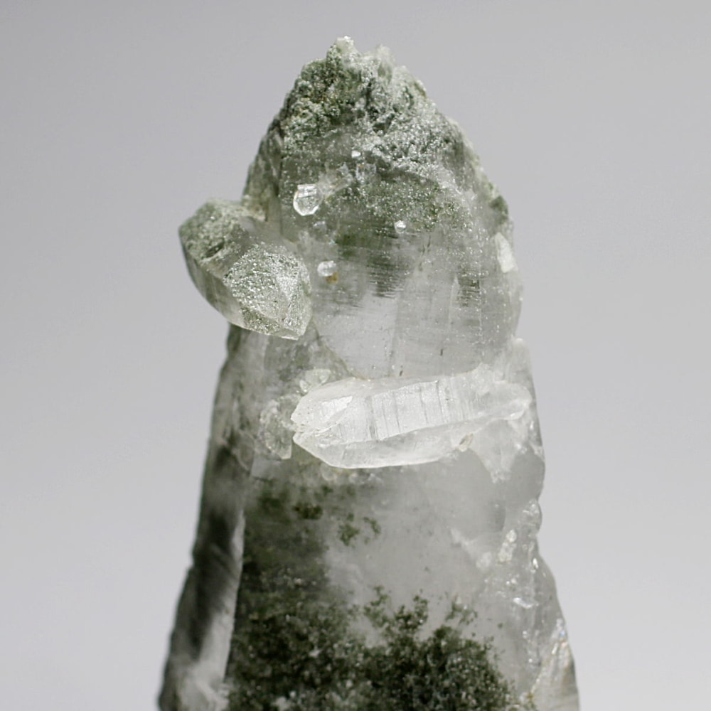 ご覧のお品は、水晶ポイントにクローライト(緑泥石)が美しく付着した、ガネッシュヒマール産ならではの魅力を堪能できる逸品です。主となる結晶を頼るように寄り添う小さな結晶たちが物語を紡ぐような、慈愛に満ちた佇まいに心が洗われます。