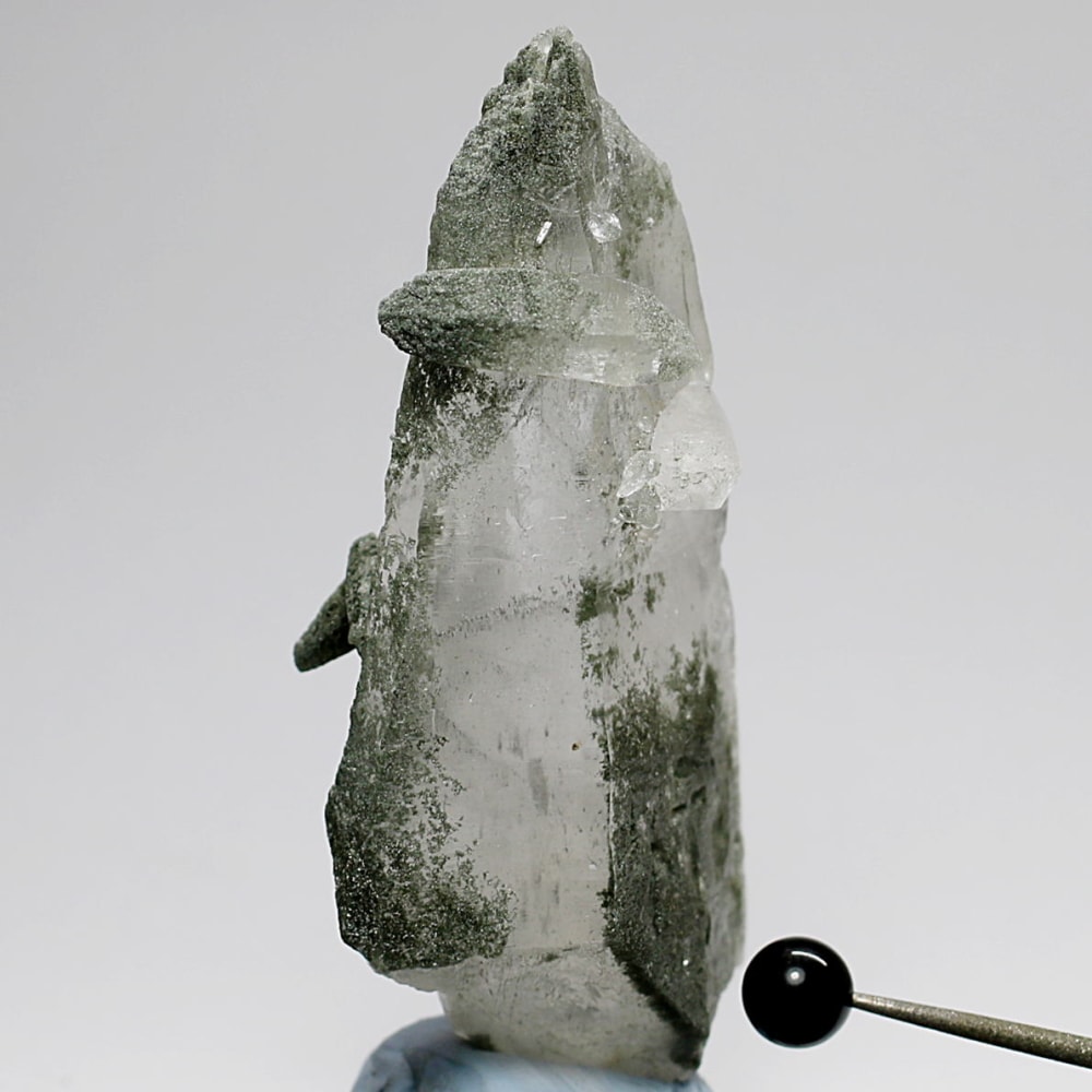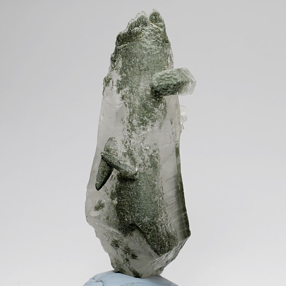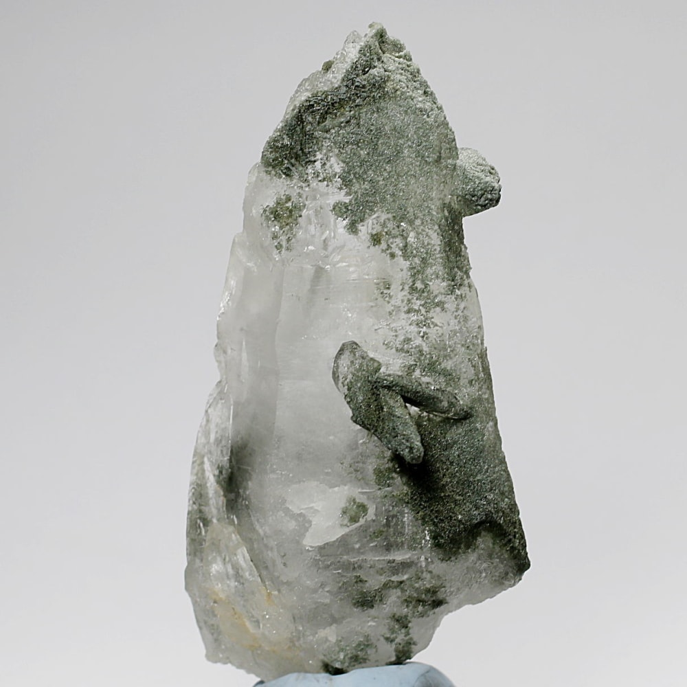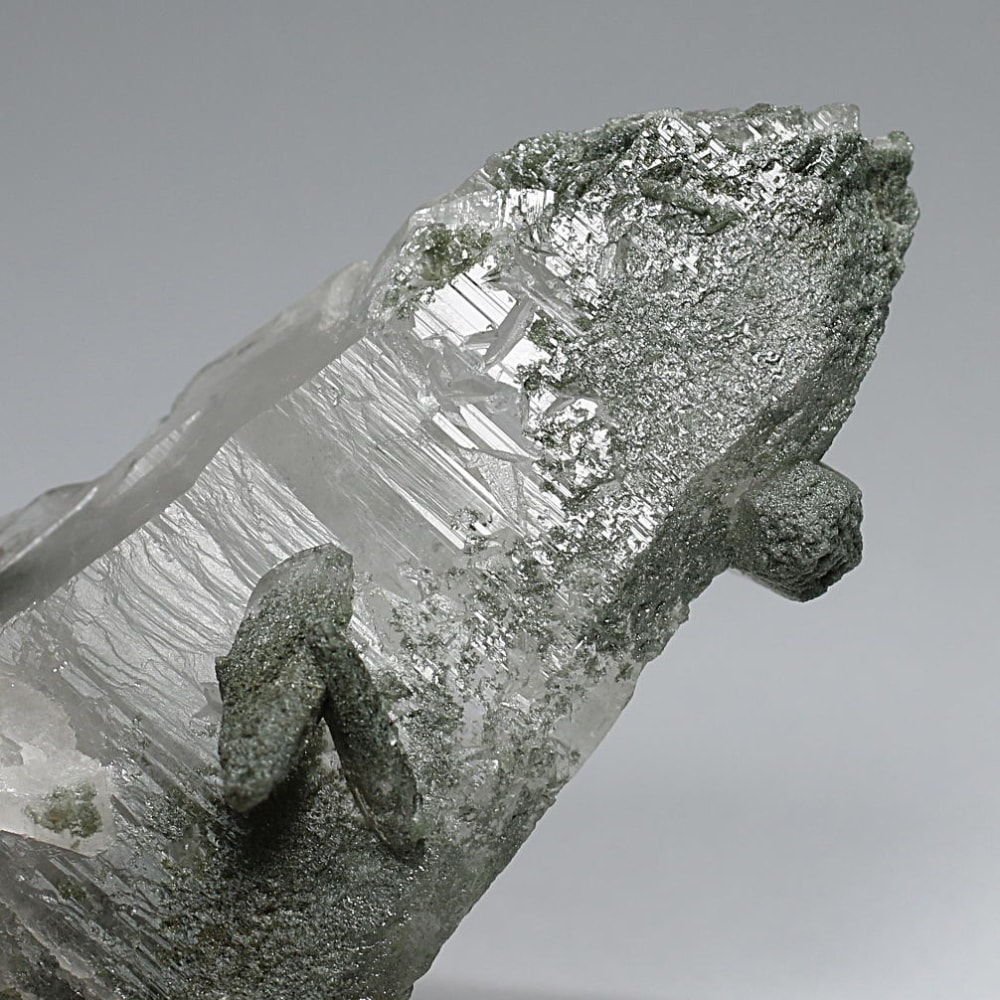 ご覧のお品は、水晶ポイントにクローライト(緑泥石)が美しく付着した、ガネッシュヒマール産ならではの魅力を堪能できる逸品です。主となる結晶を頼るように寄り添う小さな結晶たちが物語を紡ぐような、慈愛に満ちた佇まいに心が洗われます。