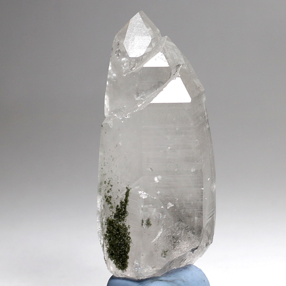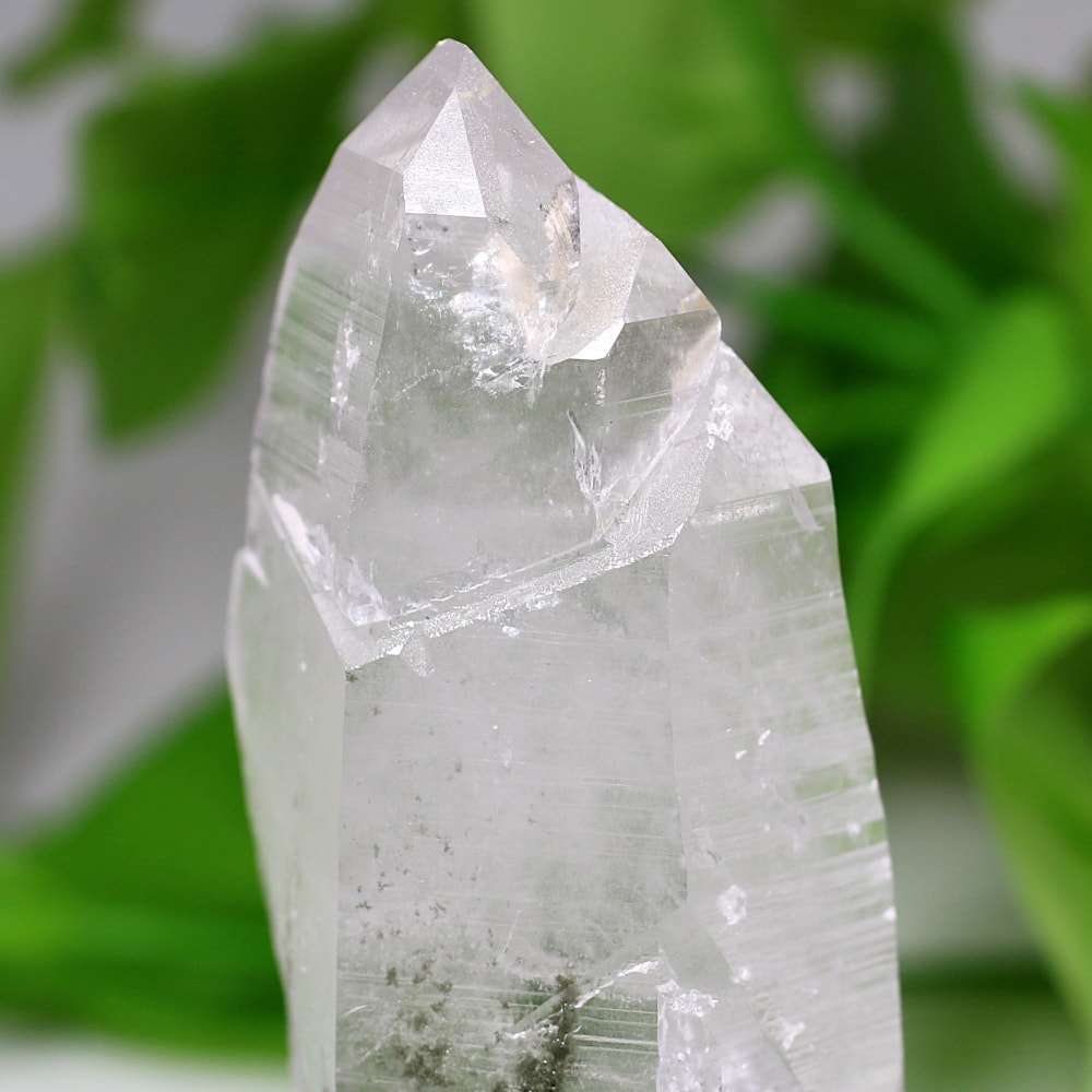 ご覧のお品は、ファセットが3段ある特殊形状を持つ希少な1点です。柱面に刻まれたバーコードや虹の煌めき、照りと透明感。そして彩を添える深緑色のクローライト。これは押さえておきたい魅力溢れる逸品です。