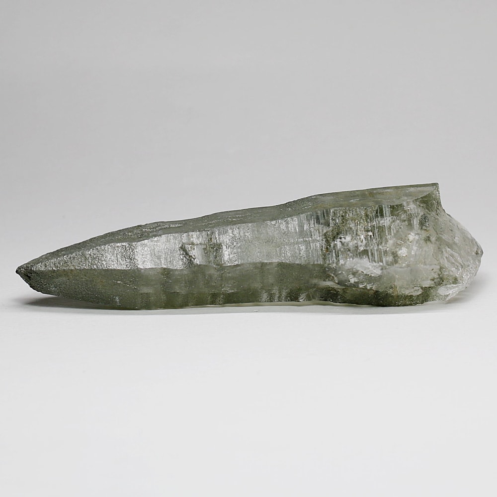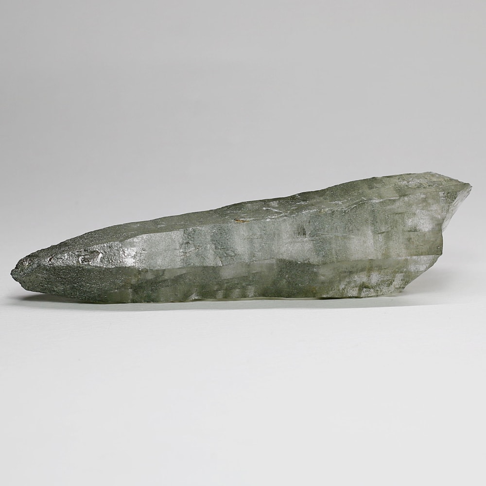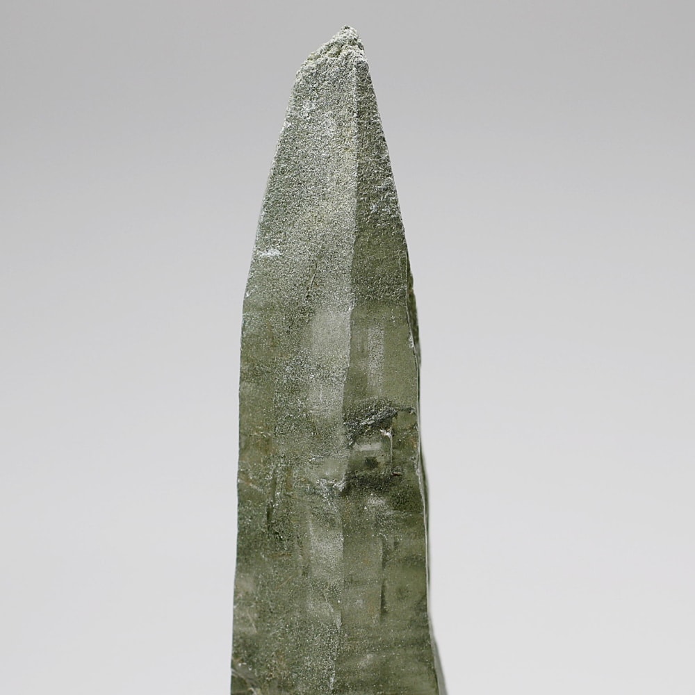 ご覧のお品は、水晶ポイントにクローライト(緑泥石)が美しく付着した、ガネッシュヒマール産ならではの魅力を堪能できる逸品です。先端へ向かって鋭く伸びる結晶と、それを覆う深いグリーンは、『水晶は透明なもの』という既成概念を鮮やかに覆してくれます。