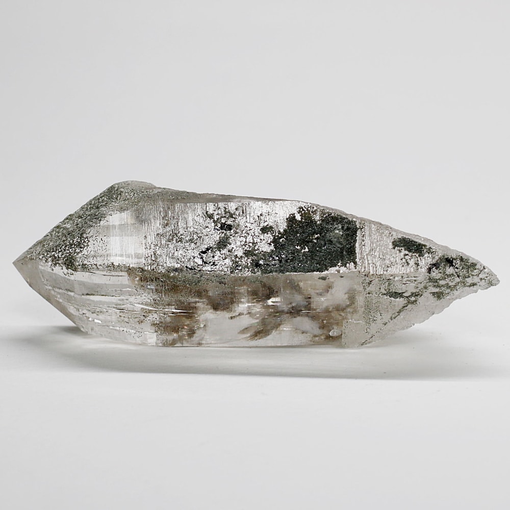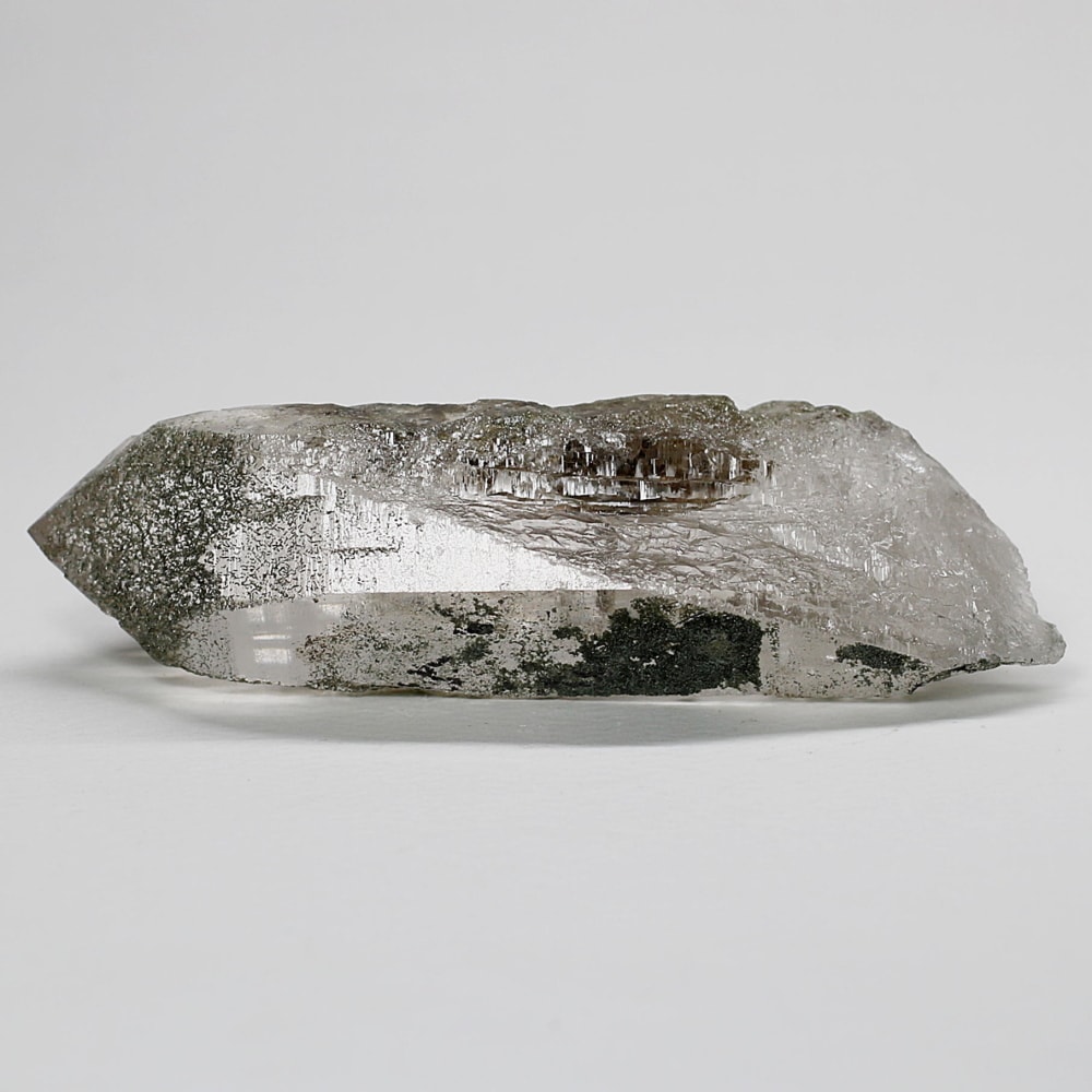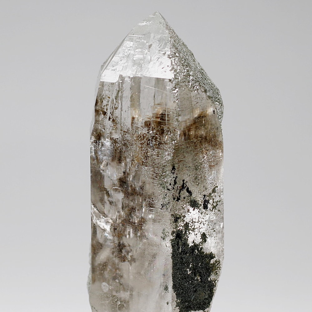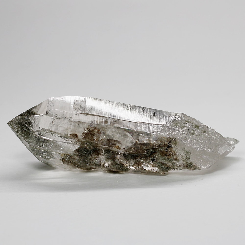ガネーシュヒマール産ならではの力強いディテール。水晶の柱面には明瞭なバーコードが刻まれ、ファセットを彩るクローライトの上には、星屑のようにマイカ(雲母)がキラキラと煌めきます。見逃せない魅力が凝縮された一品です。