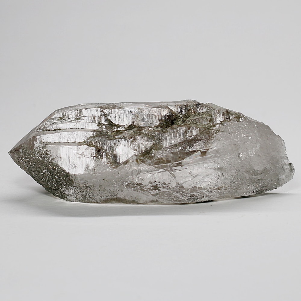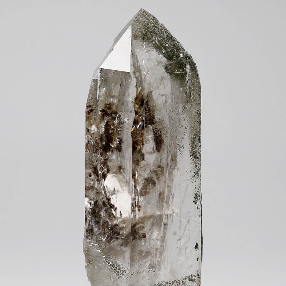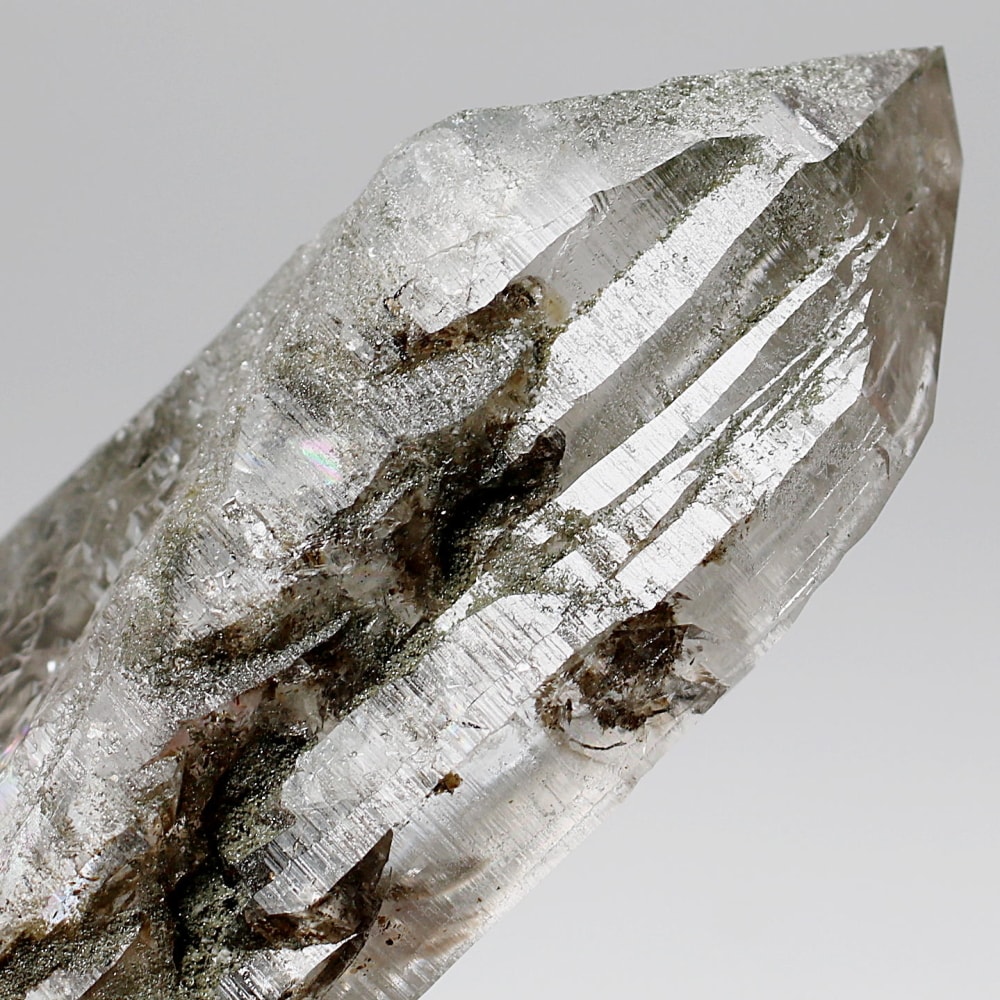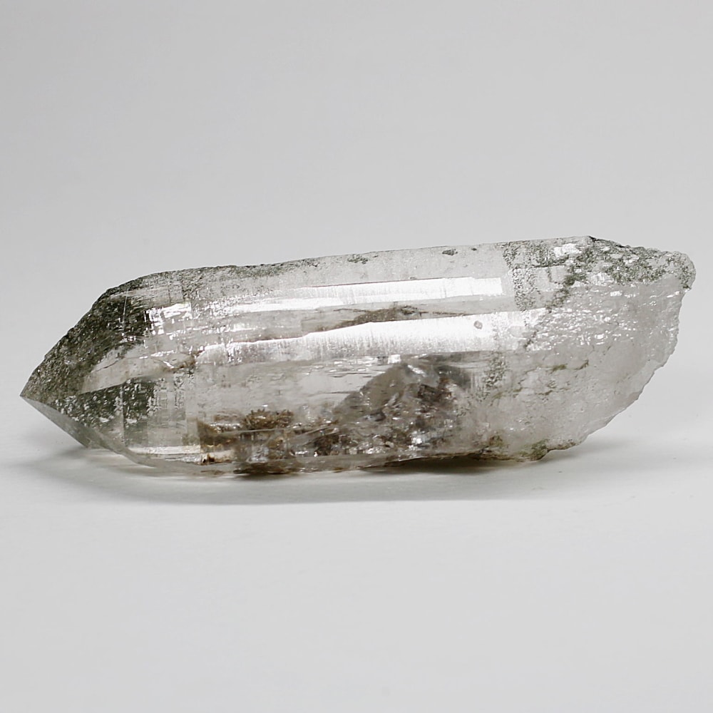 ガネーシュヒマール産ならではの力強いディテール。水晶の柱面には明瞭なバーコードが刻まれ、ファセットを彩るクローライトの上には、星屑のようにマイカ(雲母)がキラキラと煌めきます。見逃せない魅力が凝縮された一品です。