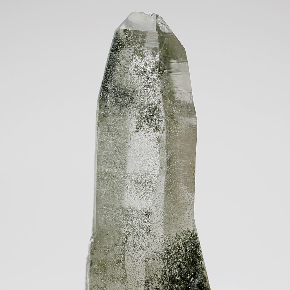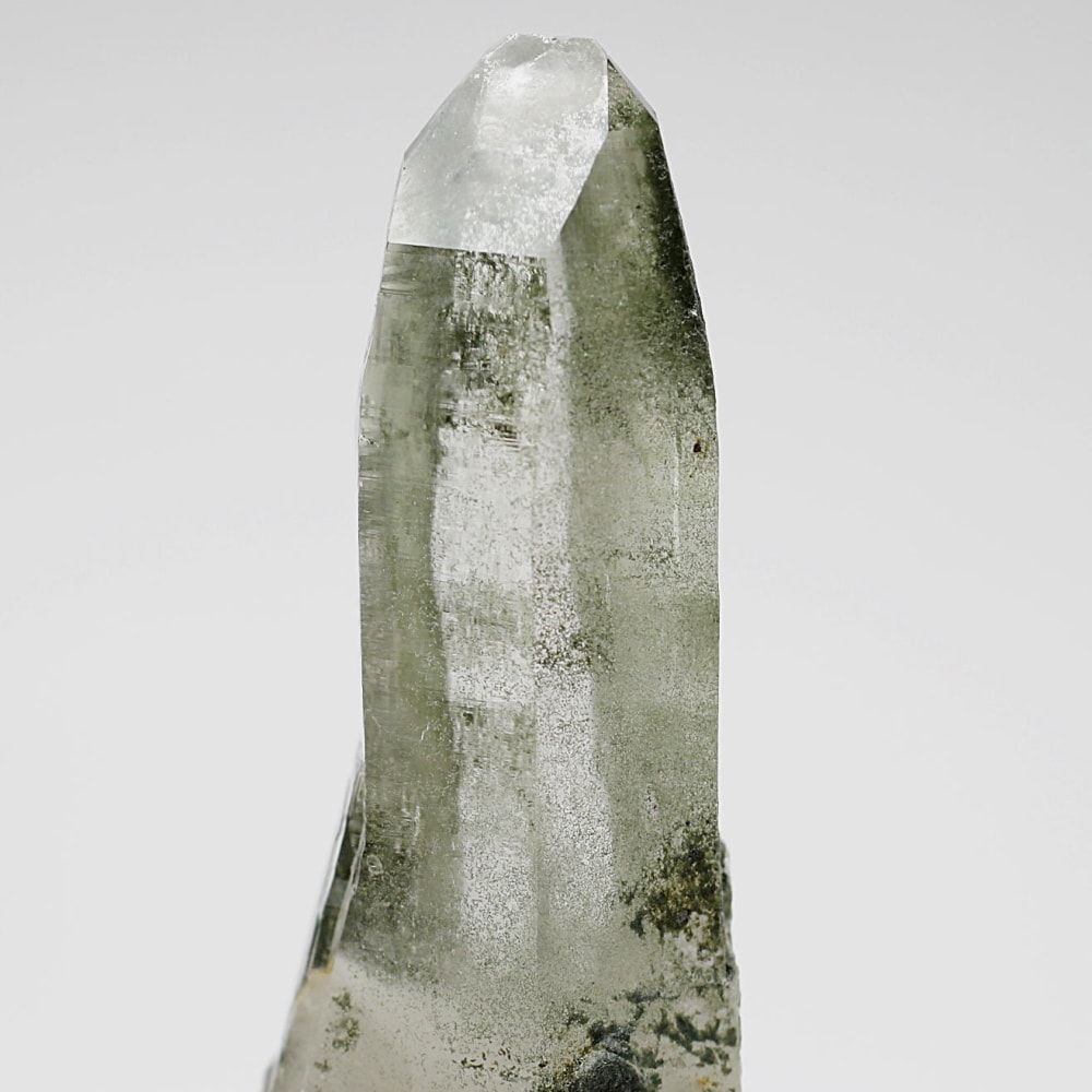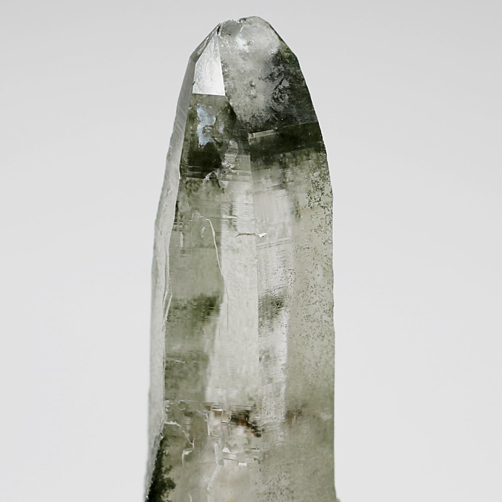 ご覧のお品は、照りと透明度を併せ持ち、悠久の時を刻んだ成長の証とも言えるバーコード(条線)に、ガネーシュヒマール産らしい荒々しくも神秘的な美しさを体現したクローライトの共生も見事な、自信を持っておすすめできる逸品です。