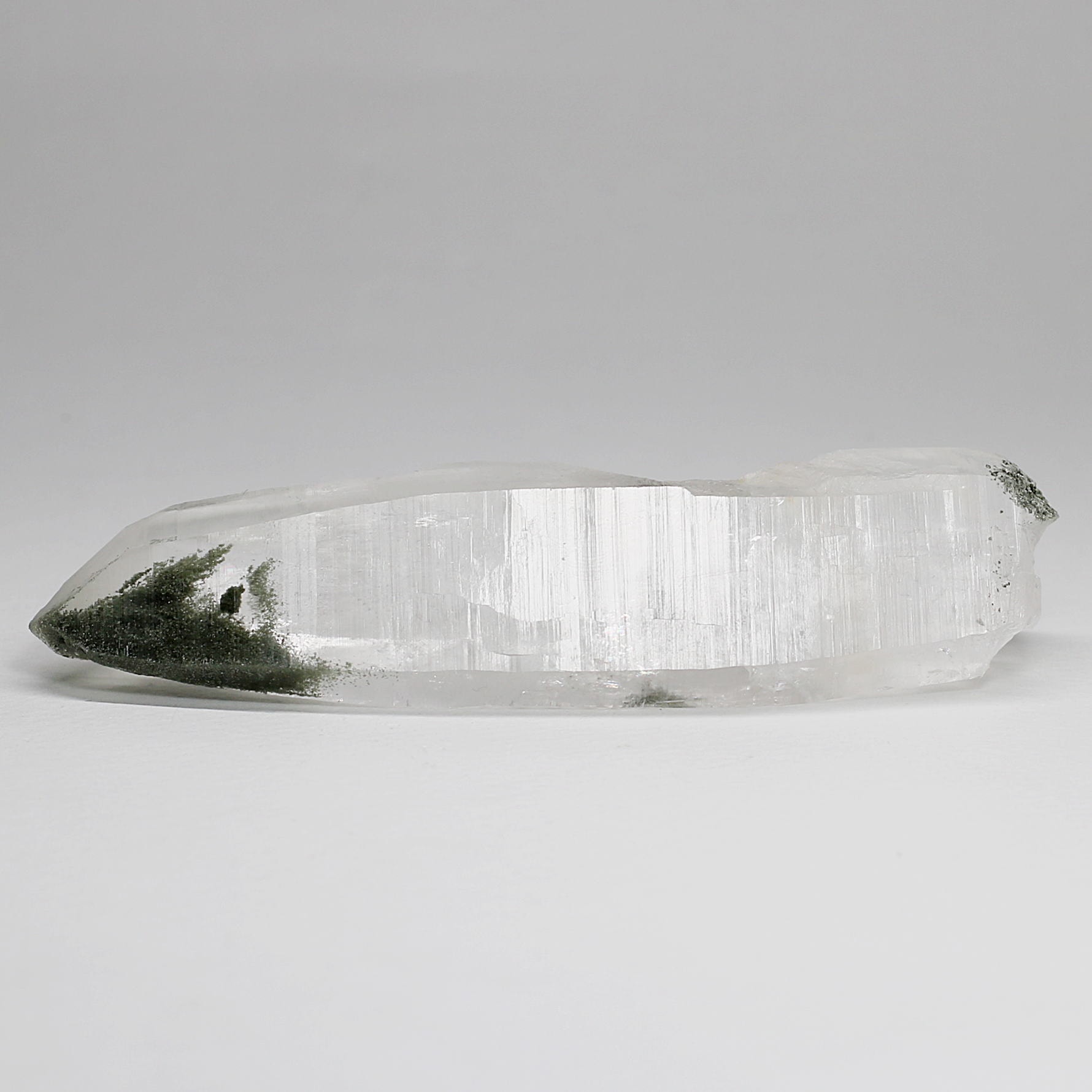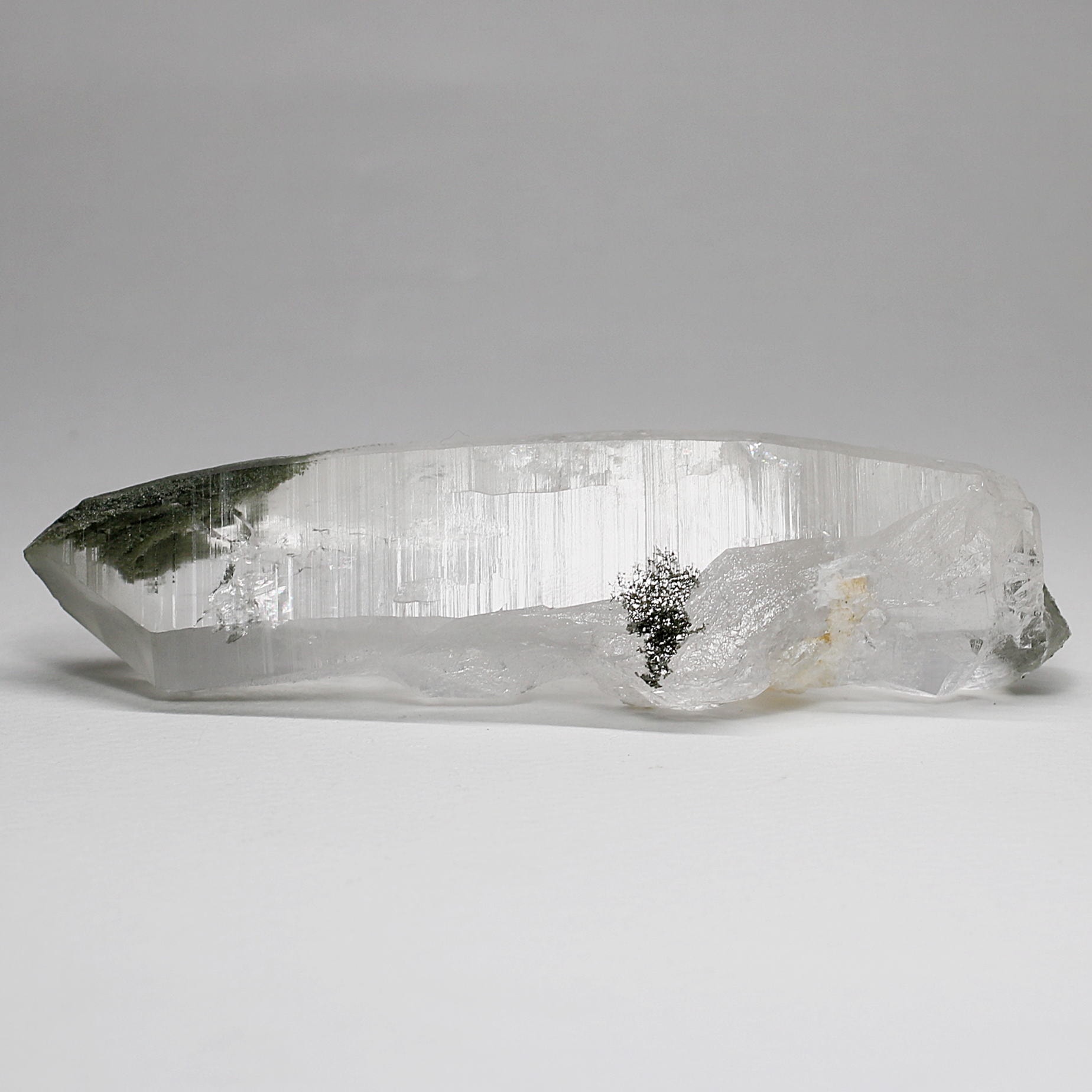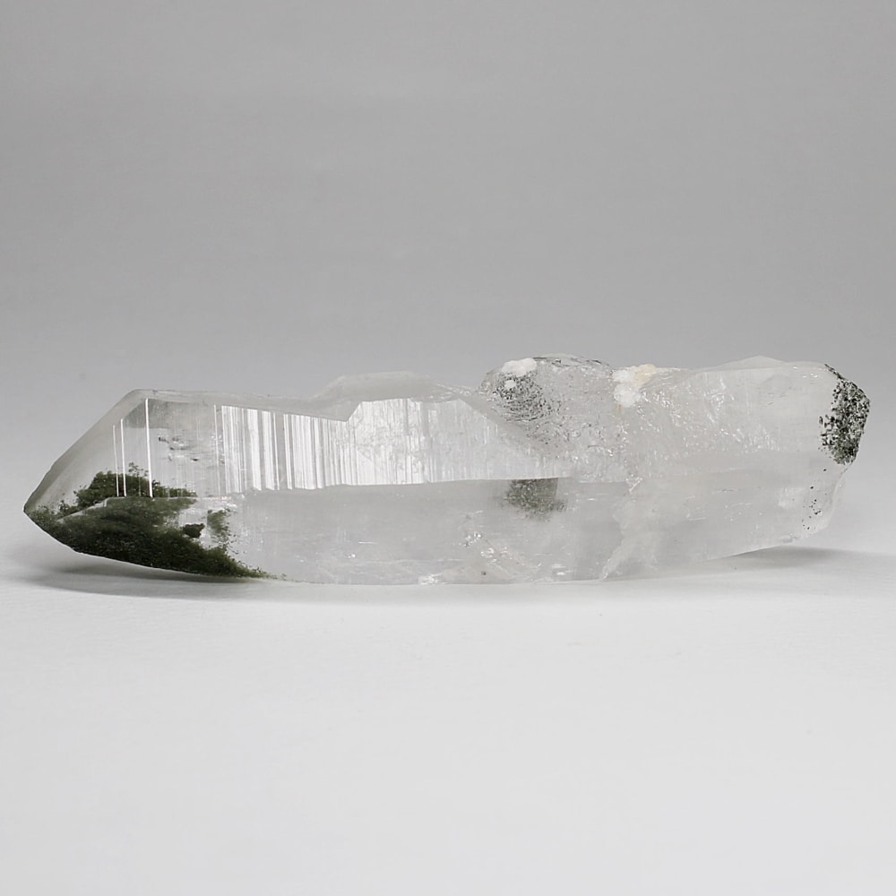 ご覧のお品は、照りと透明度を併せ持ち、悠久の時を刻んだ成長の証とも言えるバーコード(条線)に、ガネーシュヒマール産らしい荒々しくも神秘的な美しさを体現したクローライトの共生も見事な、自信を持っておすすめできる逸品です。