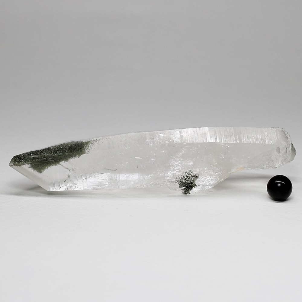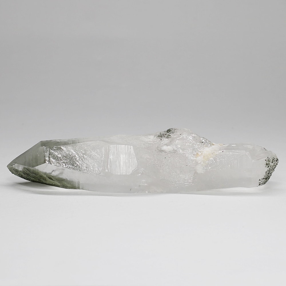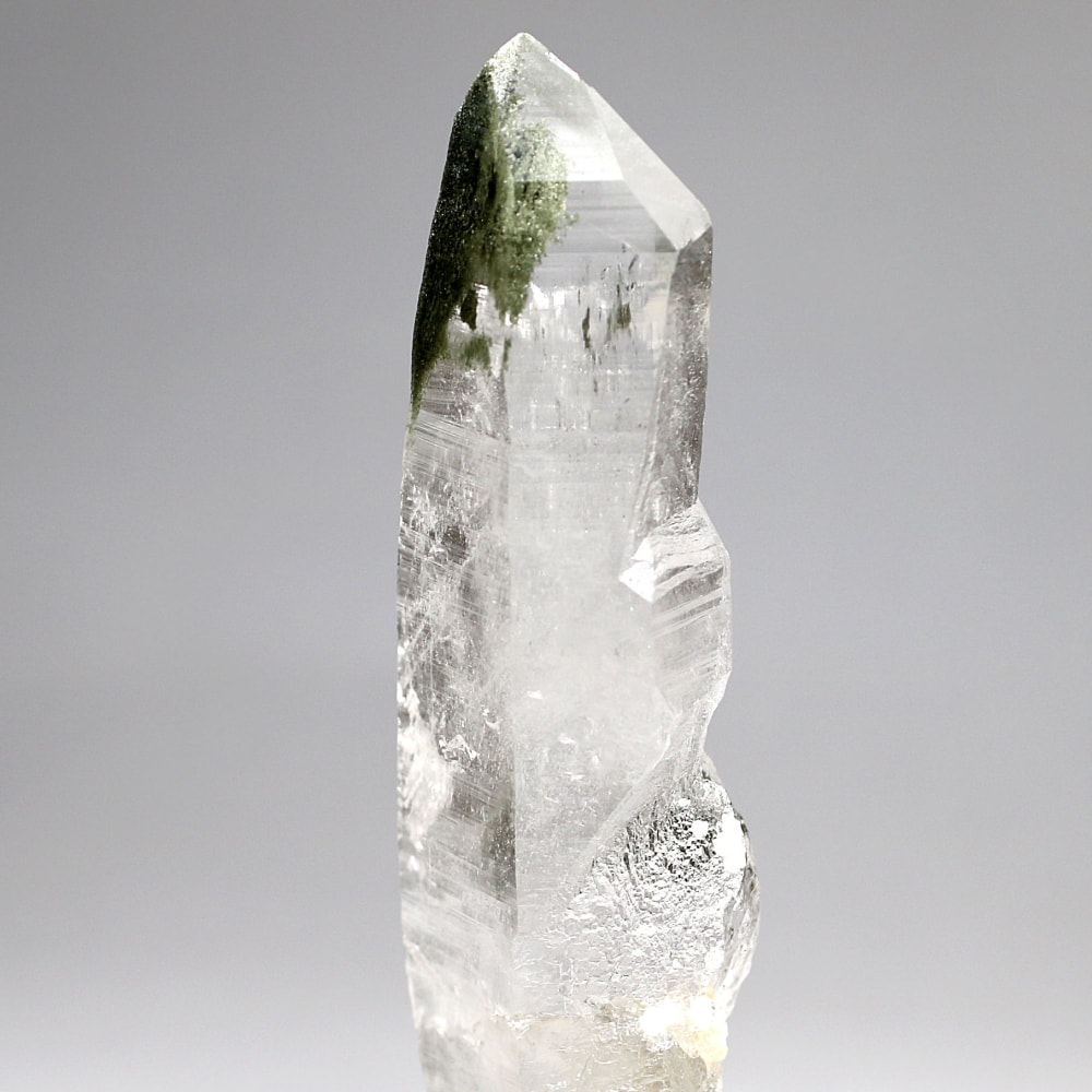 ご覧のお品は、照りと透明度を併せ持ち、悠久の時を刻んだ成長の証とも言えるバーコード(条線)に、ガネーシュヒマール産らしい荒々しくも神秘的な美しさを体現したクローライトの共生も見事な、自信を持っておすすめできる逸品です。