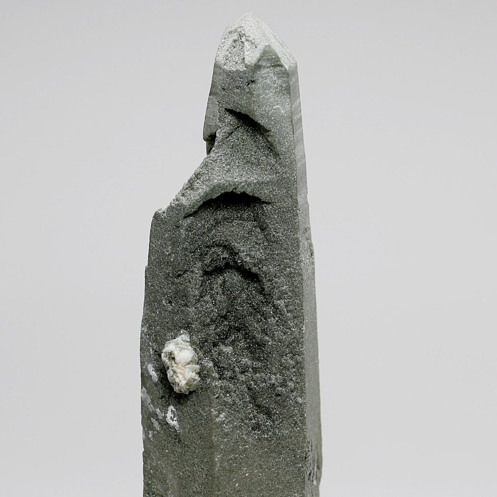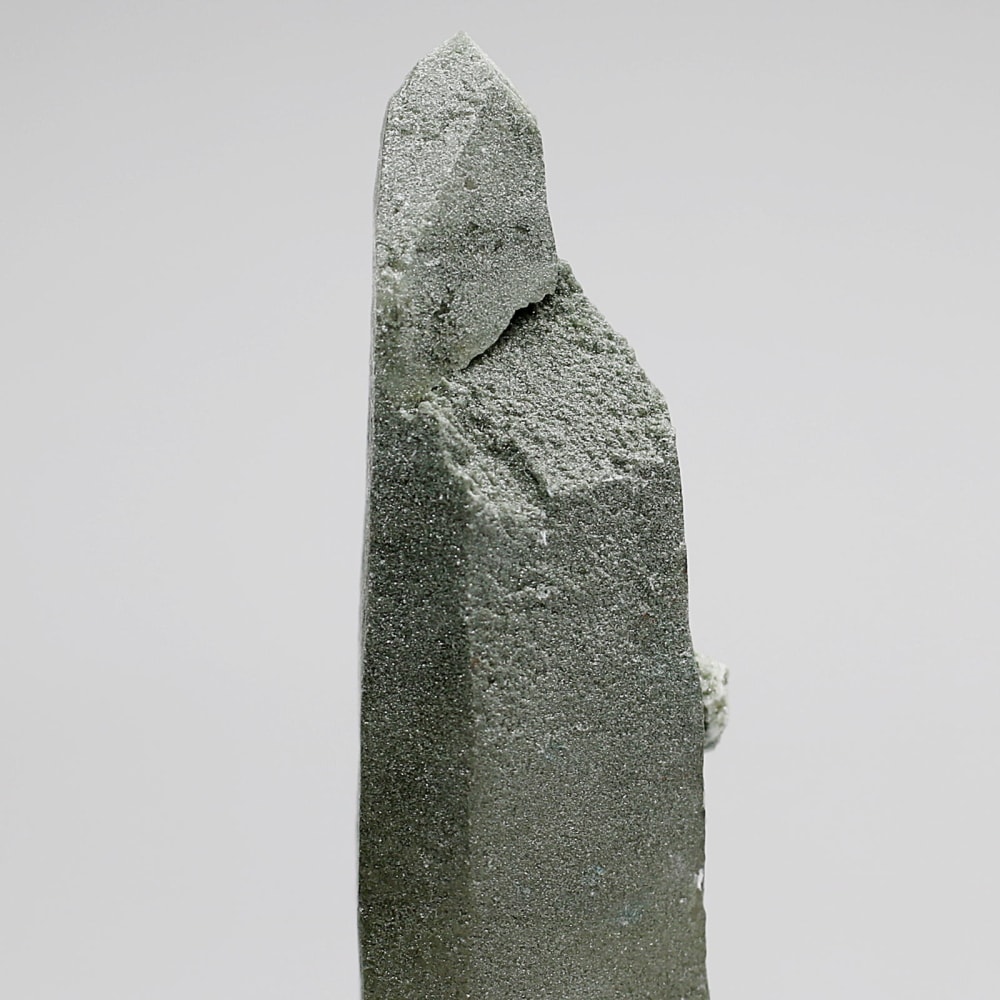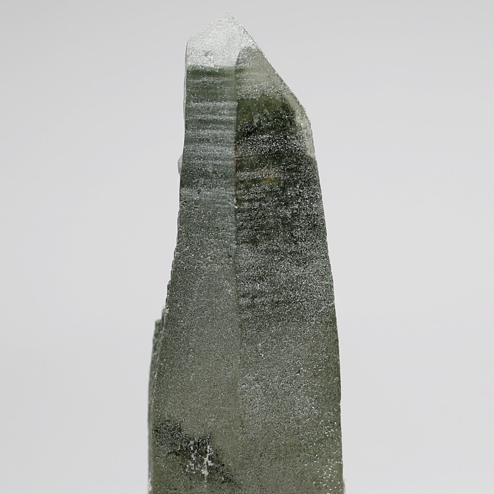ご覧のお品は、水晶ポイントにクローライト(緑泥石)が美しく付着した、ガネッシュヒマール産ならではの魅力を堪能できる逸品。熱水により柱面がえぐれているディテールも見逃せない個性です。覆う深いグリーンは『水晶は透明なもの』という既成概念を鮮やかに覆してくれます。