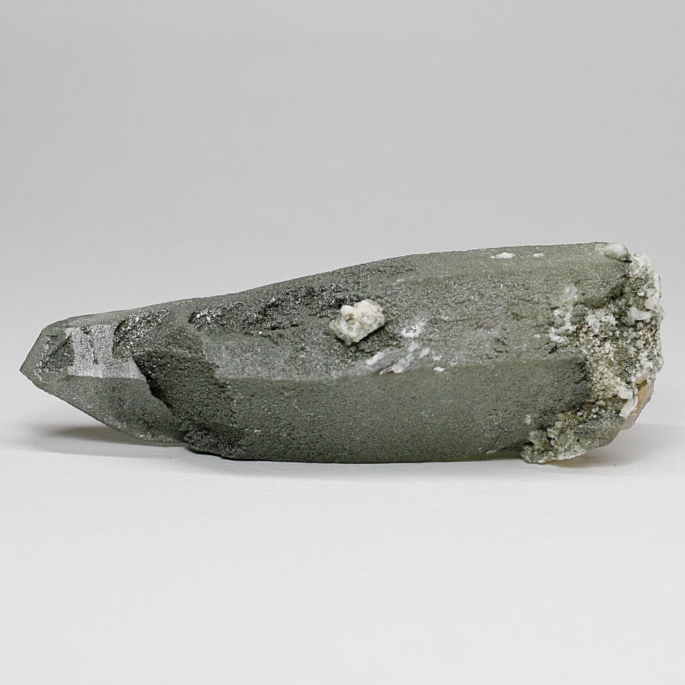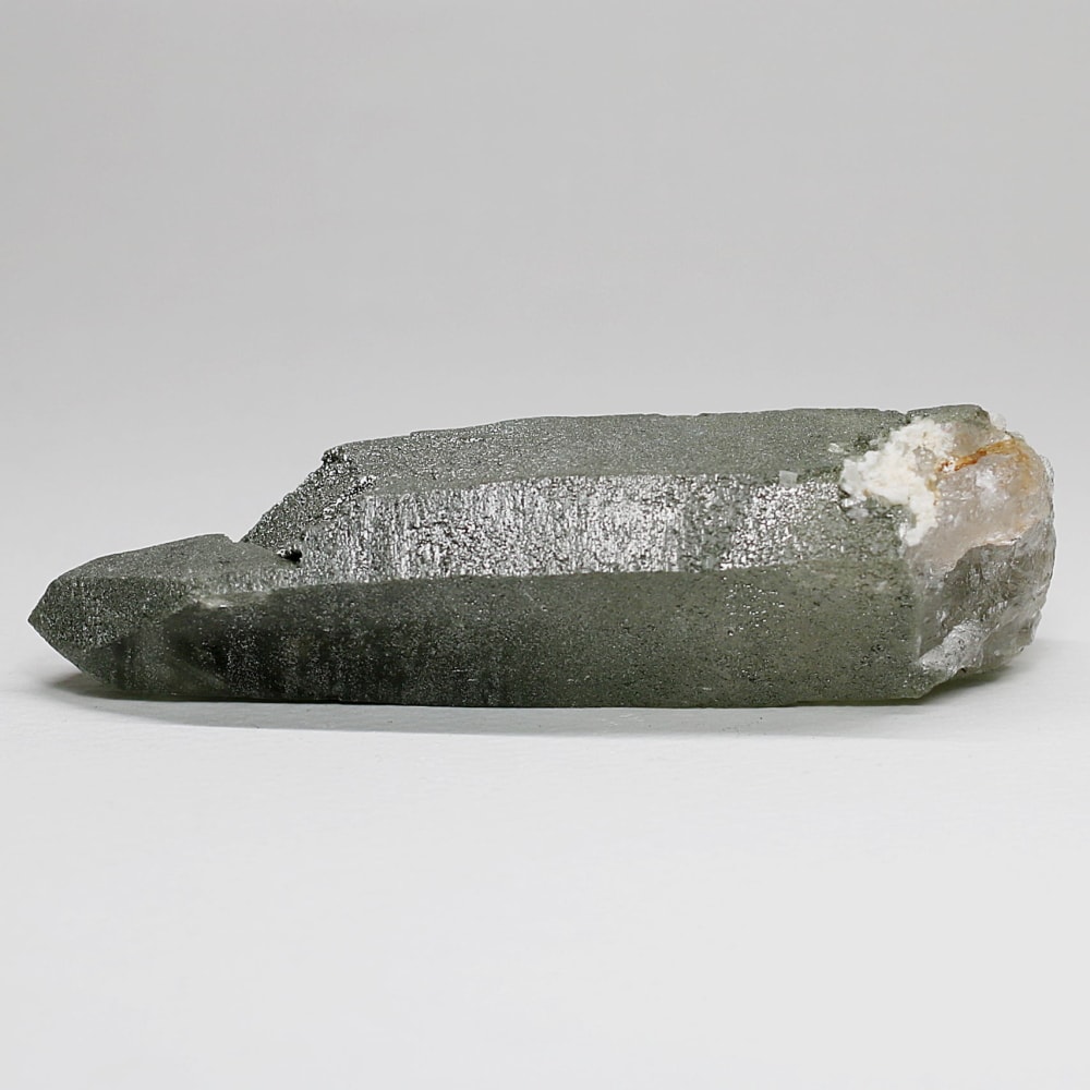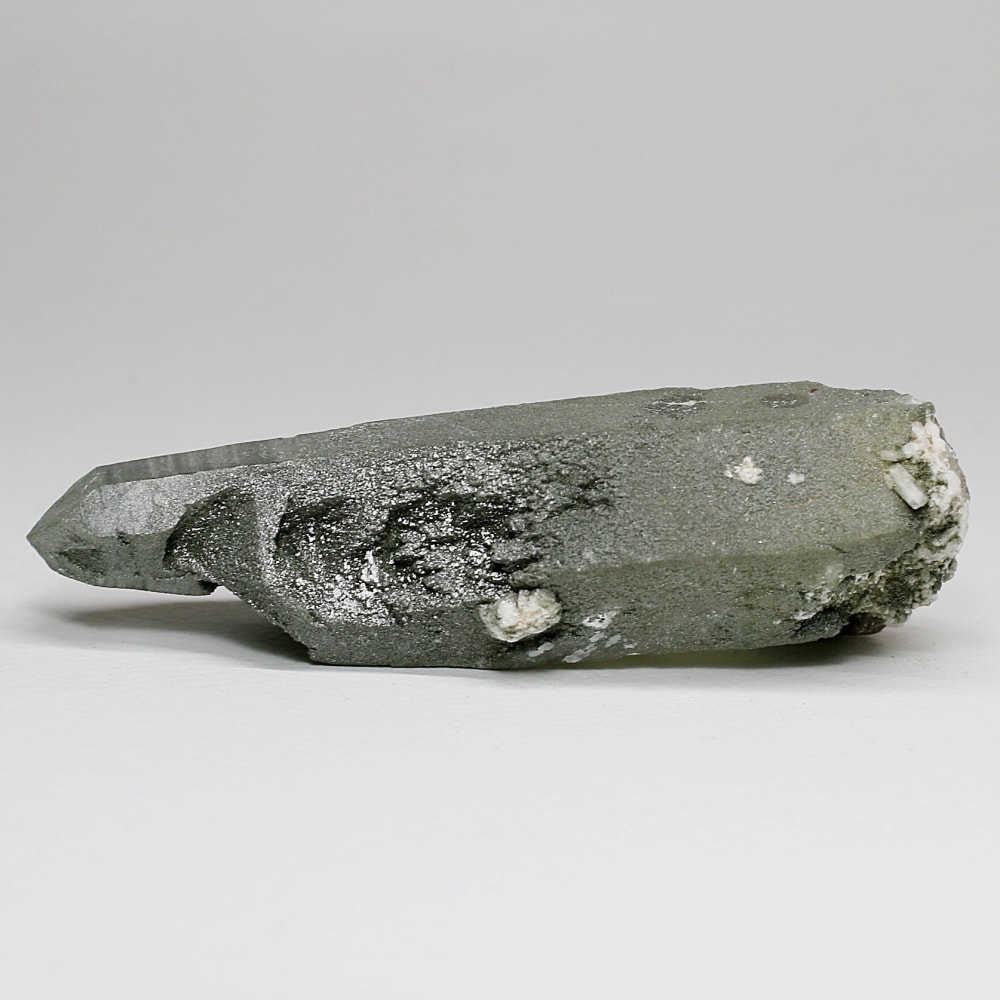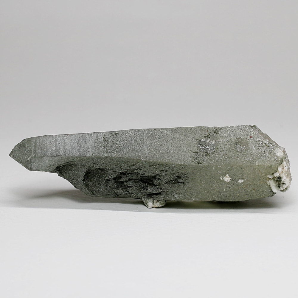 ご覧のお品は、水晶ポイントにクローライト(緑泥石)が美しく付着した、ガネッシュヒマール産ならではの魅力を堪能できる逸品。熱水により柱面がえぐれているディテールも見逃せない個性です。覆う深いグリーンは『水晶は透明なもの』という既成概念を鮮やかに覆してくれます。