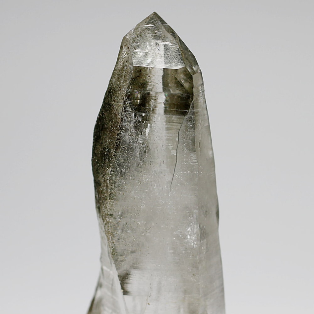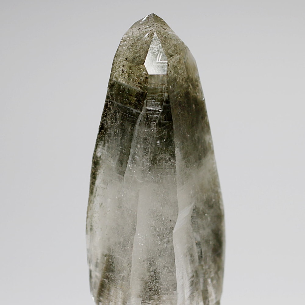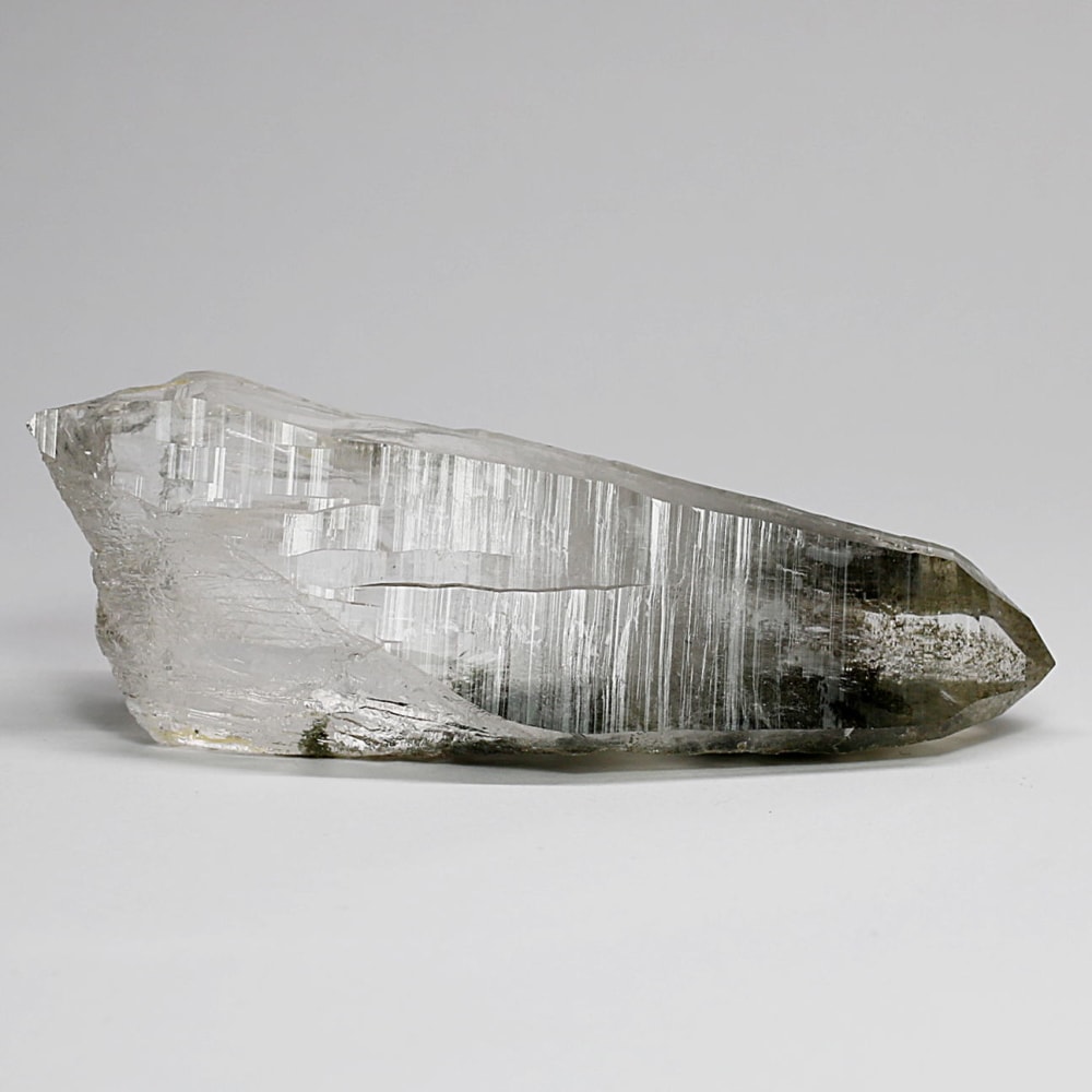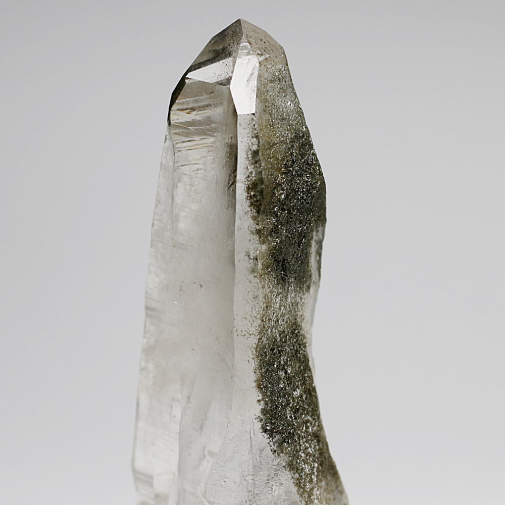 ご覧のお品は、照りと透明度を併せ持ち、悠久の時を刻んだ成長の証とも言えるバーコード(条線)に、ガネーシュヒマール産らしい荒々しくも神秘的な美しさを体現したクローライトの共生も見事な、自信を持っておすすめできる逸品です。