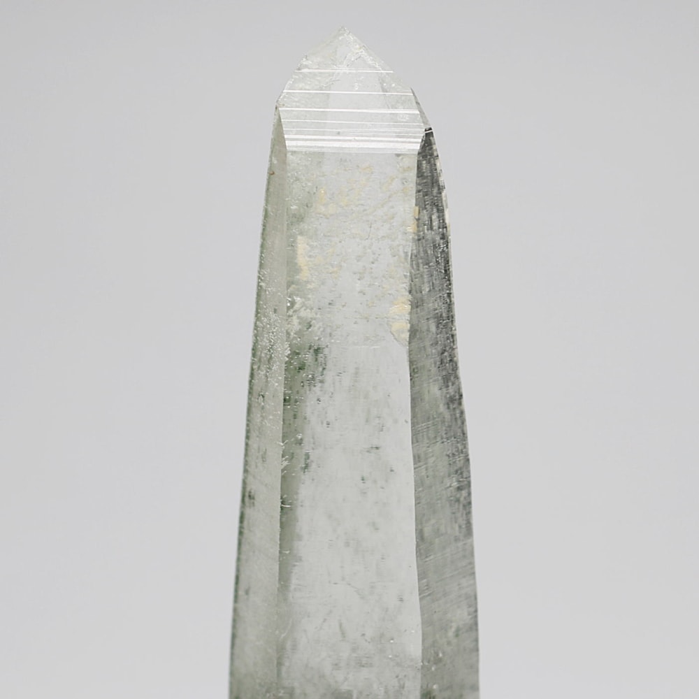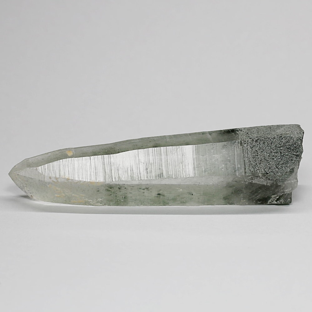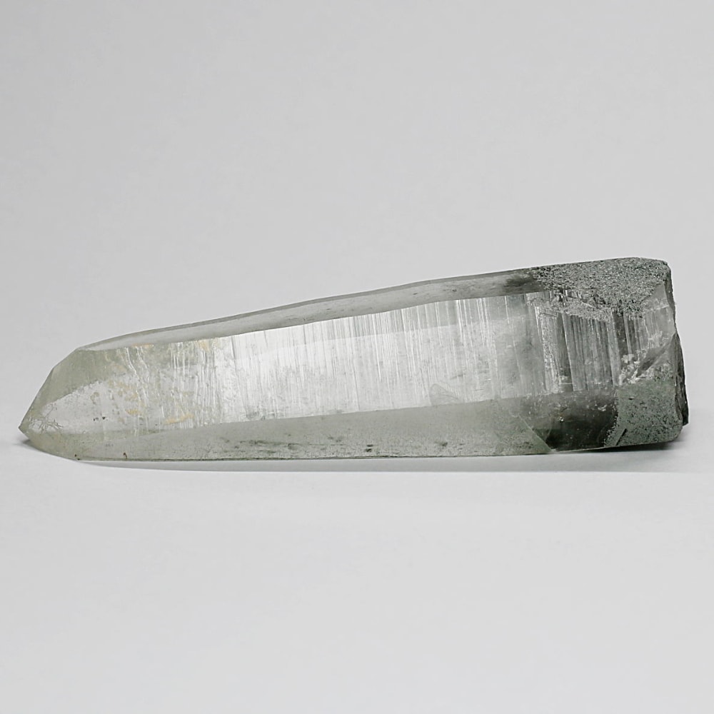 ご覧のお品は、照りと透明度を併せ持ち、悠久の時を刻んだ成長の証とも言えるバーコード(条線)に、ガネーシュヒマール産らしい荒々しくも神秘的な美しさを体現したクローライトの共生も見事な、自信を持っておすすめできる逸品です。