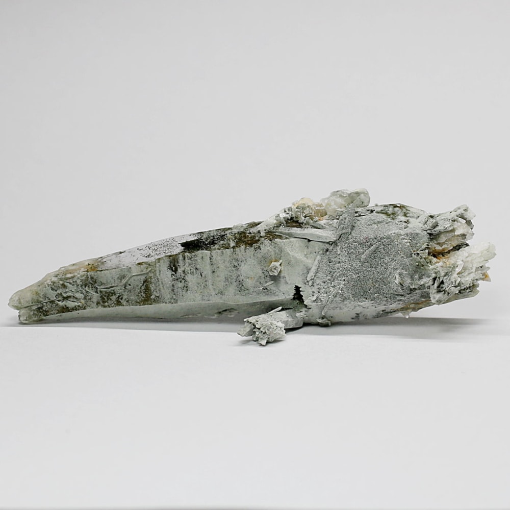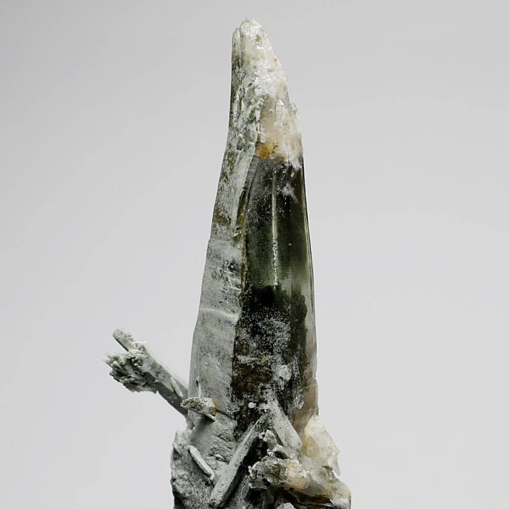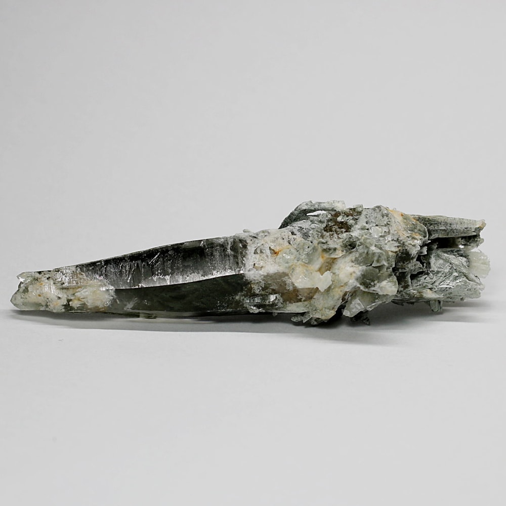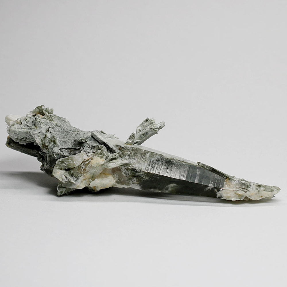 ご覧のお品は、水晶クラスターの概念を覆すほど個性的なディテールを持つ逸品。ガネッシュヒマール特有のクローライトに目を奪われがちですが、実はその下の結晶は驚くほど透明度が高く、内包する庭園のような緑泥石、光を跳ね返すような照りも一級品。このギャップが、もはや「憎たらしい」ほどに美しい!