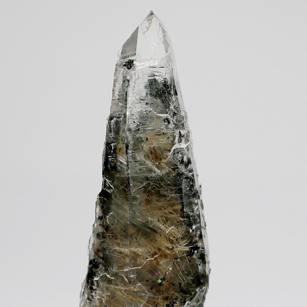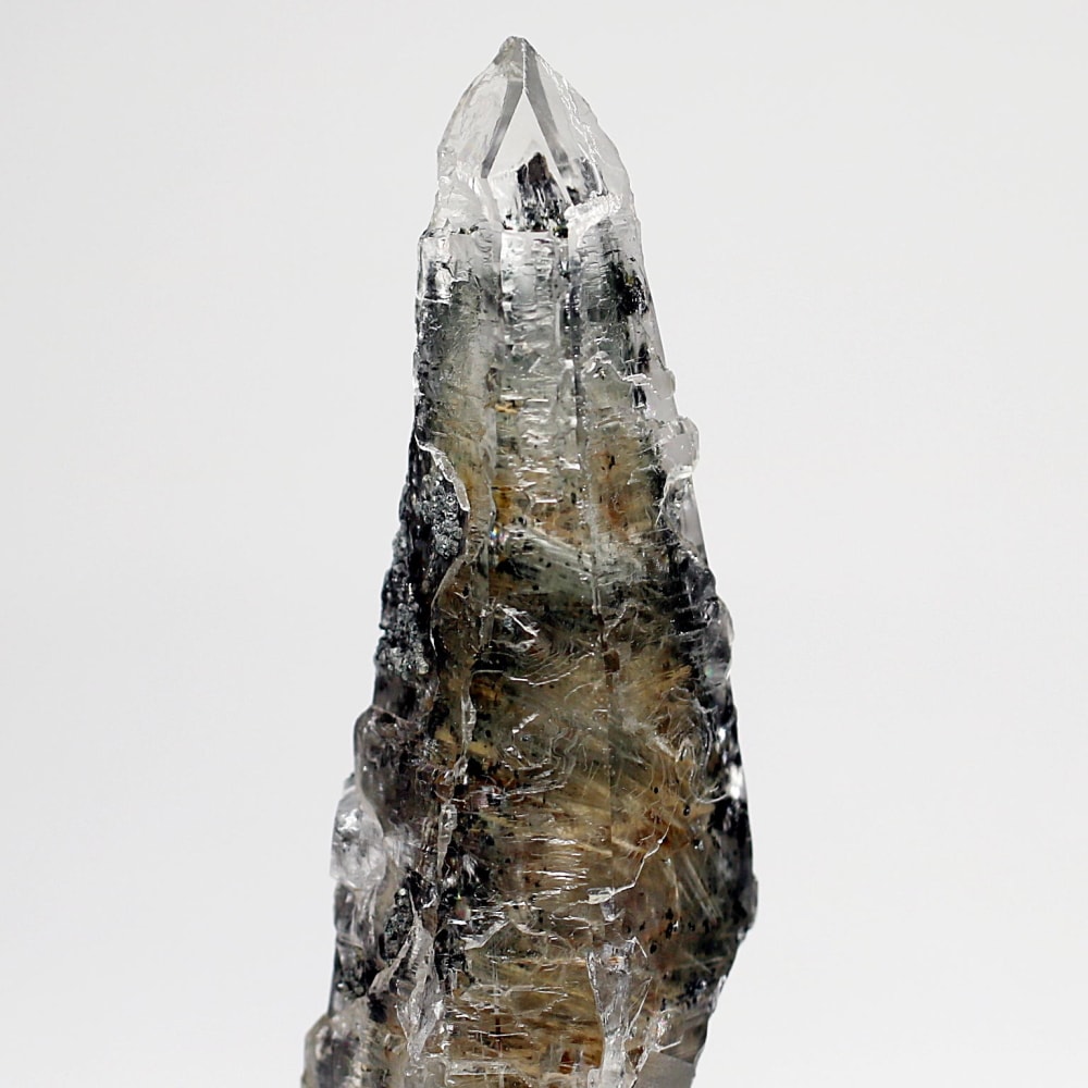 ご覧のお品は、長い年月の中で熱水や圧力により、腐食や再結晶を繰り返し完成した異形とも言える個性的なディテールを持つ逸品です。結晶内部にインクルージョンされた針状の角閃石と緑色のクローライトが織り成す重層的な模様が、ガネッシュヒマールという地の力強い存在感を静かに物語っています。
