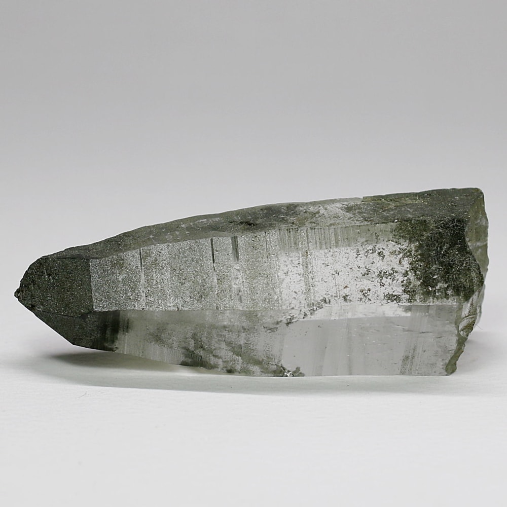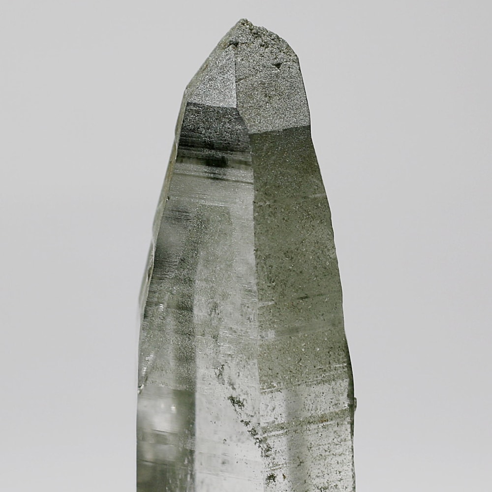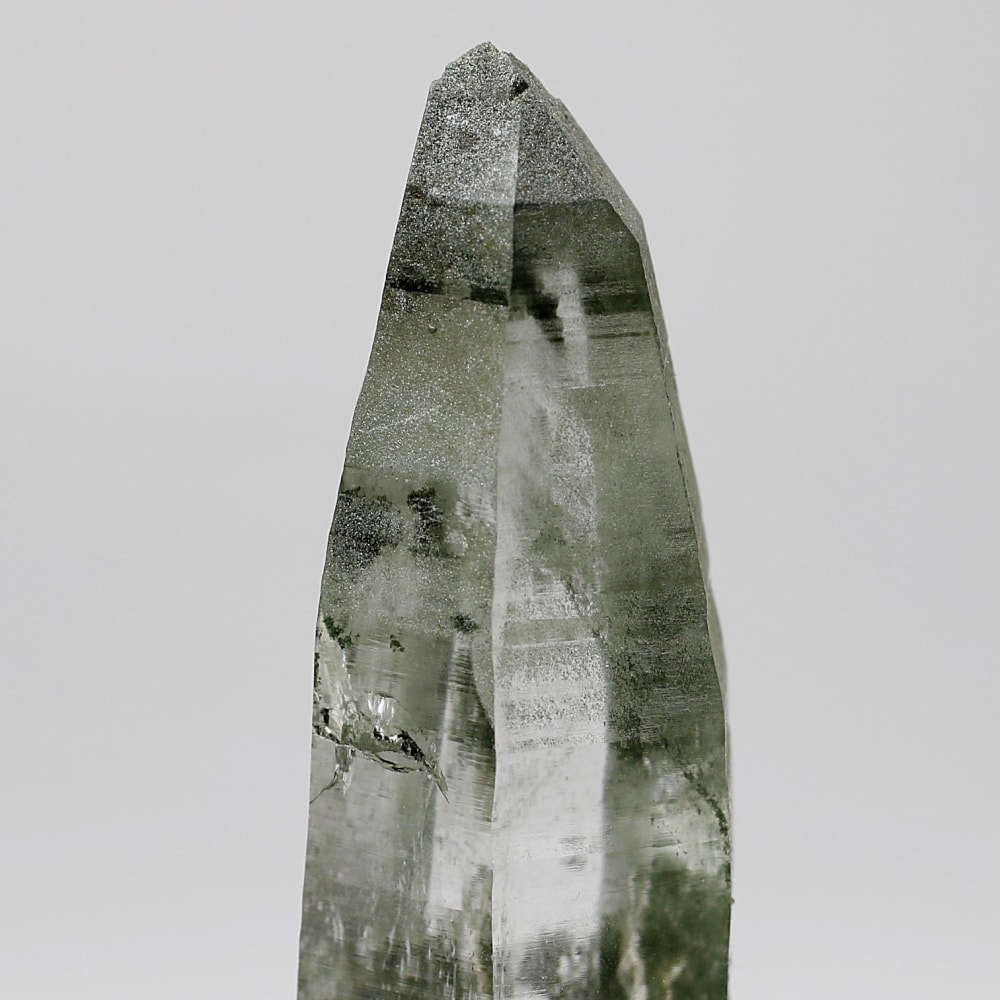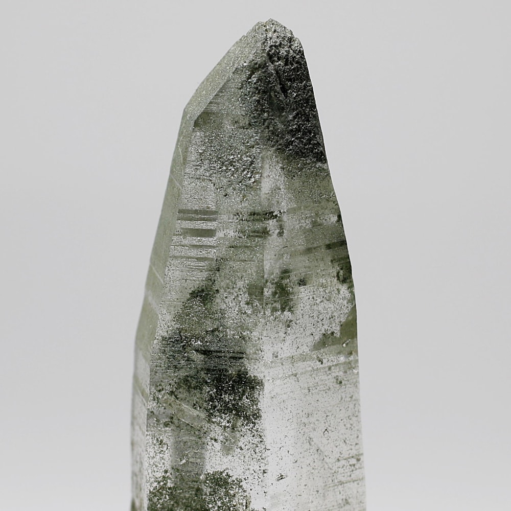 ご覧のお品は、水晶ポイントにクローライト(緑泥石)が美しく付着した、ガネッシュヒマール産ならではの魅力を堪能できる逸品です。先端へ向かって鋭く伸びる結晶と、それを覆う深いグリーンは、『水晶は透明なもの』という既成概念を鮮やかに覆してくれます。