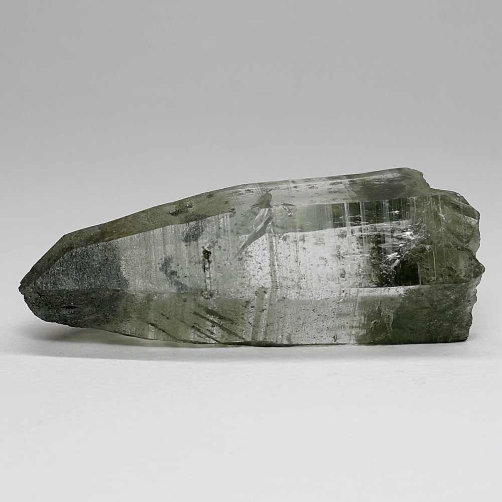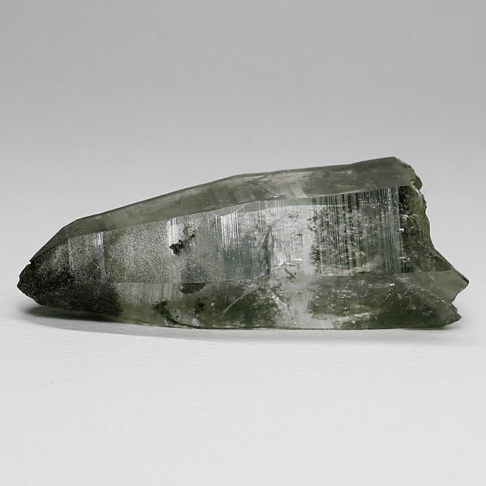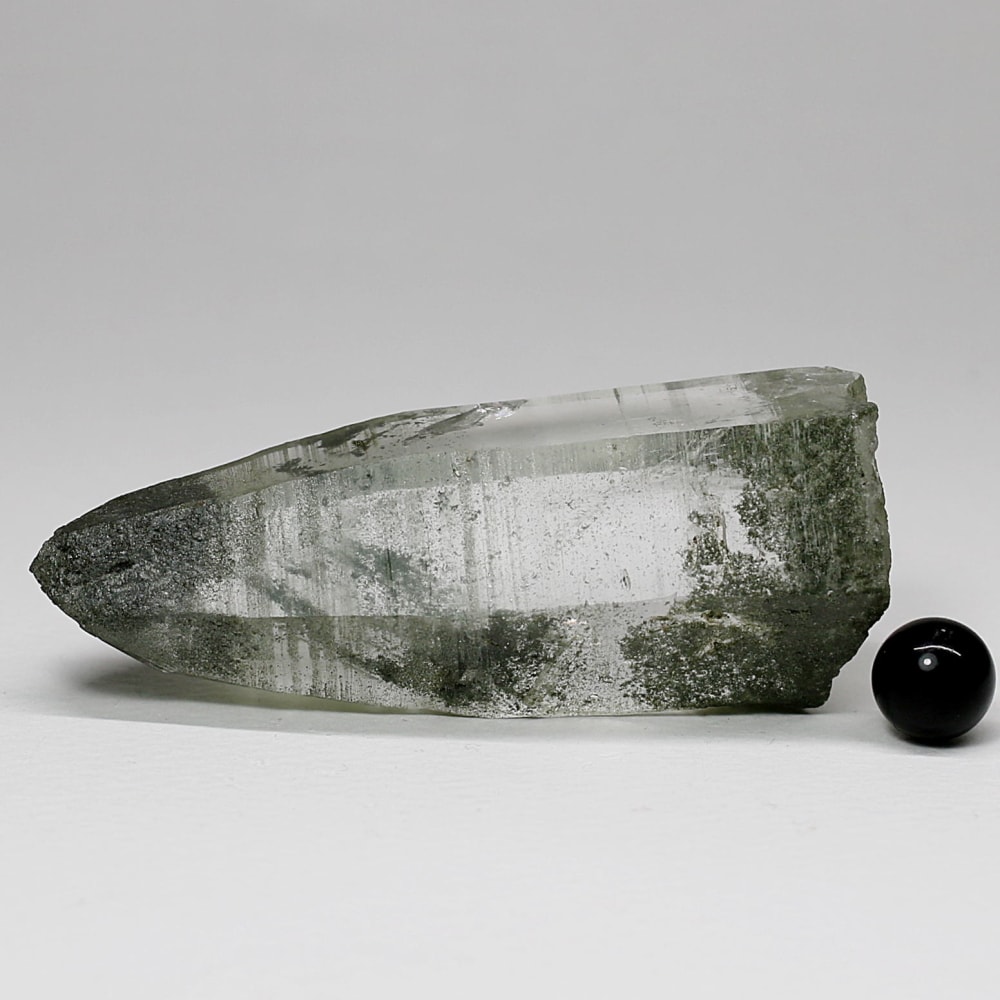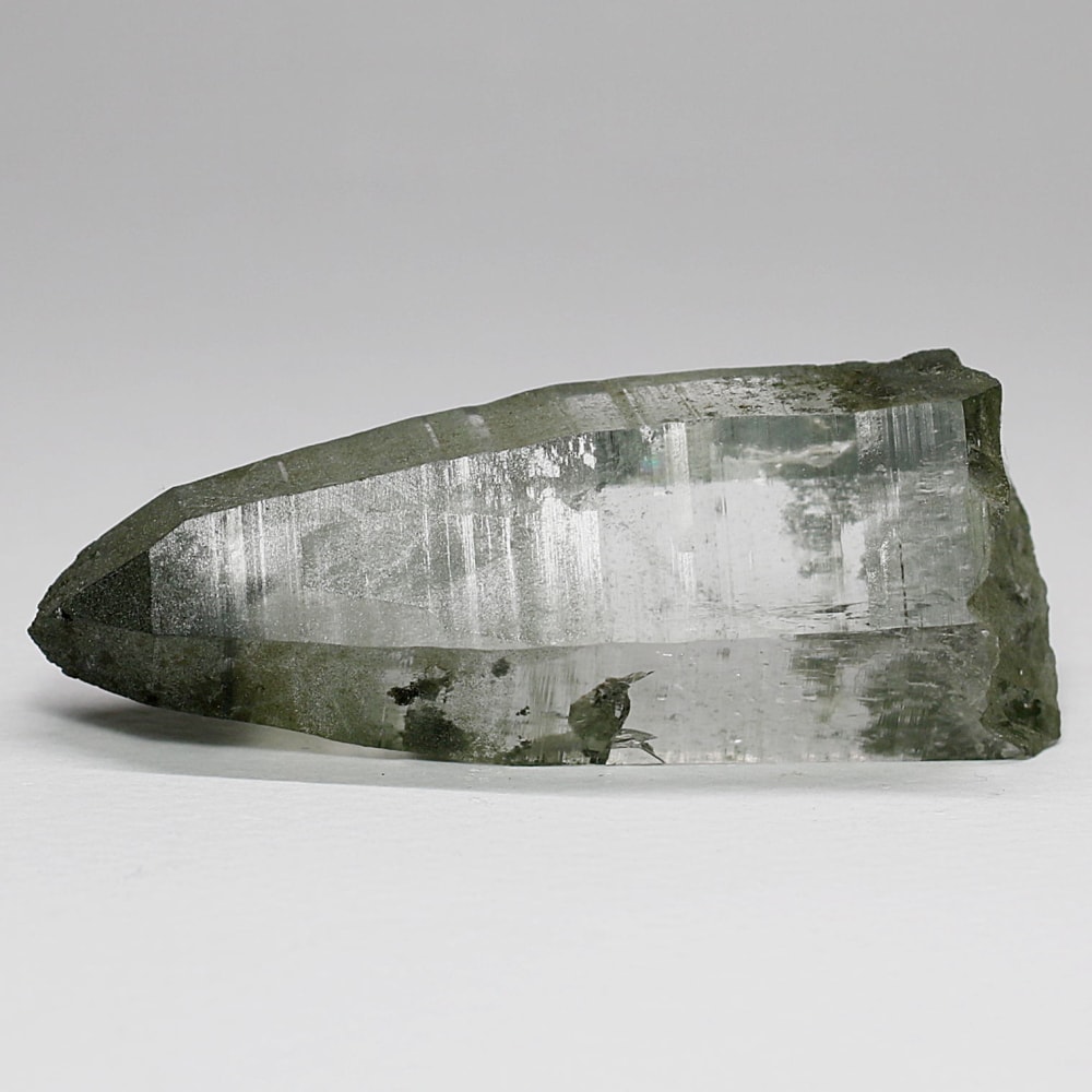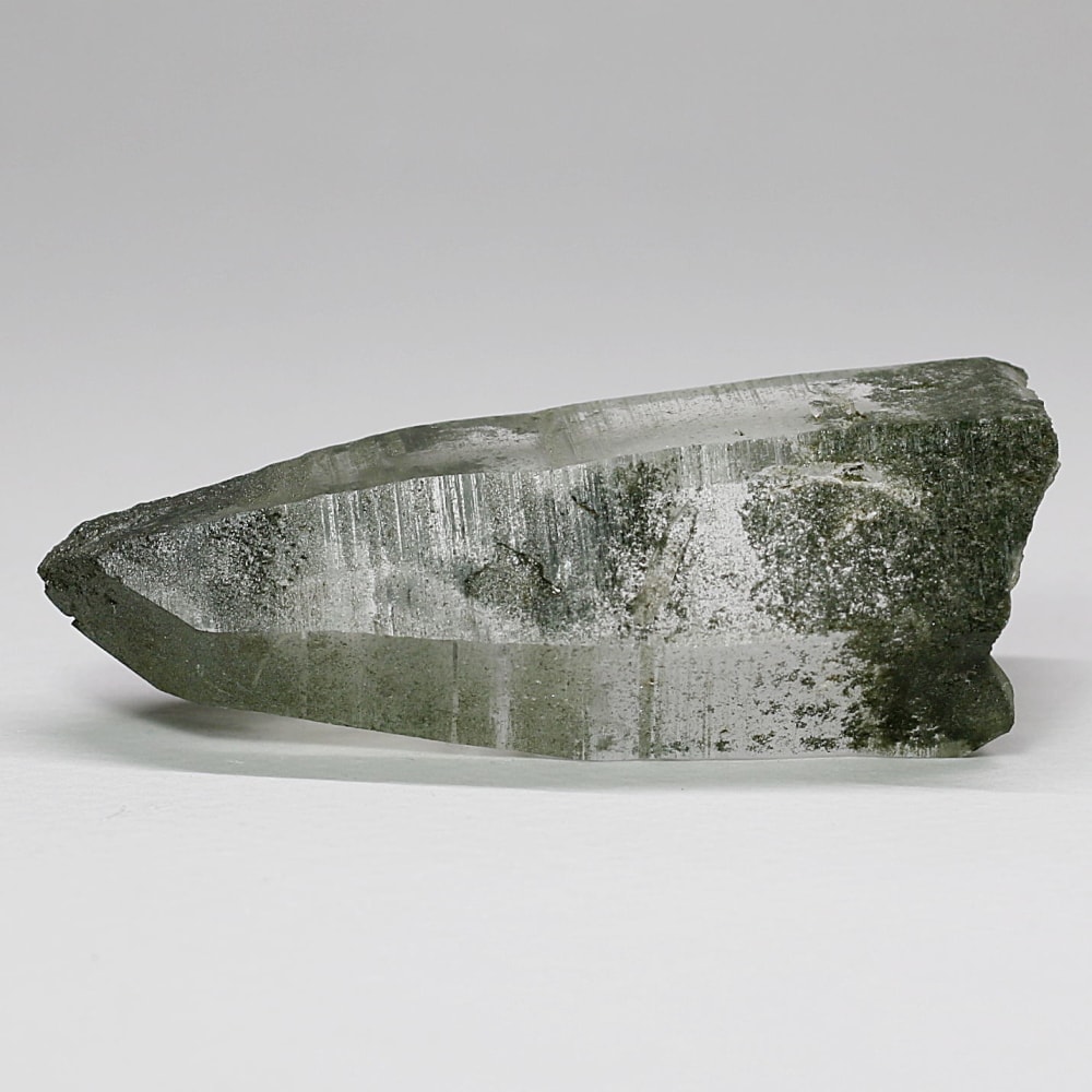 ご覧のお品は、水晶ポイントにクローライト(緑泥石)が美しく付着した、ガネッシュヒマール産ならではの魅力を堪能できる逸品です。先端へ向かって鋭く伸びる結晶と、それを覆う深いグリーンは、『水晶は透明なもの』という既成概念を鮮やかに覆してくれます。