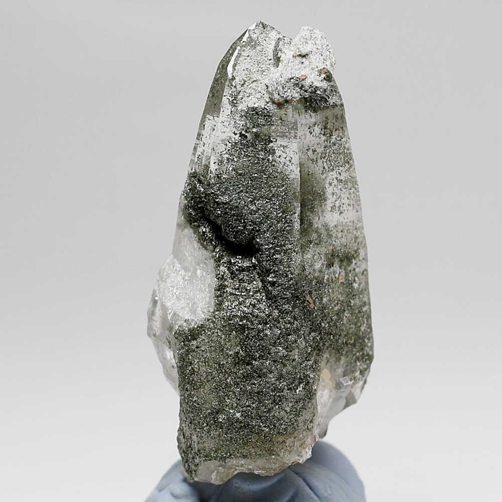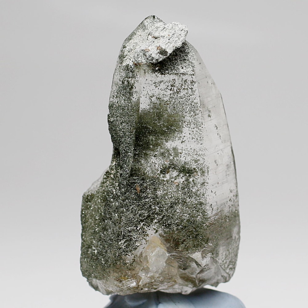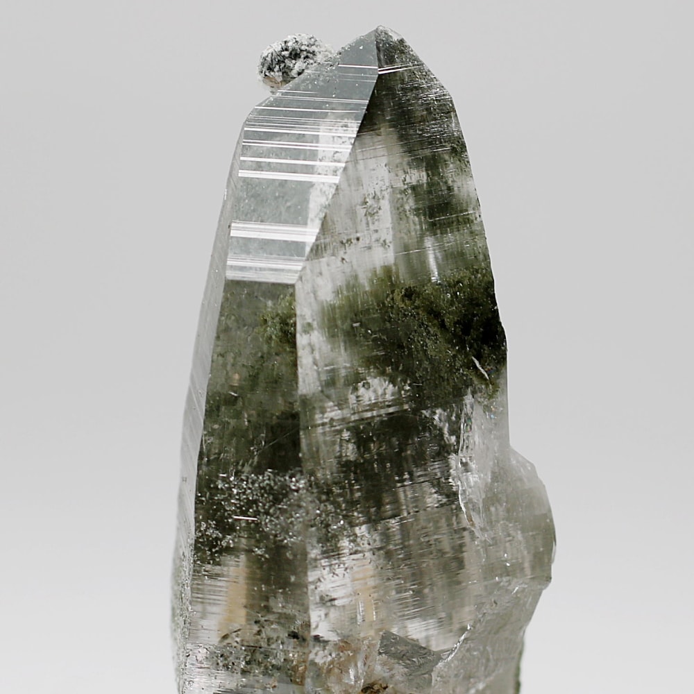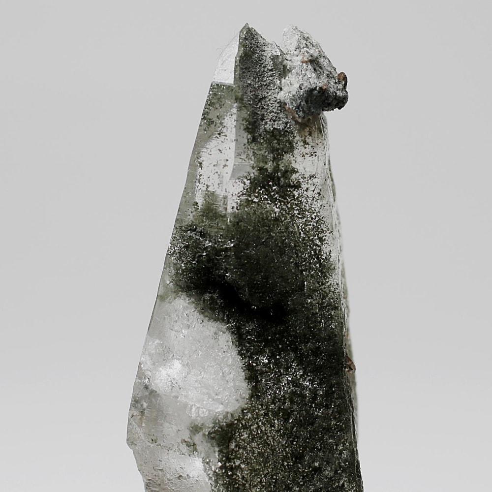 ご覧のお品は、水晶クラスターの概念を覆すほど個性的なディテールを持つ逸品。ガネッシュヒマール特有のクローライトに目を奪われがちですが、実はその下の結晶は驚くほど透明度が高く、内包する庭園のような緑泥石、光を跳ね返すような照りも一級品。このギャップが、もはや「憎たらしい」ほどに美しい!