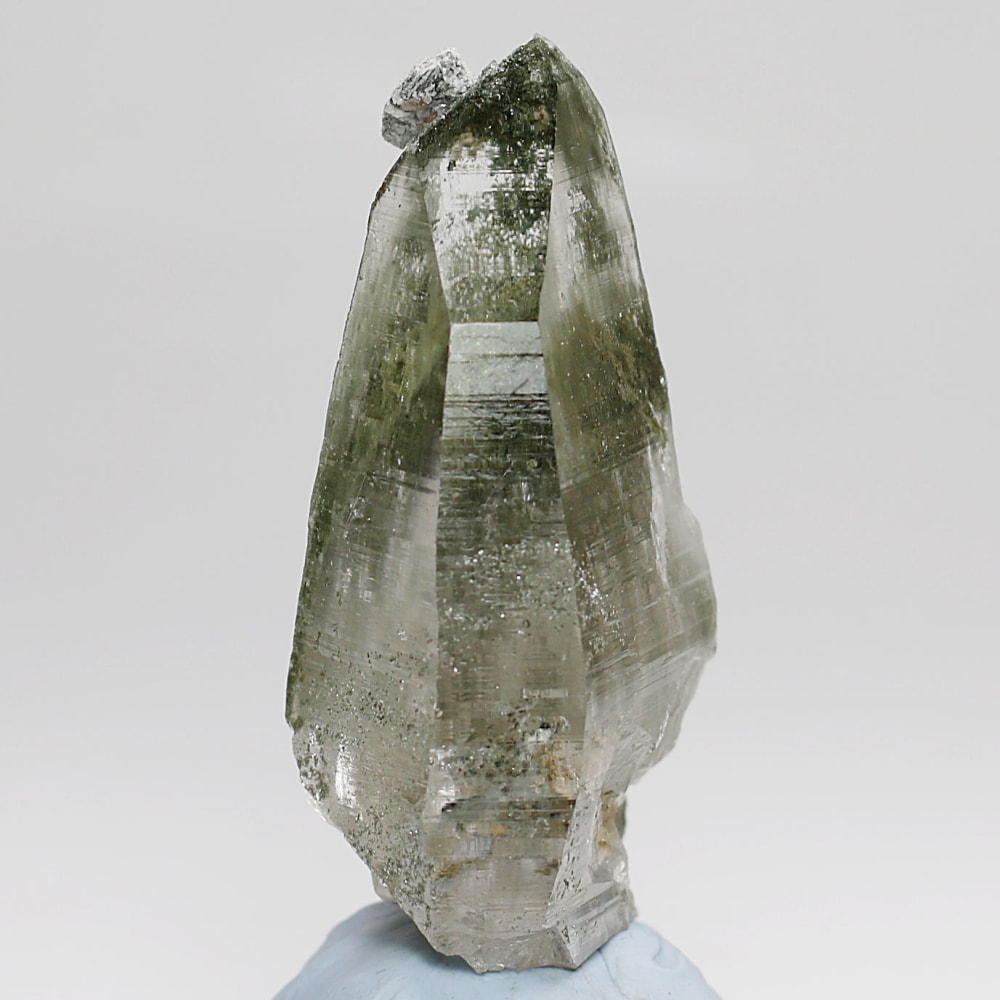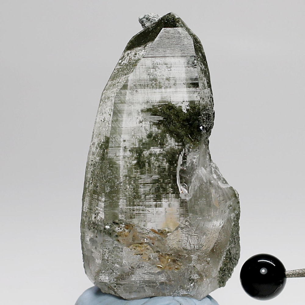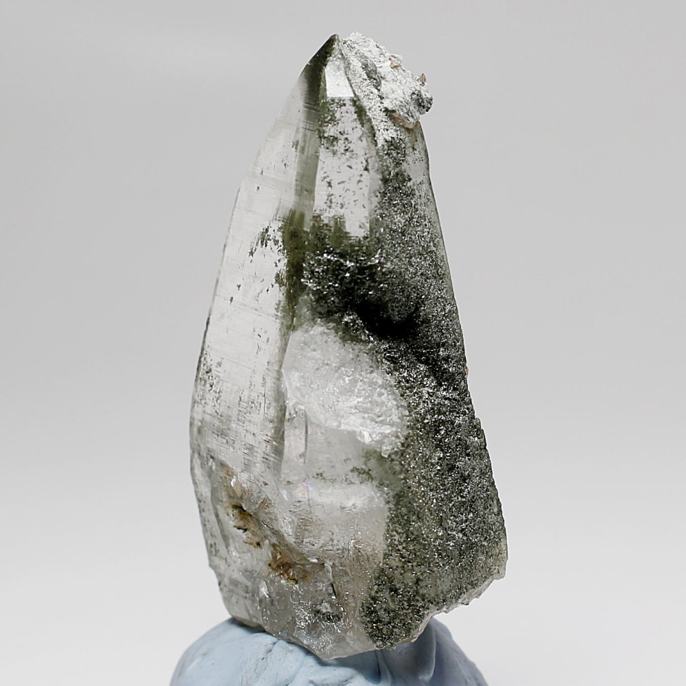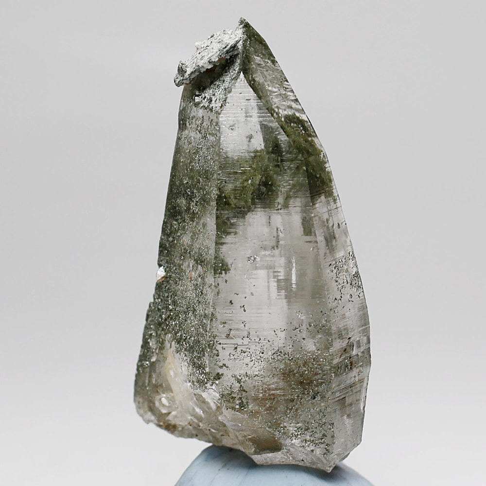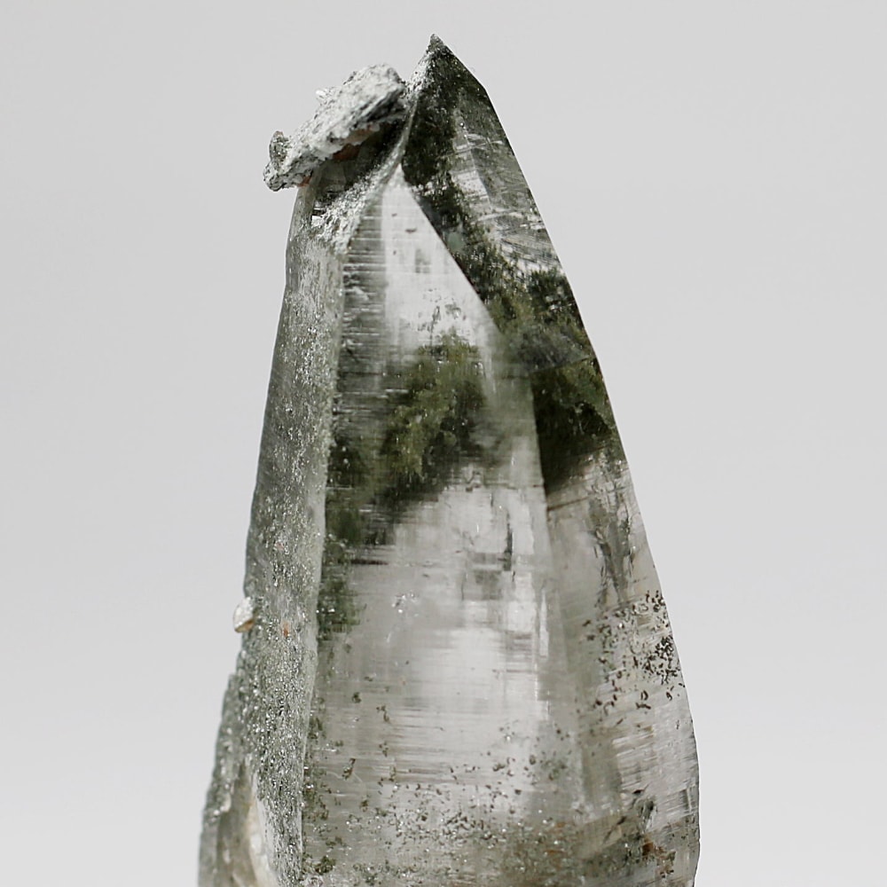 ご覧のお品は、水晶クラスターの概念を覆すほど個性的なディテールを持つ逸品。ガネッシュヒマール特有のクローライトに目を奪われがちですが、実はその下の結晶は驚くほど透明度が高く、内包する庭園のような緑泥石、光を跳ね返すような照りも一級品。このギャップが、もはや「憎たらしい」ほどに美しい!