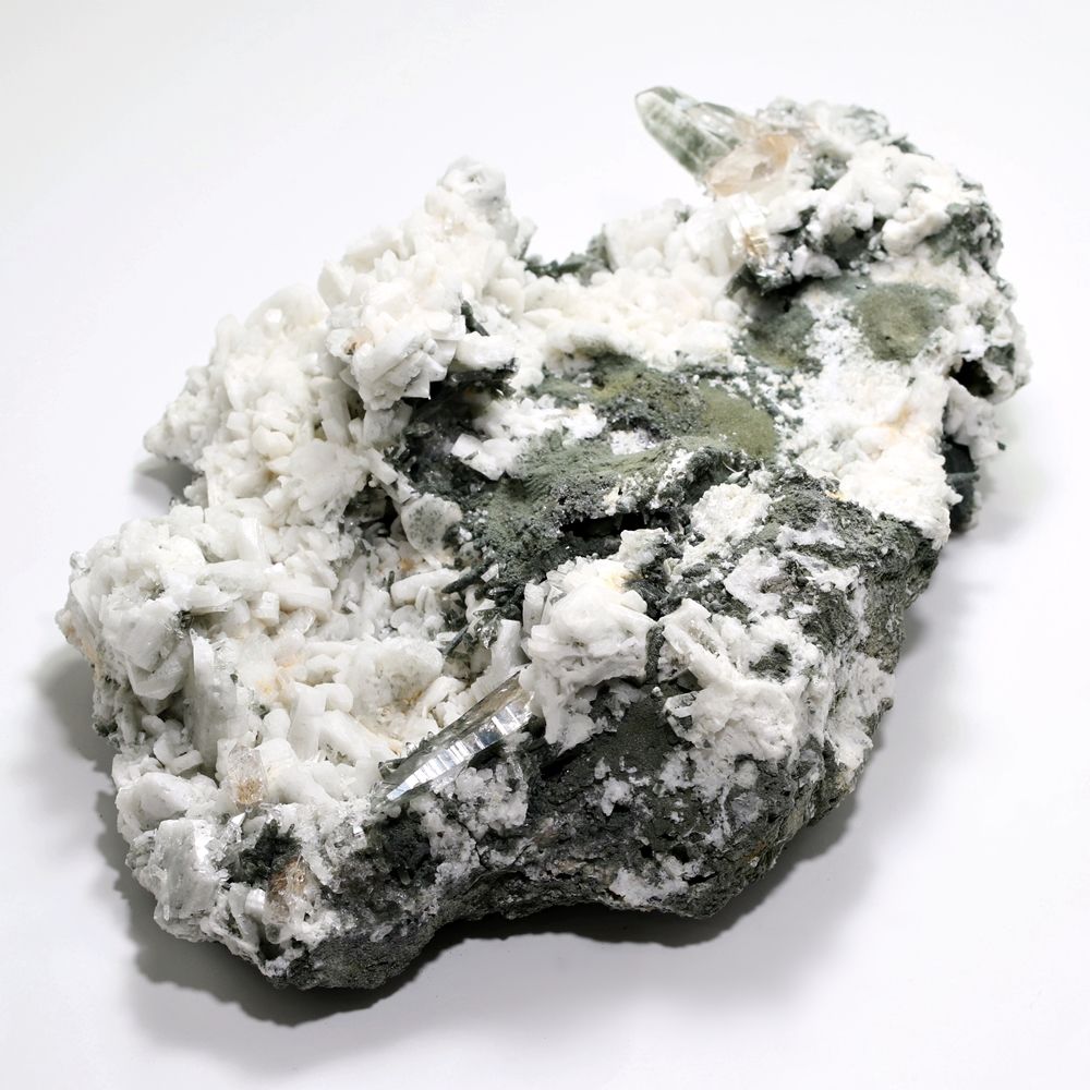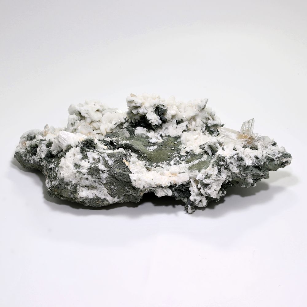 ご覧のお品は、雪原のように真っ白な母岩の上に、透明度高い水晶ポイントが育つ “ガネッシュヒマールのもうひとつの魅力” をご堪能いただける逸品です。