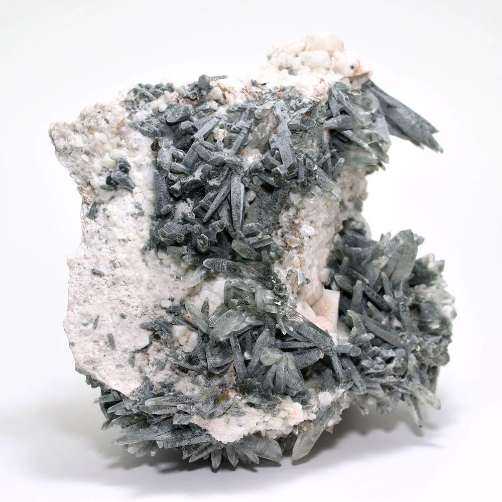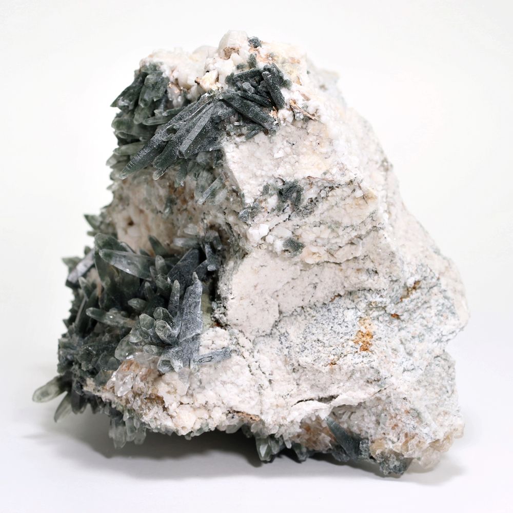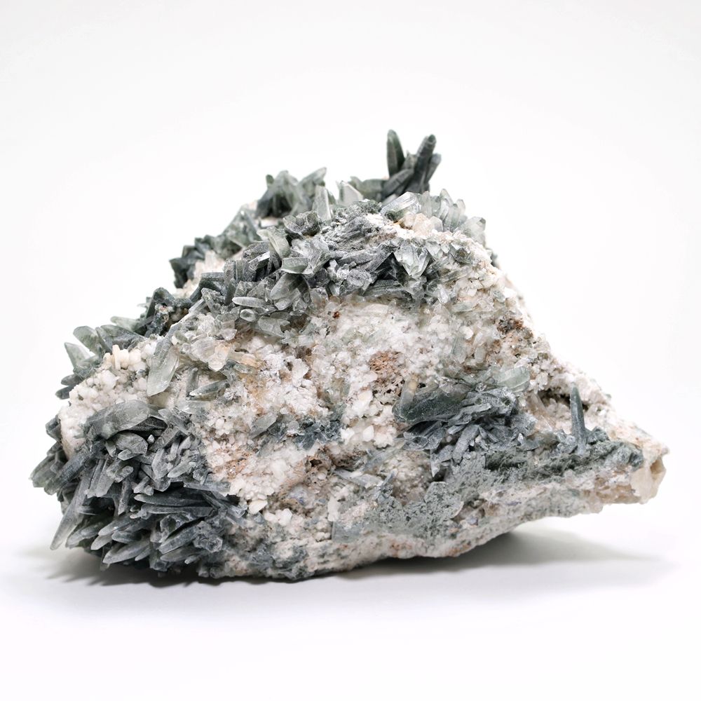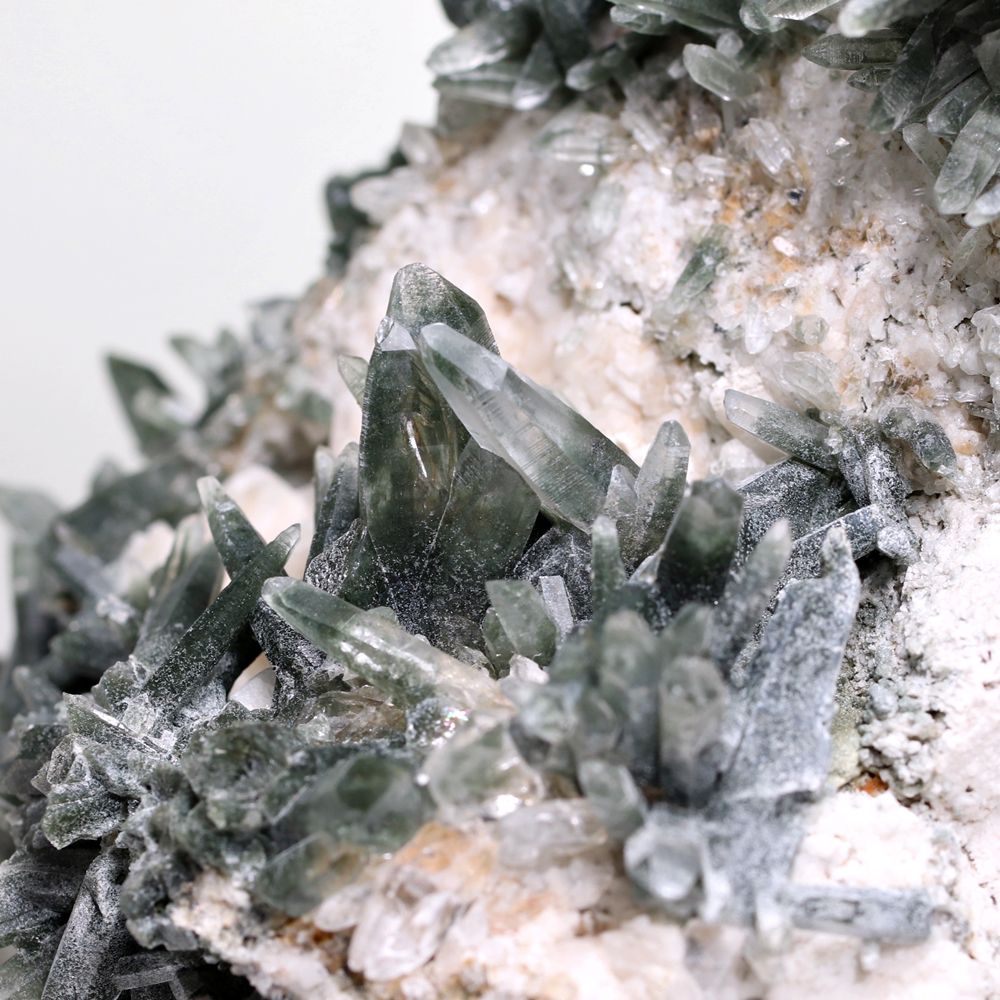 ご覧のお品は、断崖を削りだしたような白い母岩から、深緑に覆われた鋭いニードルクォーツが一定方向に集中して育つ “ガネッシュヒマール産らしくも個性的なディテール” をご堪能いただける逸品です。