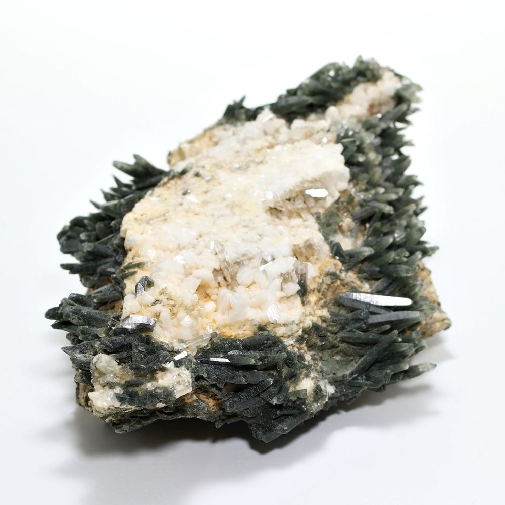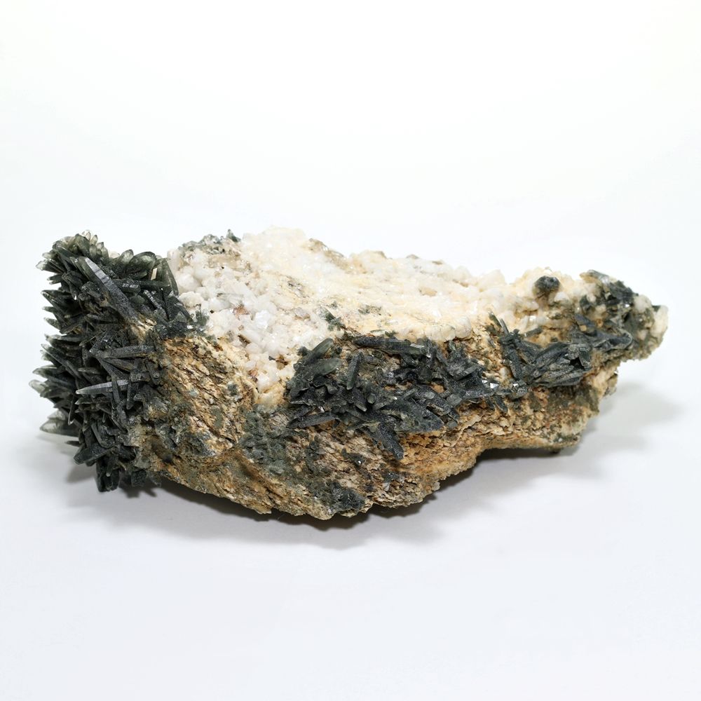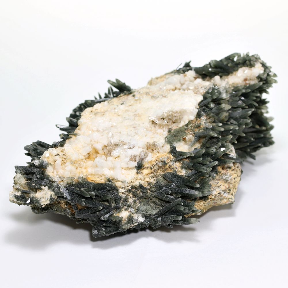 ご覧のお品は、母岩を中心に、深緑に覆われた鋭いニードルクォーツが放射状に育つ、他に類を見ない非常に個性的なディテールを持つ逸品です。