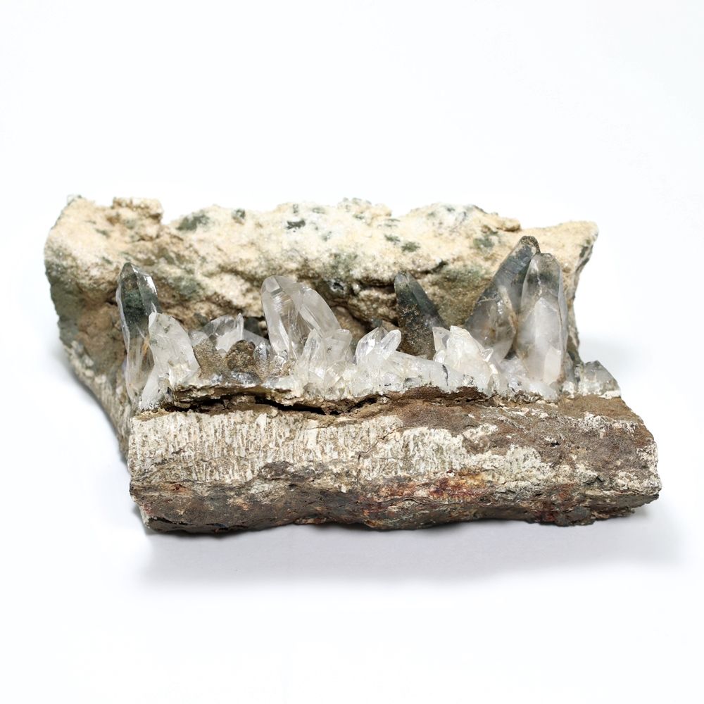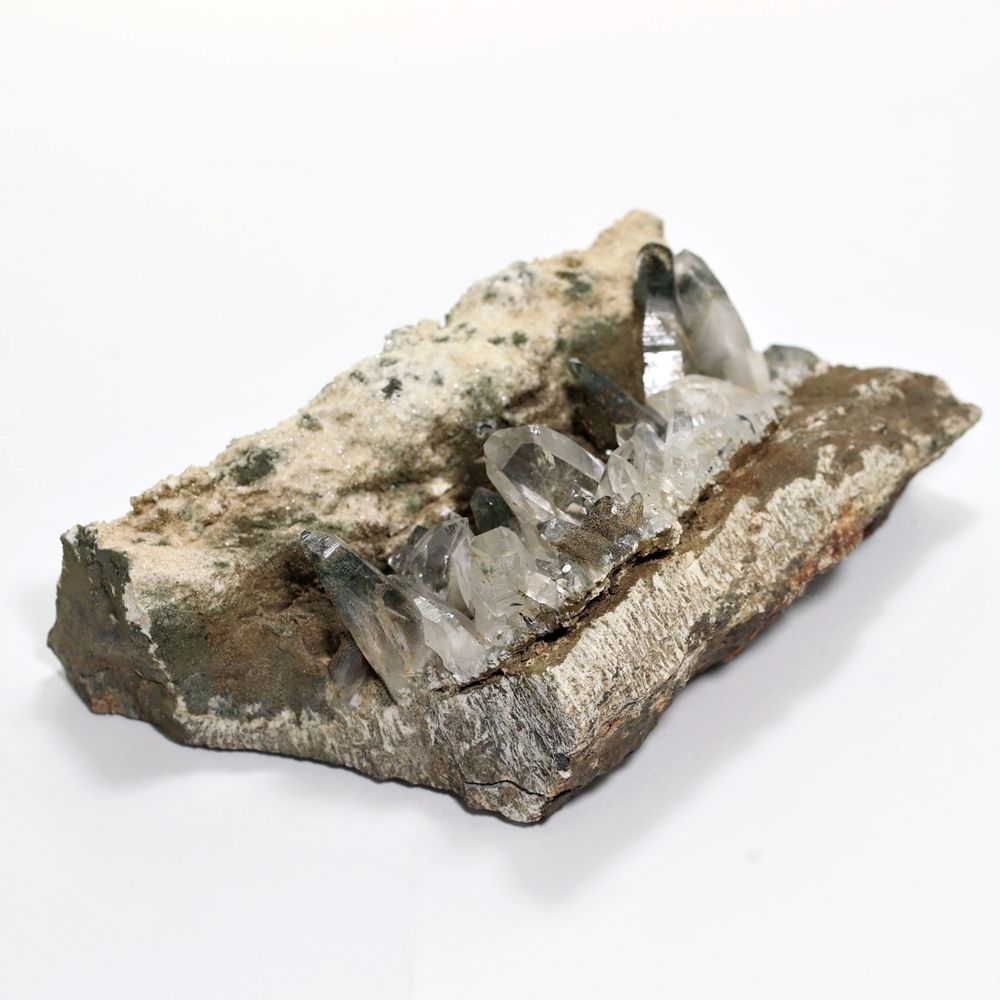 ご覧のお品は、まるでホットドッグのような形状の母岩に、透明度高い水晶ポイントが育つ、他に類を見ない大変個性的な逸品です。