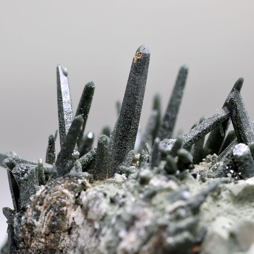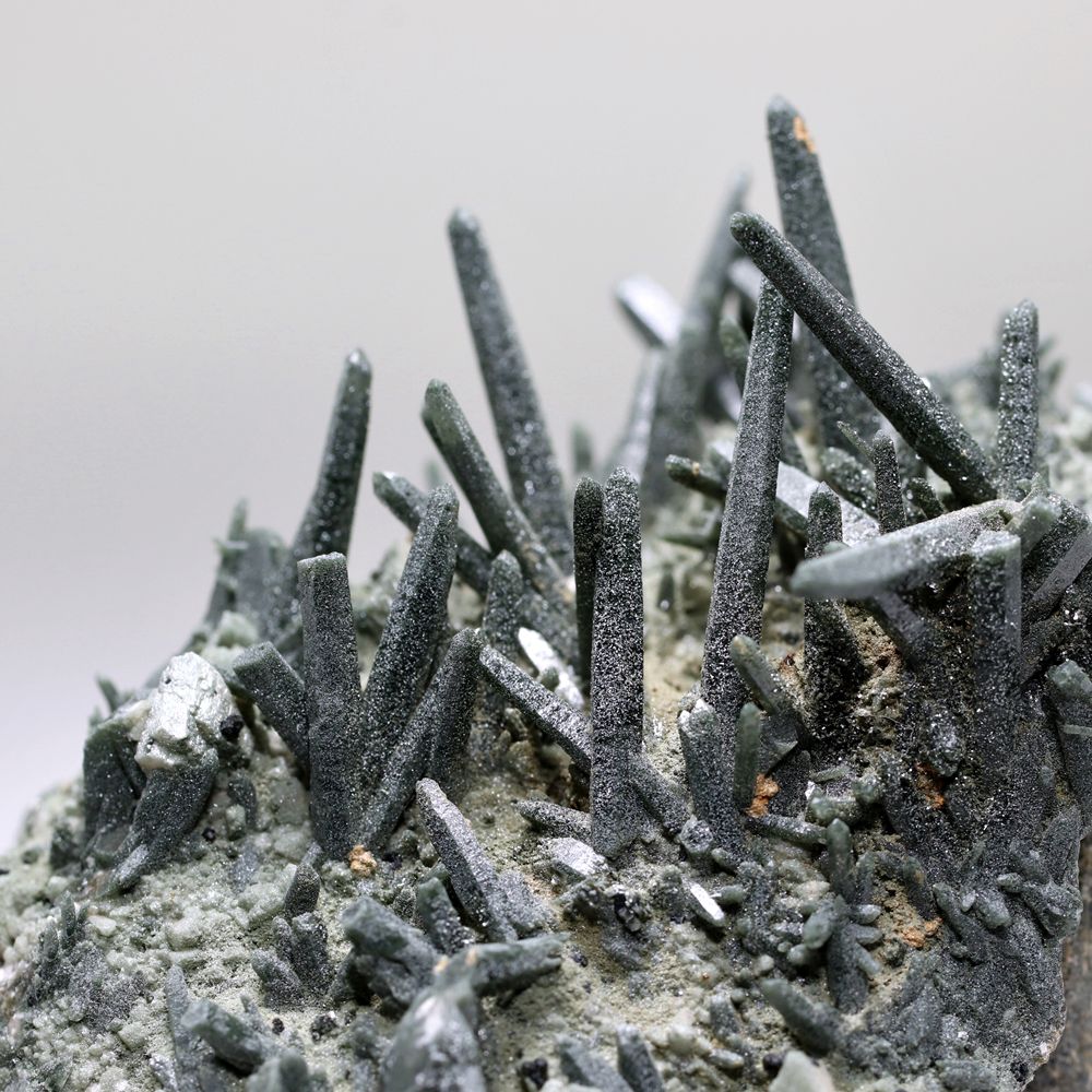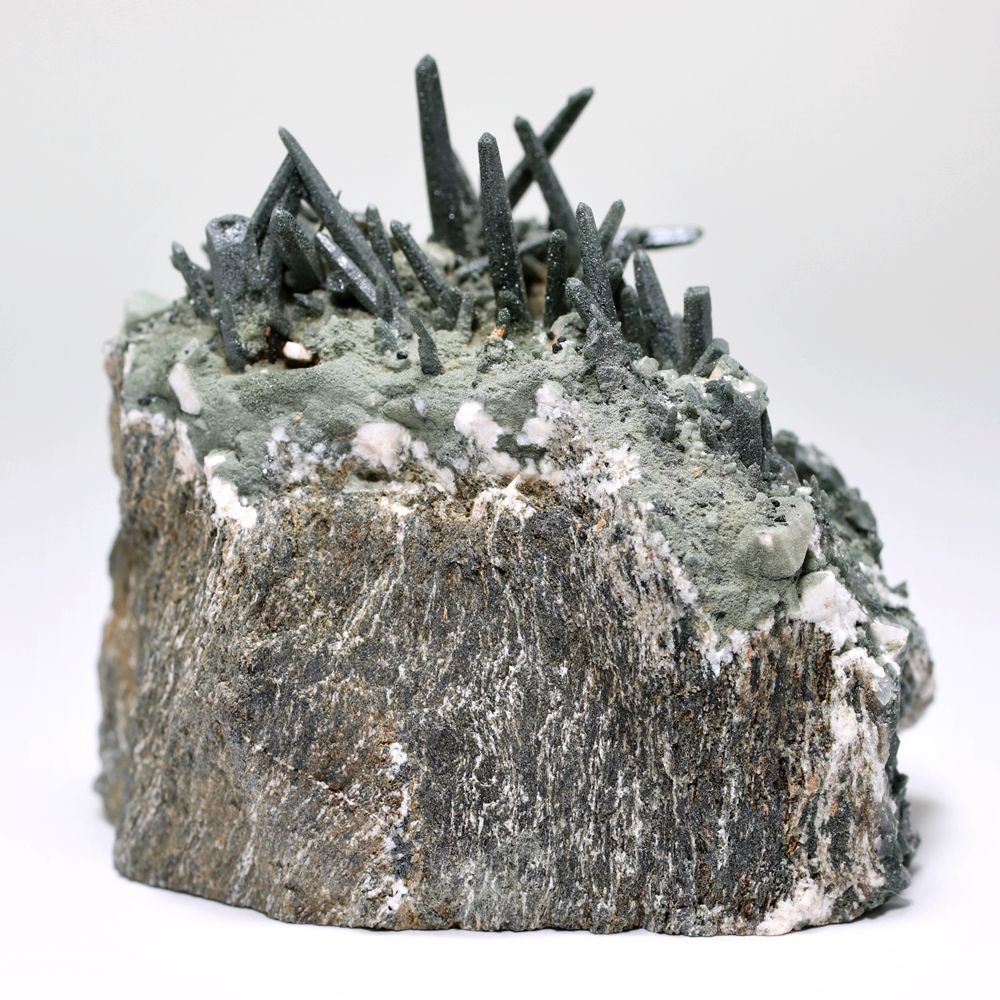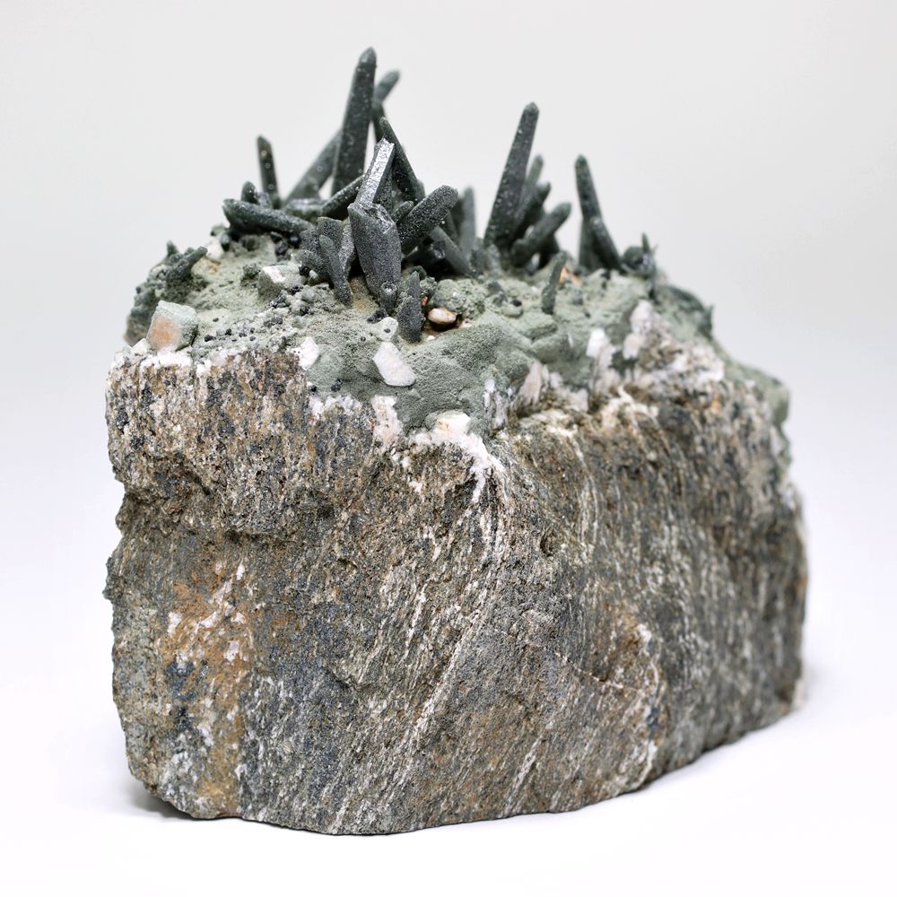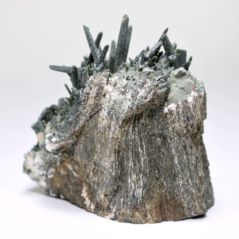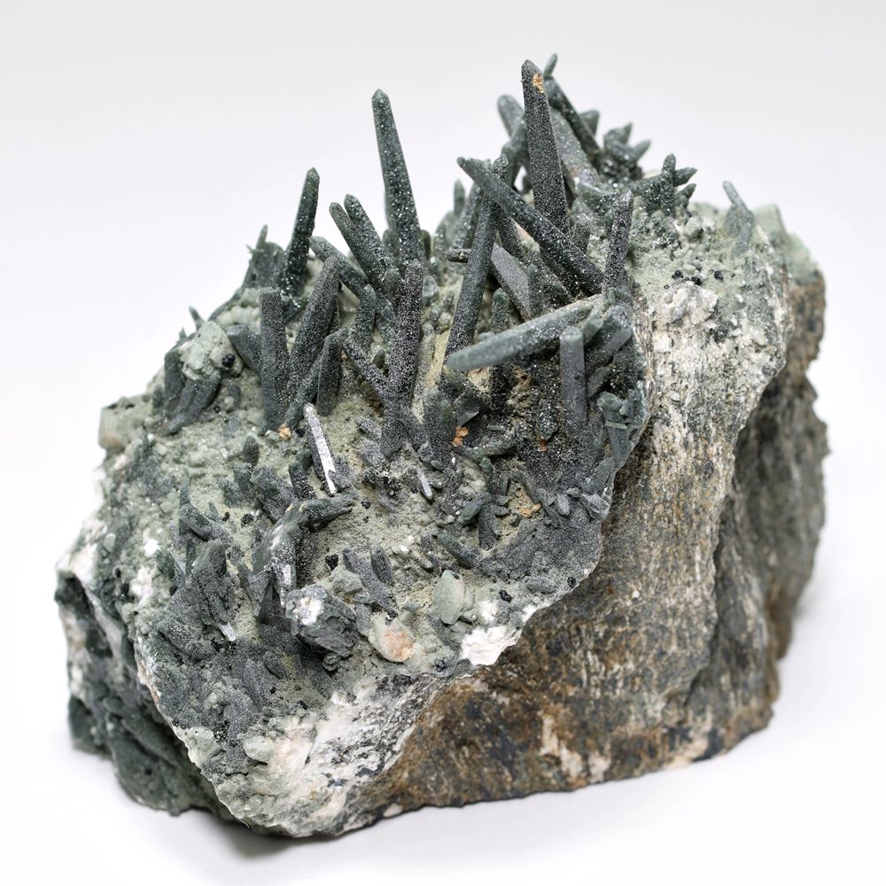 ご覧のお品は、無骨な母岩の上に、深緑に覆われた鋭いニードルクォーツが育つ “ガネッシュヒマール産らしい魅力” をご堪能いただける逸品です。