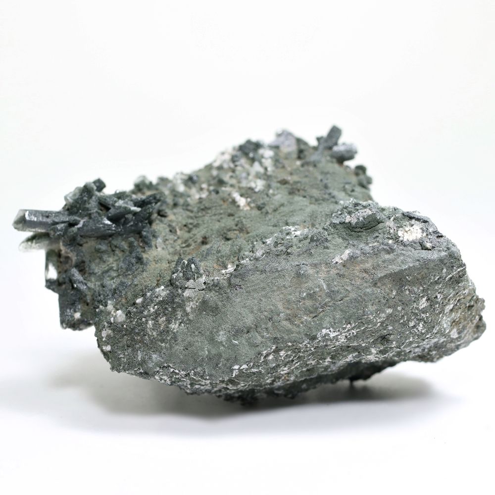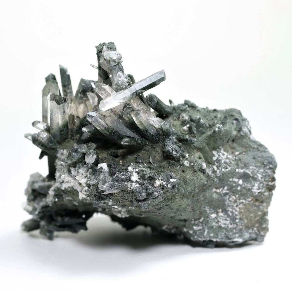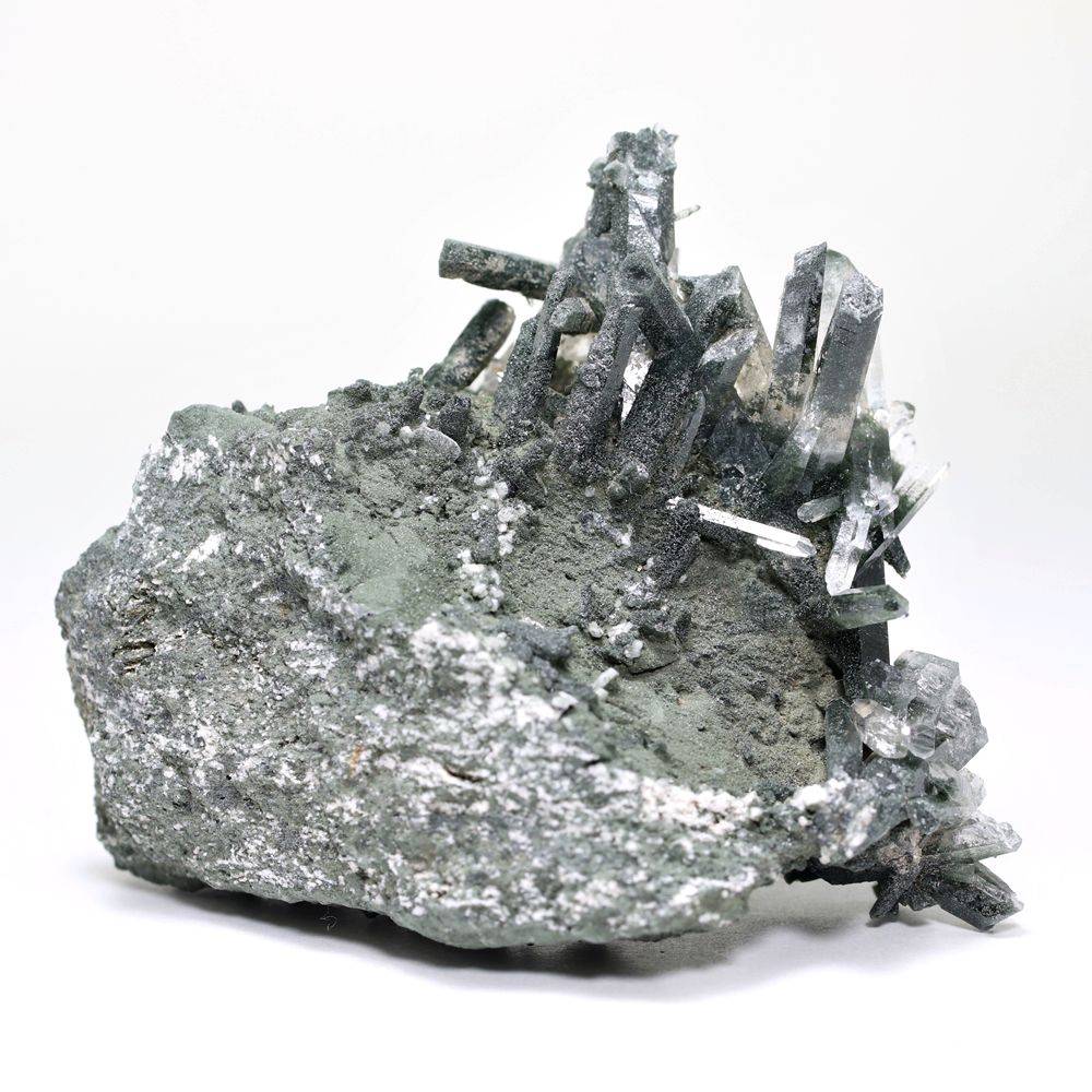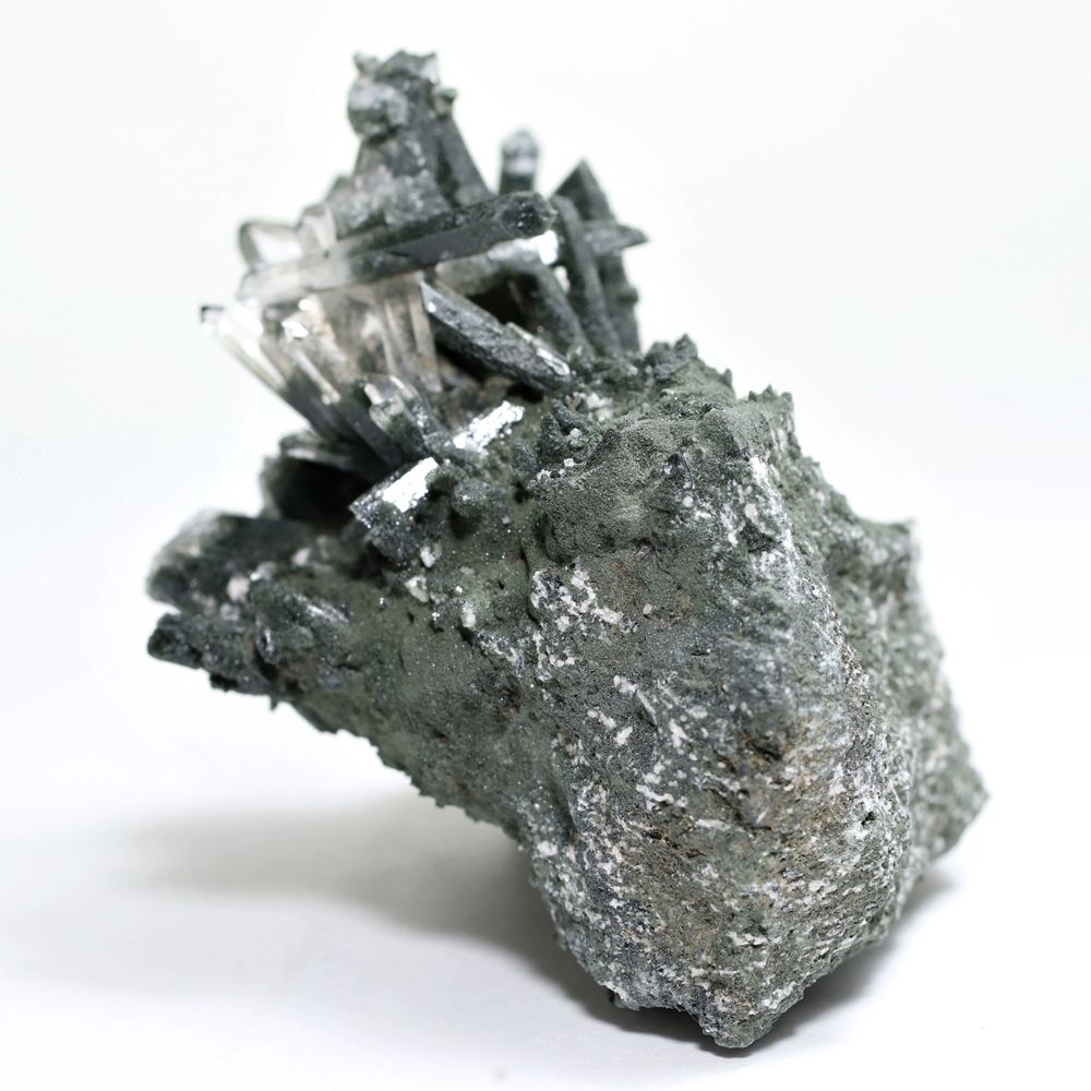 ご覧のお品は、無骨な母岩の上に、深緑に覆われた鋭いニードルクォーツが育つ “ガネッシュヒマール産らしい魅力” をご堪能いただける逸品です。