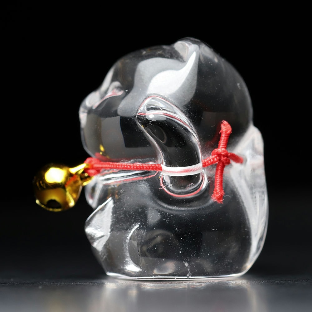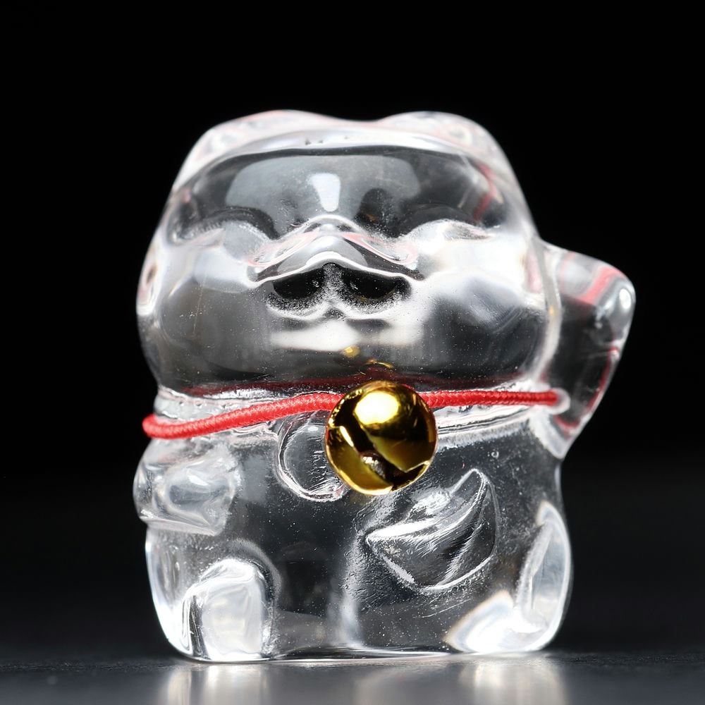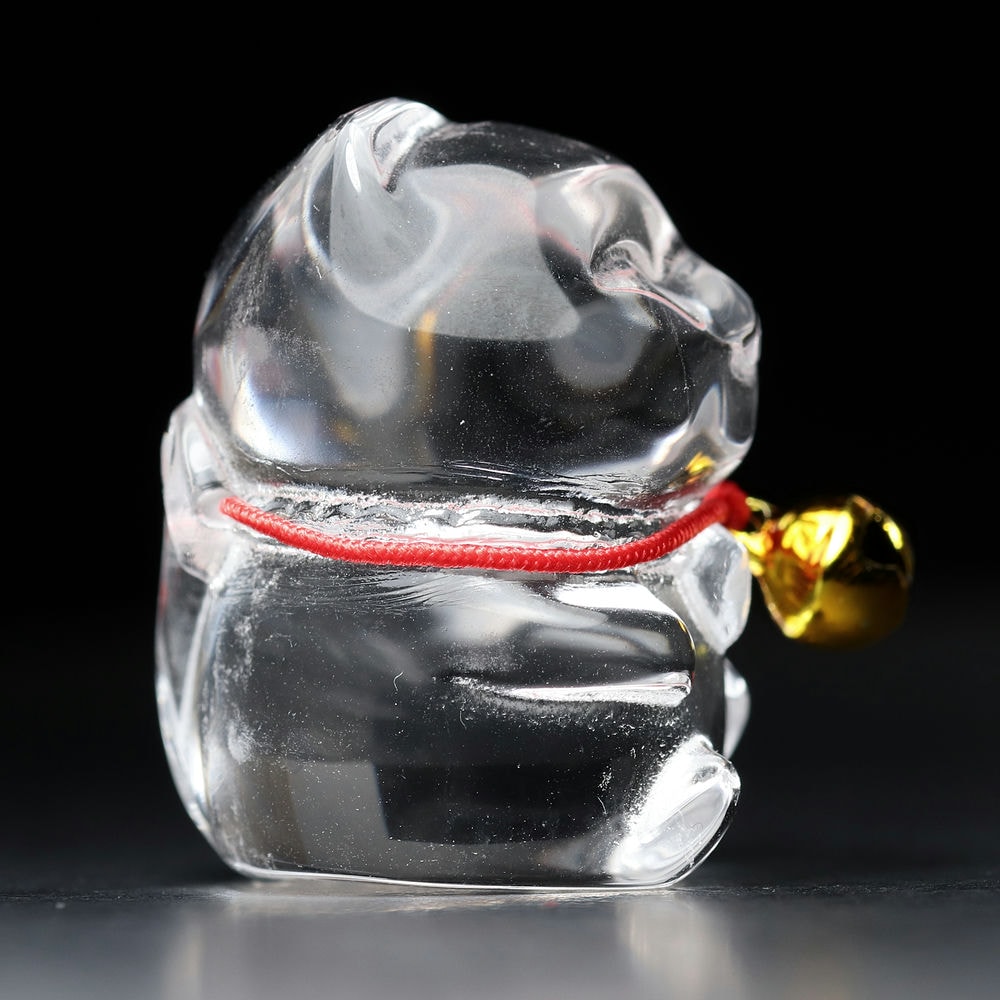 「金の鈴」が付いている「招き猫」は、「水晶」の持つ浄化と開運の力、そして金の鈴が持つ金運と魔除けの力が相乗効果を生み出し、より多くの幸運と繁栄を招く縁起物として伝えられます。