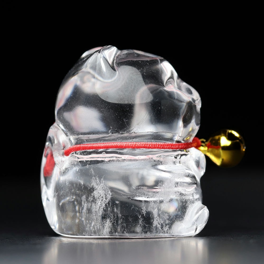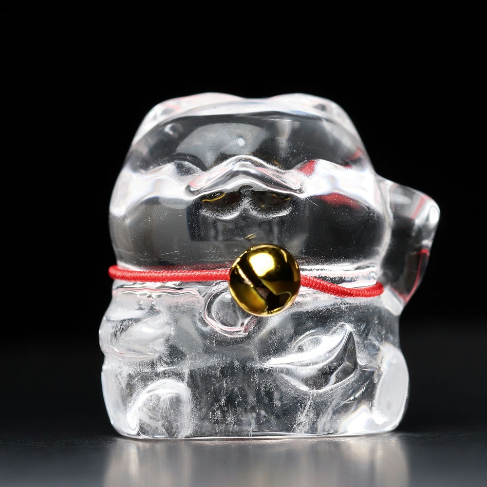 「金の鈴」が付いている「招き猫」は、「水晶」の持つ浄化と開運の力、そして金の鈴が持つ金運と魔除けの力が相乗効果を生み出し、より多くの幸運と繁栄を招く縁起物として伝えられます。