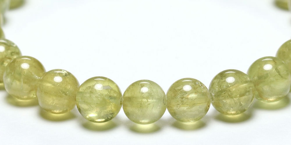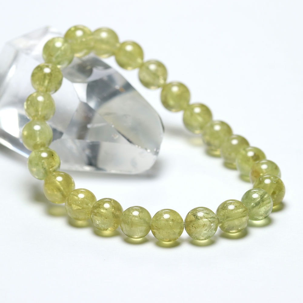 そんな中、ご覧のグリーンガーネットは透明感があり、ライムグリーンカラーが発色良く出ている高品質粒で組み上げたブレスレットに仕上がっております。