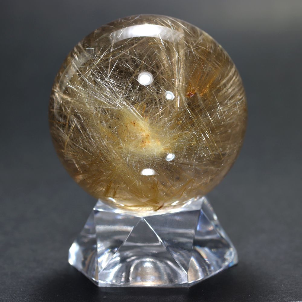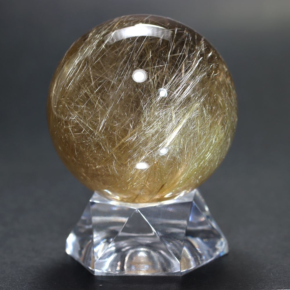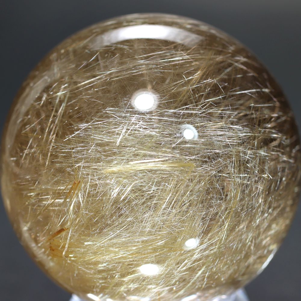 透明度高い水晶内部に内包される、毛並みのように細いルチル針状結晶がスフィアを回すたびに縦横無尽に煌びやかに輝く姿は “これぞルチル” と思える逸品です。