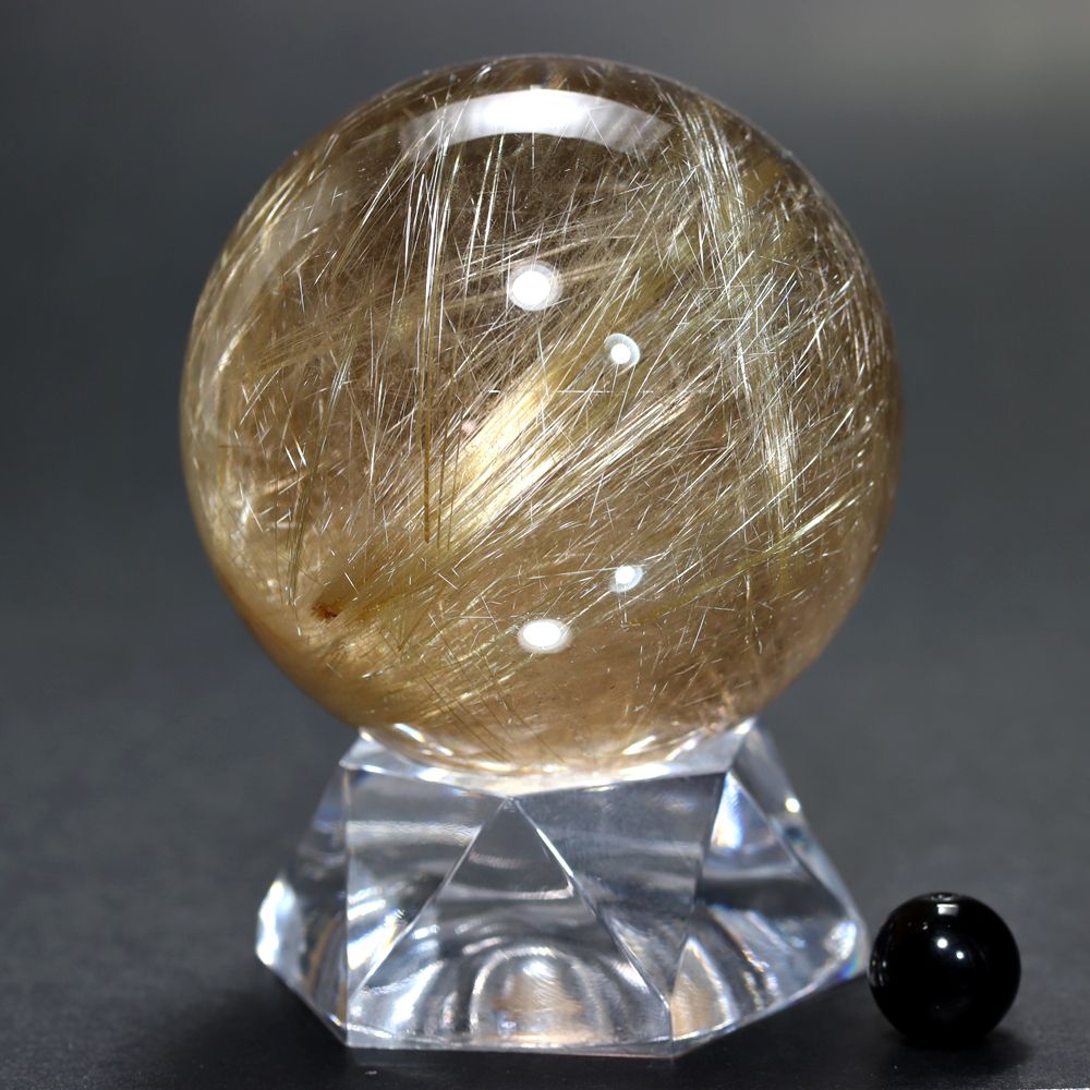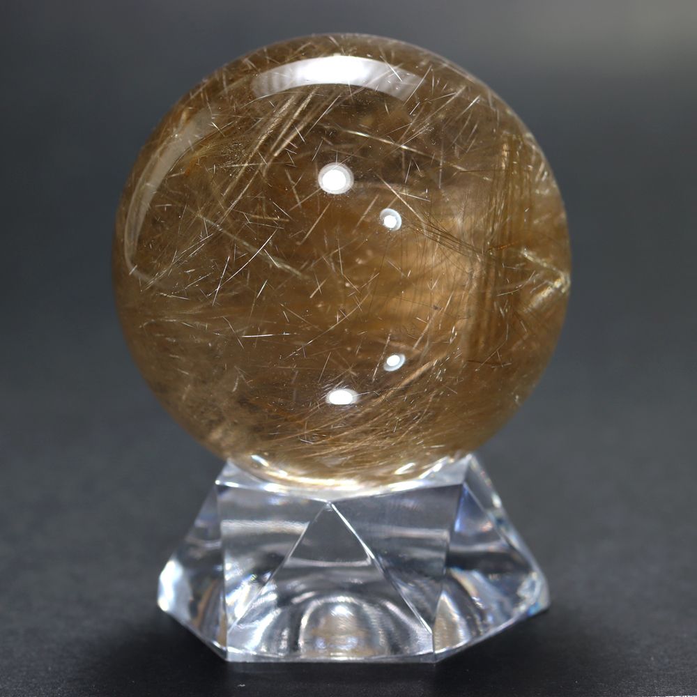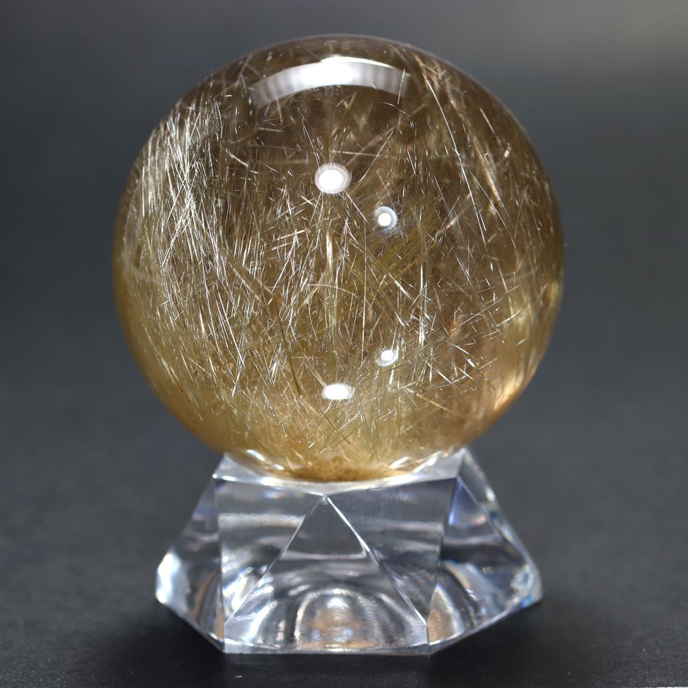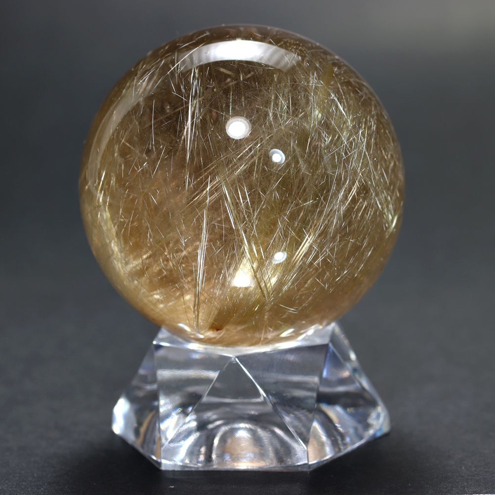透明度高い水晶内部に内包される、毛並みのように細いルチル針状結晶がスフィアを回すたびに縦横無尽に煌びやかに輝く姿は “これぞルチル” と思える逸品です。