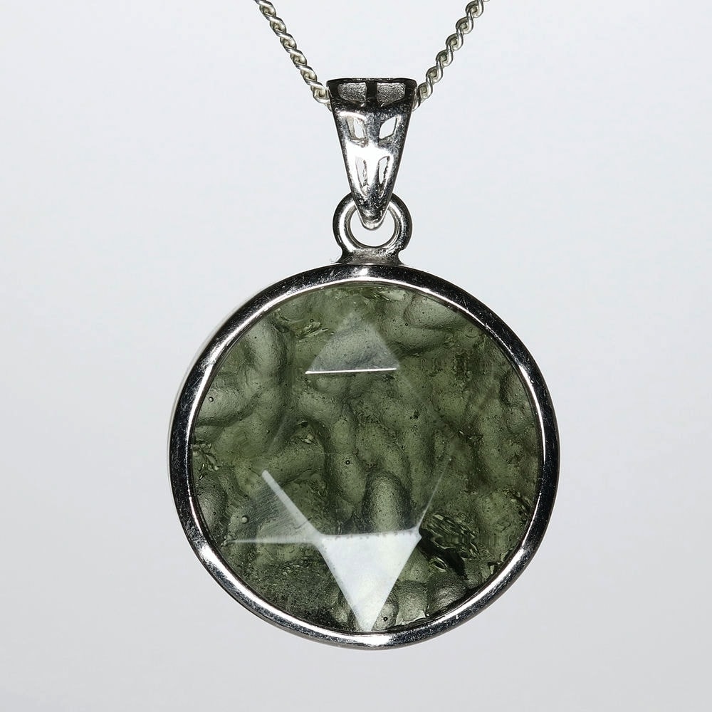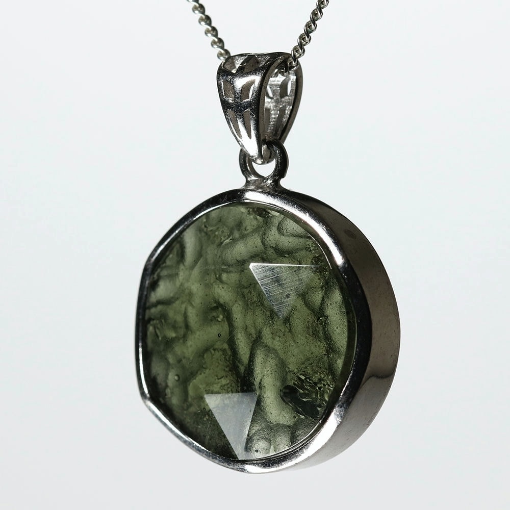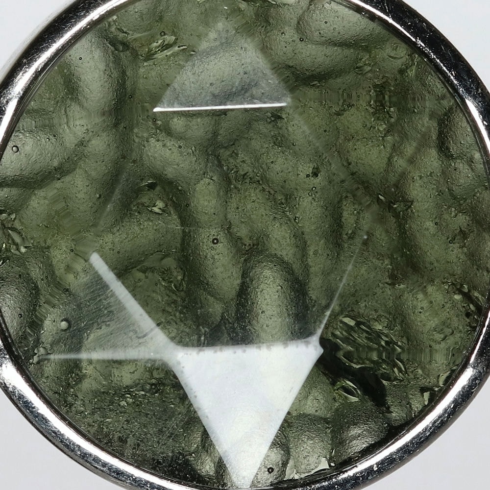 表面は六芒星が浮かび上がるような仕上げとなっており、裏面はモルダバイト独特の形状をそのままにナチュラルな美しさを残しています。透き通るモルダバイトグリーンが本当に美しい逸品です。