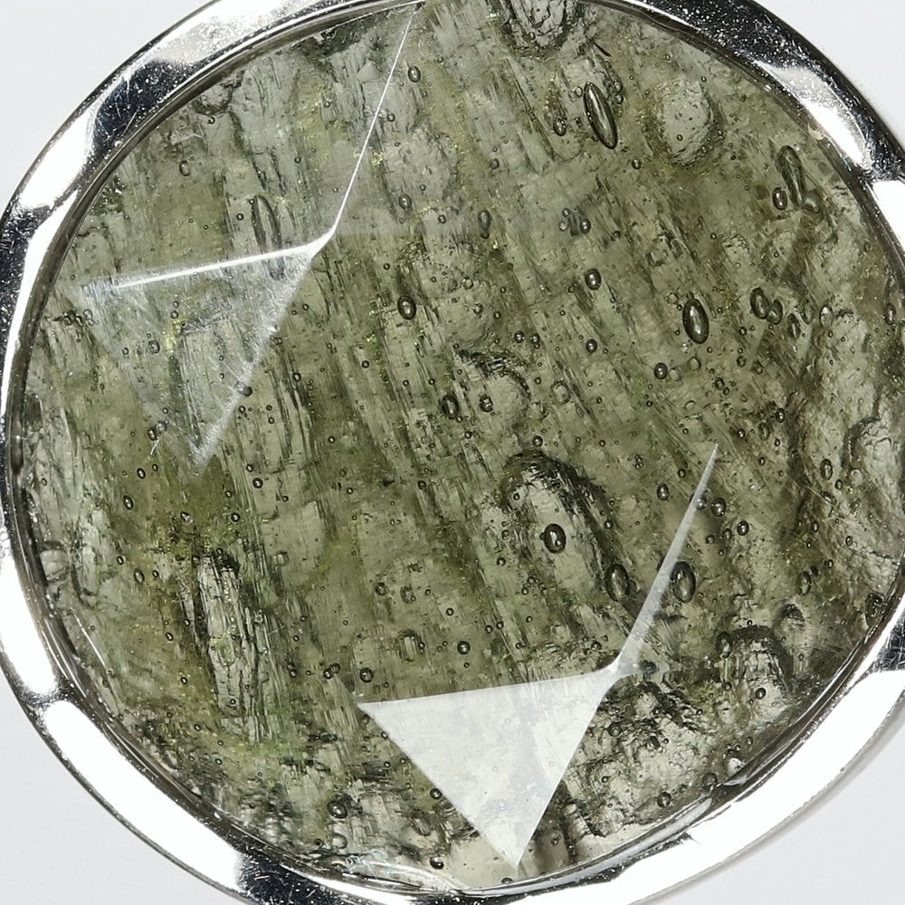 表面は六芒星が浮かび上がるような仕上げとなっており、裏面はモルダバイト独特の形状をそのままにナチュラルな美しさを残しています。透き通るモルダバイトグリーンが本当に美しい逸品です。