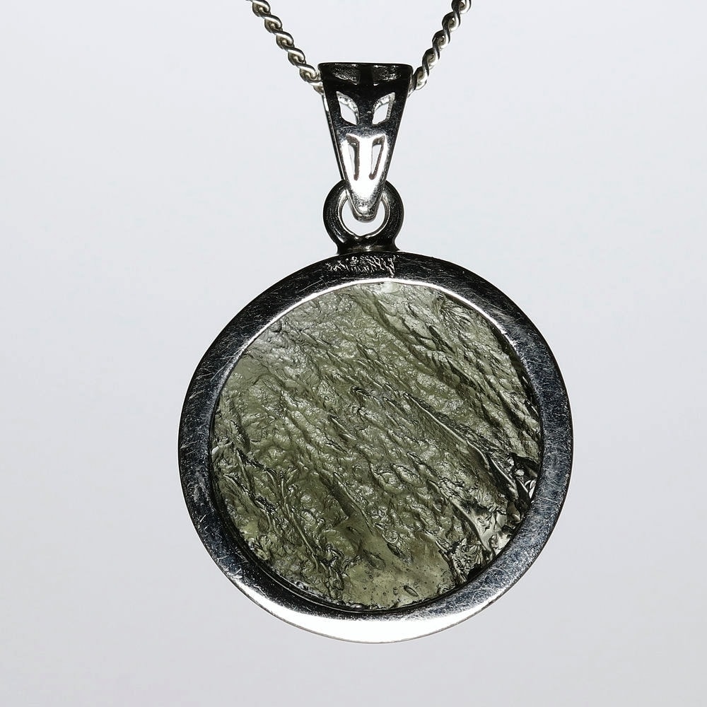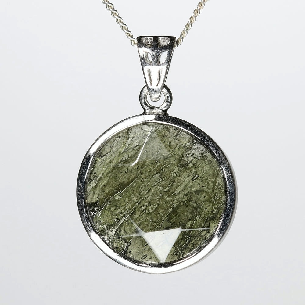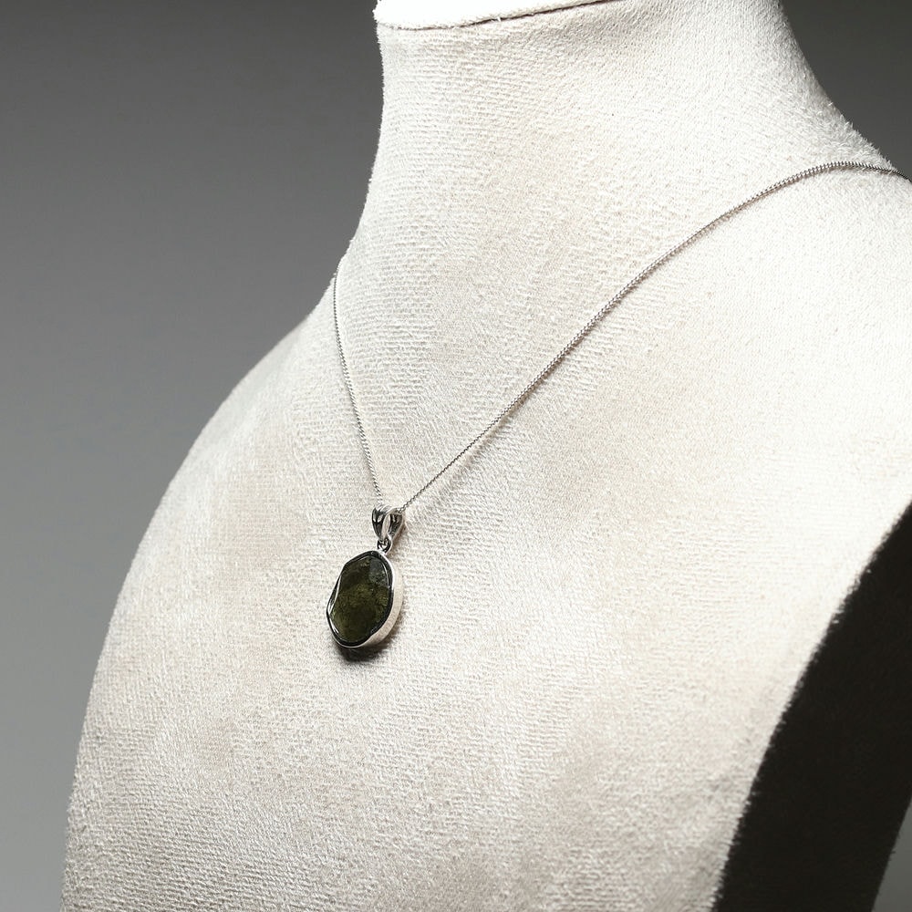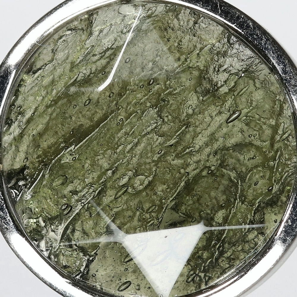 表面は六芒星が浮かび上がるような仕上げとなっており、裏面はモルダバイト独特の形状をそのままにナチュラルな美しさを残しています。透き通るモルダバイトグリーンが本当に美しい逸品です。
