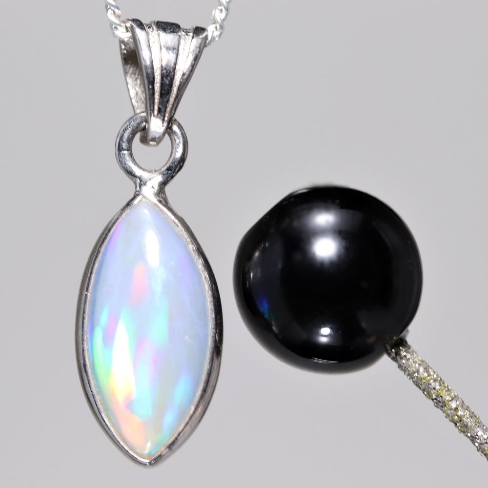 遊色効果が明瞭で色合いが鮮明なものほど高品質とされており、ご覧の天然エチオピアオパールも鮮やかな遊色効果がわかる良質なルースを選別してペンダント作製いたしました。